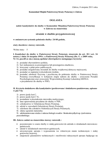 Zabrze, 8 sierpnia 2011 roku Komendant Miejski Państwowej Straży Pożarnej w Zabrzu OGŁASZA nabór kandydatów do służby w Komendzie Miejskiej Państwowej Straży Pożarnej w Zabrzu na stanowiska strażak w służbie przygotowawczej w zmianowym systemie pełnienia służby: 24/48 godzin, etaty docelowe: starszy ratownik. Wolne etaty: 5 I. Kandydaci do służby w Państwowej Straży Pożarnej, stosownie do art. 28 i art. 34 ustawy z dnia 24 sierpnia 1991r. o Państwowej Straży Pożarnej (Dz. U. z 2009 roku, Nr 12, poz.68 ze zm.) muszą spełniać obowiązkowo następujące kryteria: 1) 2) 3) 4) 5) 6) posiadać obywatelstwo polskie, być niekaranym za przestępstwa lub przestępstwa skarbowe, korzystać z pełni praw publicznych, posiadać uregulowany stosunek do służby wojskowej (dotyczy mężczyzn), posiadać co najmniej wykształcenie średnie, posiadać zdolność fizyczną i psychiczną do pełnienia służby w Państwowej Straży Pożarnej (weryfikacja w kolejnym etapie naboru do służby - orzeczenie Poradni Psychologicznej oraz orzeczenie Wojewódzkiej Komisji Lekarskiej MSWiA o przydatności do służby w PSP). II. Kryteria dodatkowe dla kandydatów (preferowane i dodatkowo punktowane, opisano w pkt VI): 1) prawo jazdy kat.C, 2) prawo jazdy kat.C+E, 3) posiadanie wykształcenia ratownika medycznego, 4) inne uprawnienia przydatne do służby w PSP, 5) członkostwo w Ochotniczej Straży Pożarnej, 6) udział w zawodach Ochotniczej Straży Pożarnej, 7) szkolenie dla członków Ochotniczych Straży Pożarnych, 8) zdany egzamin maturalny 9) udokumentowana wiedza z zakresu biologii owadów błonkoskrzydłych np. tytuł mistrza pszczelarskiego. III. Zakres zadań na stanowisku starszy ratownik : · · · · pozostawanie w czasie służby w stałej gotowości do udziału w działaniach ratowniczogaśniczych, udział w działaniach ratowniczo-gaśniczych, utrzymywanie sprzętu i wyposażenia we właściwym stanie technicznym i stałej gotowości bojowej, znajomość parametrów technicznych i możliwości taktycznych sprzętu będącego na · · · IV. wyposażeniu jednostki, udział w szkoleniach i doskonaleniu zawodowym organizowanym w czasie służby, przestrzeganie obowiązujących przepisów, regulaminów i ustalonych zasad w służbie oraz podczas działań ratowniczo-gaśniczych, w tym również w zakresie BHP, podnoszenie kwalifikacji zawodowych i specjalistycznych. Wymagane dokumenty obowiązkowe: 1. Podanie do Komendanta Miejskiego PSP w Zabrzu (druk do pobrania). 2. Ankieta osobowa kandydata/kandydatki (druk do pobrania). 3. Kserokopia dowodu osobistego lub zaświadczenie właściwego organu potwierdzające dane personalne (tożsamość, obywatelstwo i wiek osoby). 4. Oświadczenie o korzystaniu z pełni praw publicznych oraz o niekaralności za przestępstwo lub za przestępstwo skarbowe, zgoda na przetwarzanie danych osobowych, zgoda na publikację danych osobowych na stronie internetowej KM PSP w Zabrzu oraz tablicy ogłoszeń w siedzibie KM PSP w Zabrzu (druk do pobrania). 5. Zaświadczenie lekarskie stwierdzające zdolność kandydata/kandydatki do przystąpienia do próby harwardzkiej, testu sprawności fizycznej oraz testu akrofobii (druk do pobrania). Uwaga! Koszty badań lekarskich i zaświadczenia pokrywa zainteresowany/a. Honorowane będą zaświadczenia wydane przez lekarzy: rodzinnych, internistów, medycyny pracy, profilaktyków. 6. Kserokopia stron książeczki wojskowej, które potwierdzają dane osobowe kandydata oraz informacje o uregulowanym stosunku do służby wojskowej - wpis „przeniesiony do rezerwy", bądź zaświadczenie Wojskowej Komisji Uzupełnień o uregulowanym stosunku do służby wojskowej. 7. Kserokopia dokumentów potwierdzających wykształcenie średnie. V. Wymagane dokumenty dodatkowe : 1. Kserokopia prawa jazdy potwierdzająca posiadanie prawa jazdy kat. C lub kat. C+E. 2. Zaświadczenie z Ochotniczej Straży Pożarnej (druk do pobrania). 3. Kserokopia dokumentów potwierdzających zdanie egzaminu maturalnego. 4. Kserokopie dokumentów potwierdzających posiadane uprawnienia, za które przyznawane są punkty preferencyjne. Uwaga! Dokumenty, przy których znajduje się adnotacja „druk do pobrania" obowiązują wyłącznie w takiej formie. Inna forma druku w przypadku dokumentów obowiązkowych będzie skutkowała odrzuceniem całości dokumentacji kandydata/kandydatki, bez dodatkowych czynności ze strony KM PSP w Zabrzu, w tym wzywania do uzupełnienia braków formalnych, natomiast w przypadku dokumentów dodatkowych nieprzyznaniem punktów gratyfikacyjnych. Podanie oraz inne dokumenty należy wypełnić dokładnie i czytelnie. Druki do pobrania ze strony internetowej www.psp.zabrze.pl Wymagane dokumenty należy składać w zaklejonej kopercie formatu A4 opisanej imieniem i nazwiskiem, z dopiskiem „Nabór do służby w KM PSP w Zabrzu 2011", osobiście w sekretariacie Komendy Miejskiej PSP w Zabrzu, ul. Stalmacha 22 - od poniedziałku do piątku w godzinach od 8.00 do 15.00 w terminie od dnia 08 sierpnia 2011r. do dnia 18 sierpnia 2011 roku, do godz. 15.00. Uwaga! Podania o przyjęcie do służby złożone przed dniem 8 sierpnia 2011r. lub po dniu 18 sierpnia po godz. 15.00 nie będą rozpatrywane. VI. System punktacji gratyfikacyjnej prawo jazdy kat. C 2 pkt prawo jazdy kat. C+E 4 pkt posiadanie wykształcenia co najmniej średniego o kierunku ratownictwo medyczne 3 pkt inne udokumentowane uprawnienia przydatne do służby w PSP (obsługa podestów ruchomych samojezdnych, kurs pilarza, kurs obsługi pił do cięcia stali i betonu, uprawnienia ratownika wodnego, uprawnienia elektryczne do 1 kV,) udokumentowane członkostwo w Ochotniczej Straży Pożarnej minimum 5 lat 2 pkt za każde szkolenie (maksymalnie można uzyskać 6 pkt) udokumentowany udział w Ochotniczej Straży Pożarnej 1 pkt zawodach 1pkt udokumentowane szkolenie dla członków Ochotniczych Straży Pożarnych 1 pkt za każde szkolenie zdany egzamin maturalny 2 pk