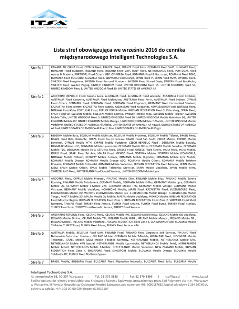 Lista stref obowiązująca we wrześniu 2016 do cennika międzynarodowego Intelligent Technologies S.A. Strefa 1 CANADA All, CHINA Fixed, CYPRUS Fixed, FRANCE Fixed, FRANCE Fixed Paris, GERMANY Fixed VoIP, HUNGARY Fixed, HUNGARY Fixed Budapest, IRELAND Fixed, IRELAND Fixed VoIP, ITALY Fixed, NETHERLANDS Fixed, PORTUGAL Fixed Azores & Madeira, PORTUGAL Fixed Others, REP. OF KOREA Fixed, ROMANIA Fixed & Bucharest, ROMANIA Fixed FOLO, ROMANIA Fixed FOLO ADD, SLOVAKIA Fixed, SLOVAKIA Fixed Orange, SPAIN Fixed IP, SPAIN Fixed M2M, SWEDEN Fixed, SWEDEN Fixed Freephone, SWEDEN Fixed Personal Numbers, SWEDEN Fixed Shared Costs, SWEDEN Fixed Stockholm, SWEDEN Fixed Sweden Paging, UNITED KINGDOM Fixed, UNITED KINGDOM Fixed 55, UNITED KINGDOM Fixed 56, UNITED KINGDOM Fixed 8, UNITED KINGDOM Fixed 80, UNITED STATES OF AMERICA All Strefa 2 ARGENTINE REPUBLIC Fixed Buenos Aires, AUSTRALIA Fixed, AUSTRALIA Fixed Adelaide, AUSTRALIA Fixed Brisbane, AUSTRALIA Fixed Canberra, AUSTRALIA Fixed Melbourne, AUSTRALIA Fixed Perth, AUSTRALIA Fixed Sydney, CYPRUS Fixed Others, DENMARK Fixed, GERMANY Fixed, GERMANY Fixed Corporate, GERMANY Fixed Harmonised Serviced, KAZAKSTAN Fixed Almaty, KAZAKSTAN Fixed Astana, KAZAKSTAN Fixed Karaganda, NEW ZEALAND Fixed, NORWAY Fixed, NORWAY Fixed Oslo, PORTUGAL Fixed, REP. OF KOREA Mobile, RUSSIAN FEDERATION Fixed St Petersburg, SPAIN Fixed, SPAIN Fixed 90, SWEDEN Mobile, SWEDEN Mobile Comviq, SWEDEN Mobile Hi3G, SWEDEN Mobile Telenor, SWEDEN Mobile Telia, UNITED KINGDOM Fixed 3, UNITED KINGDOM Fixed 50, UNITED KINGDOM Mobile Hutchison 3G, UNITED KINGDOM Mobile O2, UNITED KINGDOM Mobile Orange, UNITED KINGDOM Mobile T-Mobile, UNITED KINGDOM Mobile Vodafone, UNITED STATES OF AMERICA All Alaska, UNITED STATES OF AMERICA All Hawaii, UNITED STATES OF AMERICA All Paid, UNITED STATES OF AMERICA All Puerto Rico, UNITED STATES OF AMERICA All Virgin Strefa 3 BELGIUM Mobile Base, BELGIUM Mobile Mobistar, BELGIUM Mobile Proximus, BELGIUM Mobile Telenet, BRAZIL Fixed, BRAZIL Fixed Belo Horizonte, BRAZIL Fixed Rio de Janeiro, BRAZIL Fixed Sao Paulo, CHINA Mobile, CYPRUS Mobile Lemontel, CYPRUS Mobile MTN, CYPRUS Mobile Vodafone, CZECH REPUBLIC Fixed , DENMARK Mobile Barablu, DENMARK Mobile Hi3G, DENMARK Mobile Lycamobile, DENMARK Mobile Other, DENMARK Mobile Sonofon, DENMARK Mobile TDC, DENMARK Mobile Telia, ESTONIA Fixed, GREECE Fixed, GREECE Fixed Athens, INDIA Fixed, INDIA Mobile, ISRAEL Fixed, ISRAEL Fixed Tel Aviv, MALTA Fixed, MEXICO Fixed, NORWAY Mobile, NORWAY Mobile LYCAMOBILE, NORWAY Mobile Netcom, NORWAY Mobile Telenor, ROMANIA Mobile Digimobil, ROMANIA Mobile Lyca Mobile, ROMANIA Mobile Orange, ROMANIA Mobile Orange ADD, ROMANIA Mobile Others, ROMANIA Mobile Telekom Romania, ROMANIA Mobile Telemobil, ROMANIA Mobile Vodafone, RUSSIAN FEDERATION Fixed Moscow, SPAIN Mobile M2M, SPAIN Mobile Others, SPAIN Mobile Telefonica Movistar, SPAIN Mobile Vodafone, SPAIN Mobile Xfera, SWITZERLAND Fixed, SWITZERLAND Fixed Special Services, UNITED KINGDOM Mobile Lyca Strefa 4 ANDORRA Fixed, CYPRUS Mobile Primetel, FINLAND Mobile DNA, FINLAND Mobile Elisa, FINLAND Mobile Sonera Roaming, FINLAND Mobile TeliaSonera, GERMANY Mobile, GERMANY Mobile E-Plus, GERMANY Mobile Lyca, GERMANY Mobile O2, GERMANY Mobile T-Mobile VAS, GERMANY Mobile TRU, GERMANY Mobile Vintage, GERMANY Mobile Vistream, GERMANY Mobile Vodafone, HONGKONG Mobile, JAPAN Fixed, KAZAKSTAN Fixed, LUXEMBOURG Fixed, LUXEMBOURG Mobile Join Wireless, LUXEMBOURG Mobile Lux , LUXEMBOURG Mobile Orange , LUXEMBOURG Mobile Tango , MALTA Mobile 3G, MALTA Mobile Go Mobile, MALTA Mobile Vodafone, MEXICO Mobile, RUSSIAN FEDERATION Fixed Moscow Region, RUSSIAN FEDERATION Fixed Zone 1, RUSSIAN FEDERATION Fixed Zone 2, SLOVAKIA Fixed Short Numbers, TAIWAN Fixed, TURKEY Fixed Ankara, TURKEY Fixed Antalya, TURKEY Fixed Bursa, TURKEY Fixed Istanbul, TURKEY Fixed Izmir, TURKEY Fixed Nomadic Service, TURKEY Fixed Samsun Strefa 5 ARGENTINE REPUBLIC Fixed, ICELAND Fixed, ICELAND Mobile IMC, ICELAND Mobile Nova, ICELAND Mobile OG Vodafone, ICELAND Mobile Siminn, ICELAND Mobile TAL, IRELAND Mobile Hi3G , IRELAND Mobile Meteor , IRELAND Mobile O2 , IRELAND Mobile , IRELAND Mobile Vodafone , RUSSIAN FEDERATION Fixed Zone 3, SAN MARINO Fixed, SLOVAKIA Mobile T-Mobile, TURKEY Fixed, TURKEY Fixed Adana, TURKEY Fixed Services 444 Strefa 6 AUSTRALIA Mobile, BELGIUM Fixed UAN, FINLAND Fixed, FINLAND Fixed Corporate and Services, FINLAND Fixed Nationwide Subscriber Numbers, FINLAND Mobile, GERMANY Mobile T-Mobile, GIBRALTAR Fixed, INDONESIA Mobile Telkomsel, ISRAEL Mobile, M2M Mobile T-Mobile Germany, NETHERLANDS Mobile, NETHERLANDS Mobile KPN, NETHERLANDS Mobile KPN Special, NETHERLANDS Mobile Lycamobile, NETHERLANDS Mobile Tele2, NETHERLANDS Mobile Telfort, NETHERLANDS Mobile T-Mobile, NETHERLANDS Mobile Vodafone, NEW ZEALAND Mobile, RUSSIAN FEDERATION Fixed Zone 4, SINGAPORE Fixed, SINGAPORE Mobile, SLOVAKIA Mobile Orange, SLOVAKIA Mobile Telefonica O2, TURKEY Fixed Northern Cyprus Strefa 7 BRAZIL Mobile, BULGARIA Fixed, BULGARIA Fixed Alternative Networks, BULGARIA Fixed Sofia, BULGARIA Mobile Intelligent Technologies S.A. Al. Jerozolimskie 98, 00-807 Warszawa | Tel. 22 379 8888 | Fax 22 379 8899 | [email protected] | www.itsa.pl Spółka wpisana do rejestru przedsiębiorców Krajowego Rejestru Sądowego, prowadzonego przez Sąd Rejonowy dla m.st. Warszawy w Warszawie, XII Wydział Gospodarczy Krajowego Rejestru Sądowego, pod numerem KRS: 0000187832, kapitał zakładowy 1 234 567,00 zł, pokryty w całości, NIP: 108-00-00-059, Regon: 015619104 Mobilkom, CZECH REPUBLIC Mobile MobilKom, CZECH REPUBLIC Mobile Telefonica O2, CZECH REPUBLIC Mobile TMobile, CZECH REPUBLIC Mobile TRAVEL TELEKOM, CZECH REPUBLIC Mobile Vodafone, FRANCE Mobile, FRANCE Mobile Bouygues, FRANCE Mobile Bouygues 3365, FRANCE Mobile FREE, FRANCE Mobile Orange, FRANCE Mobile Orange 3365, FRANCE Mobile SFR, FRANCE Mobile SFR 3365, GREECE Mobile Cosmote, GREECE Mobile Vodafone, GREECE Mobile WI
