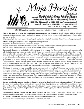 nr 31/2016 (435) 25 IX 2016 XXVI Niedziela zwykła: (Am 6, 1a. 4-7; Ps 146; 1 Tm 6, 11-16; Łk 16, 19-31) I Mocny i trudny fragment Ewangelii daje nam Jezus na ten dzisiejszy dzień. Można sobie wyobrazić sytuację, że fragment ten słyszy ktoś dobrze radzący sobie w życiu, zamożny, ale niewierzący. Co przychodzi mu na myśl: Cóż to za Bóg? Czy mam szansę dostać się do nieba, skoro trafiają tam tylko biedni i poobijani przez życie? Można by tu przywoływać i inne fragmenty ewangeliczne: bogatemu trudno jest wejść do Królestwa Bożego…, bogaty młodzieniec, który ma wiele posiadłości, pytający, co ma uczynić, aby osiągnąć życie wieczne, i wiele innych fragmentów gdzie Jezus odnosi się do tematu bogactwa. Posiadanie bogactwa, posiadłości zdobytych na tym świecie (na które człowiek uczciwie zapracował), nie jest niczym złym. Jezus, używając takich obrazów w swoich przypowieściach, nie tyle krytykuje bogactwo, możliwość posiadania dóbr tego świata, ale wskazuje raczej, co dzieje się z człowiekiem, który źle nimi dysponuje i rozporządza. Świadomość posiadanych dóbr, świadomość swojej zamożności i związanej z tym niezależności od innych ludzi może z człowieka uczynić stworzenie nastawione tylko i wyłącznie na posiadanie i to coraz więcej i więcej. Ale to nie wszystko. Może również z człowieka uczynić „nie-człowieka”, który nikogo oprócz siebie i tego, co posiada, nie będzie widział. Drugi człowiek nie będzie miał dla niego większej wartości..., no chyba, że będzie postrzegany jako „okazja” do tego, by na nim jeszcze więcej zyskać, dorobić się, ewentualnie pokazać się…, niech podziwiają. Czytając te słowa, pewnie pomyślisz sobie: Ale ma gość wyobraźnię! Owszem, ale popatrz na świat, w którym żyjemy i Ty i ja, ludzie XXI wieku. Wydaje się, że przyszło nam żyć w czasach dostatku i niesamowitych możliwości. Świat tak bardzo kolorowy, prawie że idealny, bo tak jest przedstawiany przez specjalistów od marketingu i sprzedaży. Zadaj sobie pytanie: jaką wartość posiadasz dziś jako człowiek, jako osoba? Nie patrz na siebie przez pryzmat tego, jakie masz wykształcenie, ile posiadasz, do czego w swoim życiu doszedłeś. Ale spójrz na siebie przez pryzmat czegoś bardziej podstawowego – wartości, jaką jest osoba ludzka… Jezus, przyjmując postać ludzką, wchodzi w ten świat bardzo niepostrzeżenie, „ubogo”. Dlaczego? Z jednej strony, aby pokazać bliskość człowiekowi, ale z drugiej strony, aby podkreślić wartość człowieka jako osoby. Aby podkreślić, że w Jego oczach każdy jest ważny i każdy ma swoją wartość. A idąc do ubogich zwraca oczy bogatych na prawdziwe bogactwo i wartość, jaką ma właśnie człowiek – nie rzecz, ale osoba ludzka. Scena sprzed dwóch tysięcy lat, ale jakże aktualna na dziś. Zejdź z „wygodnej kanapy życia”, wyjdź na ulice swojej miejscowości, a zobaczysz i zrozumiesz, o czym Jezus dziś mówi i do mnie i do ciebie. o. Ludwik Łabuda CSsR, Misjonarz Prowincji Warszawskiej Redemptorystów – Lubaszowa http://www.slowo.redemptor.pl/pl/1278/8190/xxvi-niedziela-zwykla.html MOJA PARAFIA nr 31/2016 (435) - 1 - 1. 2. 3. Przemówienie programowe sekretarza generalnego I sde (lineamenta) ks. dr. hab. Stefana Ewertowskiego prof. UWM Komisja przygotowawcza - aula WSD Elbląg – 1 lipca 2016 (część III) I SYNOD DIECEZJI ELBLĄSKIEJ DOJRZALI W WIERZE I ŻYCIU 1. CEL SYNODU DIECEZJALNEGO Czemu trzeba się bezwzględnie sprzeciwić? Mówiąc językiem papieża Franciszka, w działalności, w posłudze, konieczne i pożądane jest duszpasterskie towarzyszenie, albowiem na nowo i niezwykle wyraźnie Kościół objawia się jako "różnorodność w jedności". A św. Paweł powie i nam: "Różne są dary łaski (charyzmaty) lecz ten sam Duch; różne są rodzaje posługiwania, ale jeden Pan; różne są wreszcie działania, lecz ten sam Bóg, sprawca wszystkiego we wszystkich. Wszystkim zaś objawia się Duch dla wspólnego dobra" (1 Kor 12, 4-8). Celem synodu diecezjalnego jest taki stopień rozeznania już zdobytego eklezjalnego doświadczenia, taki poziom refleksji teologicznej w kontekście współczesnych uwarunkowań życia i ustalenia wspólnotowego prawa, by jeszcze bardziej pogłębić osobowe więzi z Bogiem i ludźmi. Według zamiaru Biskupa Elbląskiego, chodzi o: "zdynamizowanie życia religijnego w parafiach, rodzinach i stowarzyszeniach naszej diecezji" (GN 10.04.2016). Nie jest naszą rolą osąd i nie chcemy być sędziami, chodzi o inspiracje, o wskazanie drogi pogłębiającej "dojrzałość wiary i życia". "Będziesz miłował Pana Boga swego całym swoim sercem, całą swoją duszą i całym swoim umysłem. To jest największe i pierwsze przykazanie. Drugie podobne jest do niego: Będziesz miłował swego bliźniego jak siebie samego. Na tych dwóch przykazaniach opiera się całe Prawo i Prorocy".(Mt 22, 34-40). W drodze do dojrzałości chrześcijańskiej, należy pytać: co poprawić w wychowaniu i formacji chrześcijańskiej? "Nowy człowiek", to człowiek uformowany przez Jezusa Chrystusa, to człowiek dojrzały w wierze i życiu. To uczeń, który staje się "przyjacielem" Zbawiciela. "Już was nie nazywam sługami, bo sługa nie wie, co czyni jego pan, ale nazwałem was przyjaciółmi, albowiem oznajmiłem wam wszystko, co usłyszałem od Ojca mego. Nie wyście Mnie wybrali, ale Ja was wybrałem i przeznaczyłem was na to, abyście szli i owoc przynosili, i by owoc wasz trwał – aby Ojciec dał wam [wszystko], o cokolwiek Go poprosicie w imię moje. To wam przykazuję, abyście się wzajemnie miłowali" (J, 15, 15 - 17). W ten sposób Jezus Chrystus wyznacza drogę dojrzałości wiary i życia. Umacnia i daje stosowne środki przez życie w Kościele (communio personarum), pomaga przez praktykę sakramentalną, która kształtuje dojrzałych ludzi do życia we wspólnocie wszystkich ludzi