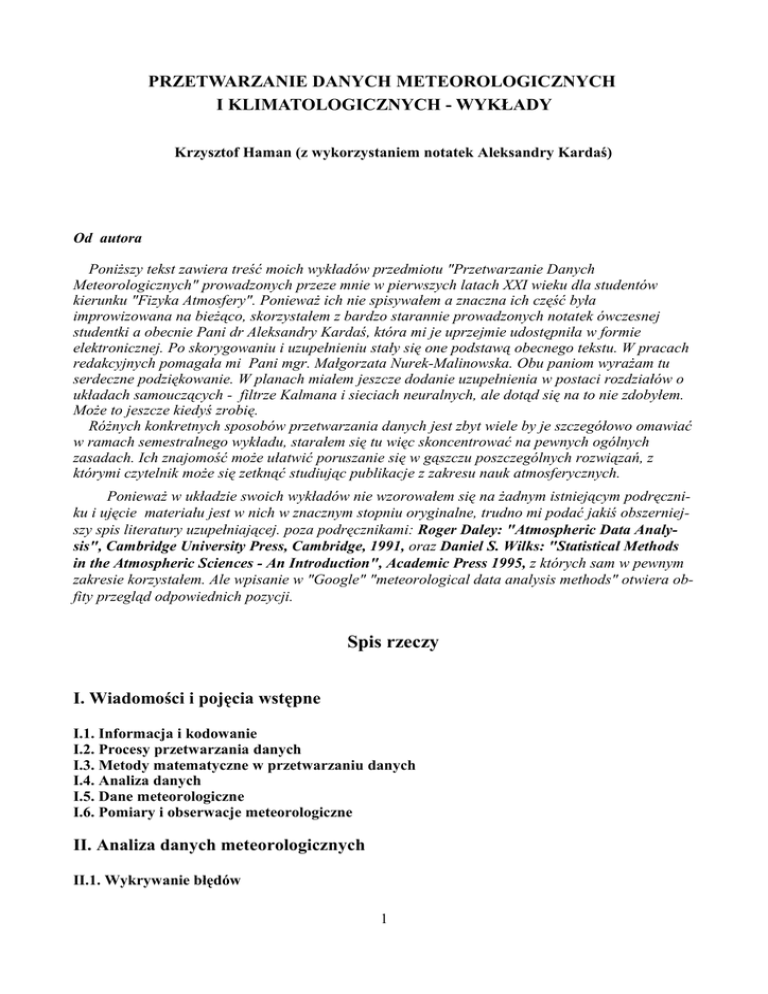PRZETWARZANIE DANYCH METEOROLOGICZNYCH I KLIMATOLOGICZNYCH - WYKŁADY Krzysztof Haman (z wykorzystaniem notatek Aleksandry Kardaś) Od autora Poniższy tekst zawiera treść moich wykładów przedmiotu "Przetwarzanie Danych Meteorologicznych" prowadzonych przeze mnie w pierwszych latach XXI wieku dla studentów kierunku "Fizyka Atmosfery". Ponieważ ich nie spisywałem a znaczna ich część była improwizowana na bieżąco, skorzystałem z bardzo starannie prowadzonych notatek ówczesnej studentki a obecnie Pani dr Aleksandry Kardaś, która mi je uprzejmie udostępniła w formie elektronicznej. Po skorygowaniu i uzupełnieniu stały się one podstawą obecnego tekstu. W pracach redakcyjnych pomagała mi Pani mgr. Małgorzata Nurek-Malinowska. Obu paniom wyrażam tu serdeczne podziękowanie. W planach miałem jeszcze dodanie uzupełnienia w postaci rozdziałów o układach samouczących - filtrze Kalmana i sieciach neuralnych, ale dotąd się na to nie zdobyłem. Może to jeszcze kiedyś zrobię. Różnych konkretnych sposobów przetwarzania danych jest zbyt wiele by je szczegółowo omawiać w ramach semestralnego wykładu, starałem się tu więc skoncentrować na pewnych ogólnych zasadach. Ich znajomość może ułatwić poruszanie się w gąszczu poszczególnych rozwiązań, z którymi czytelnik może się zetknąć studiując publikacje z zakresu nauk atmosferycznych. Ponieważ w układzie swoich wykładów nie wzorowałem się na żadnym istniejącym podręczni ku i ujęcie materiału jest w nich w znacznym stopniu oryginalne, trudno mi podać jakiś obszerniej szy spis literatury uzupełniającej. poza podręcznikami: Roger Daley: "Atmospheric Data Analy sis", Cambridge University Press, Cambridge, 1991, oraz Daniel S. Wilks: "Statistical Methods in the Atmospheric Sciences - An Introduction", Academic Press 1995, z których sam w pewnym zakresie korzystałem. Ale wpisanie w "Google" "meteorological data analysis methods" otwiera ob fity przegląd odpowiednich pozycji. Spis rzeczy I. Wiadomości i pojęcia wstępne I.1. Informacja i kodowanie I.2. Procesy przetwarzania danych I.3. Metody matematyczne w przetwarzaniu danych I.4. Analiza danych I.5. Dane meteorologiczne I.6. Pomiary i obserwacje meteorologiczne II. Analiza danych meteorologicznych II.1. Wykrywanie błędów 1 II.2. Metody korekcji błędów II.3. Interpolacja – pojęcie i cele II.4. Ogólny schemat procedur interpolacji II.5. Określoność zagadnienia interpolacji II.6. Kryteria dobroci interpolacji II.6.1. Kryteria kolokacyjne II.6.2. Kryteria wariacyjne II.6.3. Kryteria statystyczne II.6.4. Uzgadnianie pól II.7. Przykłady szczególnych technik interpolacji II.7.1. Metody interpolacji oparte na kryterium kolokacyjnym II.7.2. Metoda najmniejszych kwadratów II.7.3. Interpolacje funkcji wektorowych II.7.4. Metody kolejnych przybliżeń (iteracyjne) II.8. Filtracja II.9. Przykłady filtrów II.9.1. Filtracja podczas pomiaru II.9.2. Matematyczne procedury filtracji. II.9.3. Ogólna postać operatora filtracji liniowej II.9.4. Filtr jednorodny II.9.5. Filtrowanie przestrzenne II.9.6. Obcinanie rozwinięć na szeregi III. Metody statystyczne w przetwarzaniu danych III.1. Podstawowe koncepcje teorii prawdopodobieństwa III.1.1 Pojęcie prawdopodobieństwa III.1.2 Prawdopodobieństwo jako pojęcie matematyczne III.1.3. Zmienna losowa III.1.4. Zmienne losowe wielowymiarowe III.1.5. Rozkłady warunkowe i brzegowe III.1.6. Zmienne losowe zależne i niezależne III.1.7. Histogram, wygładzanie gęstości prawdopodobieństwa III.2. Charakterystyki rozkładów. III.2.1. Charakterystyki rozkładów inne niż dystrybuanta i pdf III.2.2. Uśrednianie statystyczne III.2.3. Momenty III.2.4. Kwantyle III.2.5. Uśrednianie zmiennych wielowymiarowych, III.2.6. Momenty zmiennych wielowymiarowych III.2.7. Korelacja, przestrzeń pseudohilbertowska III.3. Regresja III.3.1. Pojęcie regresji III.3.2. Regresja liniowa dla dwóch zmiennych III.3.3. Regresja dla wielu zmiennych IV. Elementy teorii procesów i pól stochastycznych IV.1. Proces stochastyczny – definicje i interpretacje IV.2 Charakterystyki rozkładów prawdopodobieństwa dla procesów losowych IV.2.1. Uśrednianie IV.2.2. Funkcje korelacyjne 2 IV.2.3. Funkcje strukturalne IV.3. Reprezentacja procesu losowego w postaci szeregu IV.3.1. Rozwinięcie procesu w szereg IV.3.2. Rozwinięcie kanoniczne IV.3.3. Posługiwanie się rozwinięciem kanonicznym. IV.4. Szumy IV.5. Procesy stacjonarne (jednorodne) IV.5.1. Proces stacjonarny IV.5.2. Procesy ergodyczne IV.5.3. Transformata Fouriera jako kanoniczne rozwinięcie procesu stacjonarnego IV.5.4. Analiza fourierowska procesu stacjonarnego IV.6. Procesy niestacjonarne IV.7. Pola losowe V. Analiza falkowa i fraktalna V.1. Analiza falkowa V.1.1. Falki V.1.2. Przykłady falek V.2. Analiza fraktalna V.2.1. Fraktale i wymiar fraktalny V.2.2. Analiza fraktalna obiektów naturalnych V.2.3. Inne warianty wymiaru fraktalnego I. Wiadomości i pojęcia wstępne I.1. Informacja i kodowanie Informacja jest to „coś” co pozwala rozróżniać obiekty lub cechy obiektów i jest przekazywalne innym osobom (obiektom). Najprostszym rozróżnieniem (jednostką informacji) jest rozróżnienie między dwoma obiektami lub cechami. Taka informacja nosi nazwę bit informacji. Do przekazywania informacji w formie zapisu potrzebne jest narzędzie – kod umożliwiający zapis za pomocą umownych symboli - znaków. Najprostszymi kodami operującymi tylko dwoma symbolami są kody binarne ( np. zero-jedynkowe) w których każdy znak niesie jeden bit informacji. Wszystkie bardziej skomplikowane kody można na nie przetłumaczyć. Zapis dokonywany jest zawsze na pewnym nośniku, którym może być tradycyjny papier ale także światło, dźwięk, taśma magnetyczna lub inny obiekt materialny czy zjawisko fizyczne. W zbiorze kodów istnieje szczególna klasa kodów, wymagających minimalnej liczby bitów do zapisania danej informacji. Na ogół informacja zak