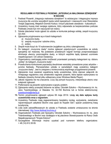 REGULAMIN VI FESTIWALU PIOSENKI „INTEGRACJA MALOWANA DŹWIĘKIEM” W BOCHNI 1. Festiwal Piosenki „Integracja malowana dźwiękiem" to edukacyjna i integracyjna impreza muzyczna dla uczniów wszystkich typów szkół (specjalnych i masowych) oraz Warsztatów Terapii Zajęciowej, Miejskich Domów Kultury i innych placówek oświatowo - kulturalnych. 2. Uczestnicy muszą mieć swojego opiekuna, który odpowiada za bezpieczeństwo podczas Festiwalu (może być nim nauczyciel lub rodzic). 3. Szkoła /placówka/ może zgłosić do udziału w konkursie jednego solistę, zespół muzyczny lub chór. 4. Zgłoszenia przyjmowane są w trzech kategoriach: a) muzyczne duety, b) zespoły muzyczne i szkolne chóry, c) soliści. 5. Zespół może liczyć do 10 wykonawców (wyjątkiem są chóry czterogłosowe). 6. Do kategorii „muzyczne duety” można zgłaszać pojedynczych uczestników ze szkoły specjalnej lub masowej. Na podstawie przesłanych nagrań komisja przeprowadzająca eliminacje utworzy poszczególne duety, w których wspólnie będą śpiewać uczniowie niepełnosprawni i ich zdrowi rówieśnicy. 7. Organizatorzy zastrzegają sobie możliwość przeniesień pomiędzy kategoriami np. doboru „solisty” do kategorii „muzyczne duety”. 8. Przesłuchania konkursowe poprzedzą dwudniowe warsztaty prowadzone przez artystów – jurorów festiwalu. Pierwszeństwo udziału w warsztatach mają uczestnicy kategorii „muzyczne duety”. Jest to związane z koniecznością wspólnego przygotowania piosenki. 9. Zgłoszenie musi zawierać wypełnioną kartę uczestnictwa, która stanowi załącznik do niniejszego regulaminu oraz amatorskie nagranie piosenki, która będzie wykonywana na festiwalu (dowolny format pliku odtwarzany przez Windows Media Player). 10. Jakość nagrania nie ma znaczenia. Liczy się pomysł muzyczny, interpretacja utworu oraz kolejność zgłoszeń. 11. Preferowane są piosenki wykonywane w języku polskim. 12. Zgłoszenia należy przesyłać listownie na adres: Ośrodek Szkolno – Wychowawczy im. ks. Jana Twardowskiego, ul Stasiaka 1A, 32-700 Bochnia lub w formie elektronicznej: [email protected]. 13. Termin przyjmowania zgłoszeń upływa 06 maja 2013r. Liczy się data wpływu karty uczestnictwa wraz z nagraniem. 14. Uczestnicy Festiwalu mają zagwarantowany bezpłatny nocleg, wyżywienie, zwiedzanie najcenniejszych zabytków Bochni oraz zjazd do Kopalni Soli i spacer podziemną trasą turystyczną. 15. Lista osób zakwalifikowanych do udziału w Festiwalu zostanie umieszczona na stronie internetowej: http://www.festiwal.bochnia.pl 16. Organizatorem Festiwalu jest Specjalny Ośrodek Szkolno – Wychowawczy im. ks. Jana Twardowskiego w Bochni oraz działające w tej placówce Stowarzyszenie na Rzecz Osób Niepełnosprawnych "Kropla Dobroci". 17. Szczegółowe informacje można uzyskać pod numerem telefonu organizatora: + 48 (14) 612 26 65.