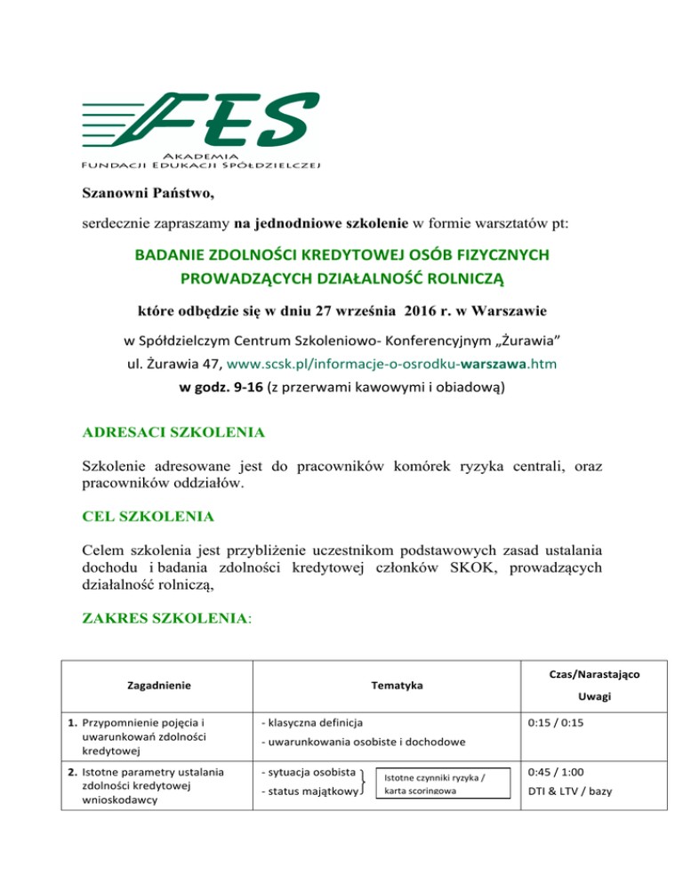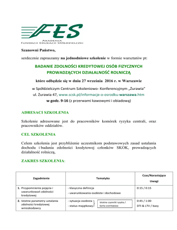 Szanowni Państwo, serdecznie zapraszamy na jednodniowe szkolenie w formie warsztatów pt: BADANIEZDOLNOŚCIKREDYTOWEJOSÓBFIZYCZNYCH PROWADZĄCYCHDZIAŁALNOŚĆROLNICZĄ które odbędzie się w dniu 27 września 2016 r. w Warszawie wSpółdzielczymCentrumSzkoleniowo-Konferencyjnym„Żurawia” ul.Żurawia47,www.scsk.pl/informacje-o-osrodku-warszawa.htm wgodz.9-16(zprzerwamikawowymiiobiadową) ADRESACI SZKOLENIA Szkolenie adresowane jest do pracowników komórek ryzyka centrali, oraz pracowników oddziałów. CEL SZKOLENIA Celem szkolenia jest przybliżenie uczestnikom podstawowych zasad ustalania dochodu i badania zdolności kredytowej członków SKOK, prowadzących działalność rolniczą, ZAKRES SZKOLENIA: Zagadnienie Tematyka 1. Przypomnieniepojęciai uwarunkowańzdolności kredytowej -klasycznadefinicja 2. Istotneparametryustalania zdolnościkredytowej wnioskodawcy -sytuacjaosobista Czas/Narastająco Uwagi 0:15/0:15 -uwarunkowaniaosobisteidochodowe -statusmajątkowy Istotneczynnikiryzyka/ kartascoringowa 0:45/1:00 DTI<V/bazy -zadłużenie -kosztyutrzymania -źródłodochodu 3. Definicjarolnikaifinansowanie działalnościrolniczejwSKOK czynnikidochodudo dyspozycji -definicjerolnikaigospodarstwarolnegow różnychaktachprawnych (rejestry)długówiich wykorzystanie Specyfikawyceny majątkurolniczego 0:15/1:15 -specyfikaprowadzeniegospodarstwarolnego -członkostwoSKOKafinansowaniedziałalności rolniczej 4. Dokumentypotwierdzające posiadanieźródładochodu– prowadzeniedziałalności rolniczej -zaświadczenieoposiadaniugospodarstwa rolnego, 0:15/1:30 -nakazpodatkowypodatkurolnego, -REGON(możewystępować), -NIP(możewystępować), -omówieniezgodnościdanych, 5. Dokumentacjakredytobiorców jakoźródłodanychdoustalenia zdolnościkredytowej -nakazpodatkowy(zawartośćinformacyjna) 0:30/2:00 -zaświadczenieoposiadaniugospodarstwa rolnego(zawartośćinformacyjna) syntetycznainformacjao obowiązkach dokumentacyjnych -umowydzierżawy(ANR,prywatna rejestrowana,prywatnanierejestrowana) -dopłatyunijne -faktury 6. Stałeobciążeniarolnika– składkiKRUSspołecznei zdrowotnalubskładkiZUS; zaliczkinapodatekrolny -wysokośćskładek,sposóbustalania,źródła 7. Stałeobciążeniarolnika– kredytynadziałalnośćrolniczą -bankikomercyjne 0:30/3:00 -bankispółdzielcze -BGŻ(BNPParibas) Źródłainformacjiiich wykorzystanie -szacowanyzpowierzchnigospodarstwa 1:00/5:00 8. Algorytmyobliczaniadochodu rolniczego 0:30/2:30 -zawartośćinformacyjnawymiaruskładkiKRUS -wpływnawysokośćdochoduizdolność kredytową -szacowanyzfaktur -zdopłatunijnych 9. Obliczaniezdolnościkredytowej -obliczonydochód -zobowiązaniakredytowe(BIK,oświadczone) -zobowiązaniapozakredytowe(alimentyiin) 0:30/5:30 PROWADZACY - WYKŁADOWCA MarekSTACHURA-ekonomistazwieloletnimdoświadczeniemwbiznesiei bankowości;od9latwKasieStefczykajakoRegionalny AnalitykKredytowyianalitykkredytowycentrali,obecnie StarszySpecjalistads.analizykredytówgospodarczych; trenerbiznesu,autorrozwiązańiszkoleńzzakresuanalizy kredytowej. ZGŁOSZENIA Koszt szkolenia 800 zł brutto dla dwóch osób z każdej kasy, obejmuje jednodniowe szkolenie w tym: lunch, serwis konferencyjny oraz materiały szkoleniowe.Kosztjednejosobyzkasyto500złbrutto. Zgłoszenia proszę przesyłać (na podpisanym formularzu zgłoszeniowym) na [email protected] Wraziedodatkowychpytańproszęokontaktzp.MonikąTarnowską tel.kom:695452102 Serdecznie zapraszam, Janusz Ossowski, Dyrektor Fundacji Edukacji Spółdzielczej