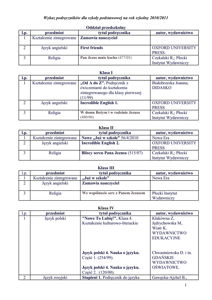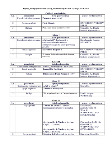 Wykaz podręczników dla szkoły podstawowej na rok szkolny 2010/2011 l.p. 1 Oddział przedszkolny przedmiot tytuł podręcznika Kształcenie zintegrowane Zamawia nauczyciel 2 Język angielski 3 Religia l.p. 1 2 3 First friends Pan Jezus mnie kocha (477/03) Klasa I przedmiot tytuł podręcznika Kształcenie zintegrowane „Od A do Z”. Podręcznik z ćwiczeniami do kształcenia zintegrowanego dla klasy pierwszej (11/99) Język angielski Incredible English 1. Religia l.p. 1 2 przedmiot Kształcenie zintegrowane Język angielski 3 Religia l.p. 1 2 przedmiot Kształcenie zintegrowane Język angielski 3 Religia l.p. 1 przedmiot Język polski W domu Bożym i w rodzinie Jezusa (480/06) Klasa II tytuł podręcznika Nowe „Już w szkole” 56/4/2010 Incredible English 2. Bliscy sercu Pana Jezusa (515/07) Klasa III tytuł podręcznika „Już w szkole” Zamawia nauczyciel We wspólnocie serc z Panem Jezusem Klasa IV tytuł podręcznika "Nowe To Lubię!". Klasa 4. Kształcenie kulturowo-literackie Język polski 4. Nauka o języku. Część 1. (254/99). 2 Język rosyjski Język polski 4. Nauka o języku. Część 2. (120/00). Stupieni 1. Podręcznik do języka autor, wydawnictwo OXFORD UNIVERSITY PRESS. Czekalski R,; Płocki Instytut Wydawniczy autor, wydawnictwo Białobrzeska Joanna; DIDASKO OXFORD UNIVERSITY PRESS Czekalski R,; Płocki Instytut Wydawniczy autor, wydawnictwo Nowa Era OXFORD UNIVERSITY PRESS Czekalski R,; Płocki Instytut Wydawniczy autor, wydawnictwo Nowa Era Płocki Instytut Wydawniczy autor, wydawnictwo Kłakówna Z, Jędrychowska M, Wiatr K. WYDAWNICTWO EDUKACYJNE Chwastniewska D. i in. GDAŃSKIE WYDAWNICTWO OŚWIATOWE. Gawęcka-Ajchel B., 1 rosyjskiego dla klasy IV szkoły podstawowej. (188/05). Winners 1 Plus. Zamawia nauczyciel Netz 1. Podręcznik do języka niemieckiego dla klasy IV. (238/03). 3 Język angielski 4 Język niemiecki 5 Matematyka 6 Przyroda Przyroda dla klasy IV. (73/99). Historia Historia i społeczeństwo. Człowiek i jego cywilizacja. Dzień dobry historio. Podręcznik wraz z zeszytem ćwiczeń (115/99). Malowane muzyką. Muzyka 4. (183/99) Odkrywamy tajemnice sztuki. Plastyka dla klasy IV. (60/01). Muzyka Plastyka Informatyka Religia l.p. 1 przedmiot Język polski 2 Język rosyjski 3 Język angielski Matematyka 4. Podręcznik wraz z zeszytami ćwiczeń dla klasy IV, część 1-3. (138/08). Komputerowe opowieści. Podręcznik dla klas IV-VI szkoły podstawowej. (171/05). Zaproszeni przez Boga. Drogi przymierza. (647/02) Klasa V tytuł podręcznika „Nowe To Lubię!". Kształcenie kulturowo - literackie. Klasa 5 (154/07). Język polski 5. Nauka o języku. Część 1. Język polski 5. Nauka o języku. Część 2. Zeszyt ćwiczeń do ortografii (zamawia nauczyciel) Stupieni 2. Podręcznik do języka rosyjskiego dla klasy V szkoły podstawowej. (27/07). Winners 2 Plus 4 Język niemiecki Zamawia nauczyciel Netz 2. Podręcznik do języka niemieckiego dla klasy V. (212/04). 5 Matematyka Matematyka 5. Podręcznik wraz z Żelezik A. WSiP S.A.. OXFORD UNIVERSITY PRESS. Betleja J., Wieruszewska D., Grüttner D. WYD.SZKOLNE PWN. Dobrowolska M. GDAŃSKIE WYDAWNICTWO OŚWIATOWE. Marko-Worłowska M., Szlajfer F. NOWA ERA. Szeweluk-Wyrwa B., Surdyk-Fertsch W. ARKA. Piątek P. ARKA Jędrzejczak B, Szpingier M. ARKA. Gulgowski M., Lipski J. CZARNY KRUK. Marek Z. Wydawnictwo Apostolstwa Modlitwy autor, wydawnictwo Kłakówna Z, Jędrychowska M, Wiatr K. WYDAWNICTWO EDUKACYJNE Chwastniewska D. i in. GDAŃSKIE WYDAWNICTWO OŚWIATOWE. Gawęcka-Ajchel B., Żelezik A. WSiP S.A.. OXFORD UNIVERSITY PRESS. Betleja J., Wieruszewska D., Grüttner D. WYD.SZKOLNE PWN. Dobrowolska M. 2 zeszytami ćwiczeń dla klasy V, część 1-3. (61/2/09/S). 6 Przyroda Przyroda dla klasy V. (225/00). Historia Historia i społeczeństwo 5. Człowiek i jego cywilizacja. Podręcznik wraz z zeszytem ćwiczeń (298/99). Malowane muzyką. Muzyka 5. (169/00) Plastyka 5. Czuję więc tworzę. (309/00). Muzyka Plastyka Informatyka Technika Wychowanie do życia w rodzinie Religia l.p. 1 przedmiot Język polski 2 Język rosyjski 3 Język angielski 4 Język niemiecki 5 Matematyka Komputerowe opowieści. Podręcznik dla klas IV-VI szkoły podstawowej. (171/05). Zamawia nauczyciel Wędrując ku dorosłości. Wychowanie do życia w rodzinie dla uczniów klas V – VI szkoły podstawowej. (189/99) Obdarowani przez Boga. (3569/2002/2003) Klasa VI tytuł podręcznika „Nowe To Lubię!". Kształcenie kulturowo - literackie. Klasa 6 (159/08). Język polski 6. Nauka o języku. Część 1. Język polski 6. Nauka o języku. Część 2. Ćwiczenia ortograficzne (zamawia nauczyciel) Stupieni 3. Podręcznik do języka rosyjskiego dla klasy VI szkoły podstawowej. (53/08). Winners 3 Plus (zamawia nauczyciel) Netz 3. Podręcznik do języka niemieckiego dla klasy VI. (129/05). Matematyka 6. Podręcznik wraz z zeszytami ćwiczeń dla klasy VI, część 1-3. (61/3/10/S). GDAŃSKIE WYDAWNICTWO OŚWIATOWE. Ślosarczyk J., Kozik R., NOWA ERA. Wojciechowski G. ARKA. Piątek P. ARKA Binkowska E., Koper H., Kozłowiecka A. ARKA. Gulgowski M., Lipski J. CZARNY KRUK. Królicka E., Duda M. WSiP S.A. Król T. RUBIKON Marek Z. Wydawnictwo Apostolstwa Modlitwy autor, wydawnictwo Kłakówna Z, Jędrychowska M, Wiatr K. WYDAWNICTWO EDUKACYJNE Chwastniewska D. i in. GDAŃSKIE WYDAWNICTWO OŚWIATOWE. Gawęcka-Ajchel B., Żelezik A. WSiP S.A.. OXFORD Betleja J., Wieruszewska D., Grüttner D. WYD.SZKOLNE PWN. Dobrowolska M. i inni GDAŃSKIE WYDAWNICTWO OŚWIATOWE. 3 6 Przyroda Przyroda dla klasy VI. (192/01). Historia Historia i społeczeństwo 6. Poznaję cię historio. Podręcznik wraz z zeszytem ćwiczeń (235/00). Malowane muzyką. Muzyka 6. (123/01) Plastyka 6. Czuję więc tworzę. (285/01). Muzyka Plastyka Informatyka Wychowanie do życia w rodzinie Religia Komputerowe opowieści. Podręcznik dla klas IV-VI szkoły podstawowej. (171/05). Wędrując ku dorosłości. Wychowanie do życia w rodzinie dla uczniów klas V – VI szkoły podstaw