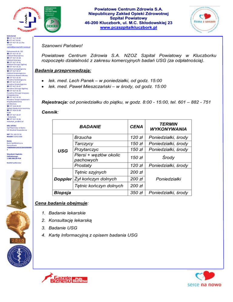 Powiatowe Centrum Zdrowia S.A. Niepubliczny Zakład Opieki Zdrowotnej Szpital Powiatowy 46-200 Kluczbork, ul. M.C. Skłodowskiej 23 www.pczszpita lkluczbork.pl Sekretariat 077 417 35 00 077 417 35 03 077 417 35 12 /fax e-mail: [email protected] Pełnomocnik ds. SZJ 077 417 35 10 Oddział Wewnętrzny 077 417 35 58 Oddział Dziecięcy 077 417 35 41 Oddział Chirurgii Ogólnej 077 417 35 25 Oddział Laryngologiczny 077 417 35 57 Oddział GinekologicznoPołożniczo-Noworodkowy 077 417 35 43 Poradnia Kardiologiczna 077 417 35 47 Poradnia Ginekologiczna 077 417 35 47 Poradnia Chirurgii Ogólnej 077 417 35 35 Poradnia Chirurgii UrazowoOrtopedycznej 077 417 35 35 Poradnia Terapii Uzależnień i Współuzależnienia od Alkoholu 077 418 26 02 Zakład Opiekuńczo-Leczniczy 077 414 55 00 RUM 077 417 35 07 i Statystyka 077 417 35 06 [email protected] Szanowni Państwo! Powiatowe Centrum Zdrowia S.A. NZOZ Szpital Powiatowy w Kluczborku rozpoczęło działalność z zakresu komercyjnych badań USG (za odpłatnością). Badania przeprowadzają: lek. med. Lech Panek – w poniedziałki, od godz. 15:00 lek. med. Paweł Mieszczański – w środy, od godz. 15:00 Rejestracja: od poniedziałku do piątku, w godz. 8:00 - 15:00, tel. 601 – 882 - 751 Cennik: CENA TERMIN WYKONYWANIA Brzucha Tarczycy Przytarczyc Piersi + węzłów okolic pachowych Prostaty 120 zł 150 zł 150 zł Poniedziałki, środy Poniedziałki, środy Poniedziałki, środy 150 zł Środy 120 zł Poniedziałki, środy Tętnic szyjnych 200 zł KRS 197251 Sąd Rejonowy w Opolu VIII Wydział Gospodarczy BADANIE NIP 751 165 55 56 REGON 532421008 Konto Bank Spółdzielczy w Namysłowie 7088900001003353042000000 1 Wysokość Kapitału Zakładowego: 1.000.000,00 PLN USG Kapitał wpłacony: Doppler Żył kończyn dolnych Tętnic kończyn dolnych Biopsja 200 zł Poniedziałki 200 zł 350 zł Cena badania obejmuje: 1. Badanie lekarskie 2. Konsultację lekarską 3. Badanie USG 4. Kartę Informacyjną z opisem badania USG Poniedziałki, środy