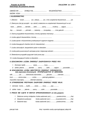 Przesłać do ZO PZŁ właściwego dla położenia obwodu OBWÓD NR ......... ZAŁĄCZNIK do ŁOW-1 OKRĘG PZŁ................................ WOJEWÓDZTWO.................................. NAZWA KOŁA .......................................................................................................................... I. KŁUSOWNICTWO 1. Zebrano: wnyki............... szt., żelaza......... szt., inne urządzenia kłusownicze............szt. 2. Zwierzyna (lub jej szczątki – np. sierść) znaleziona w urządzeniach kłusowniczych w szt.: łosie........jelenie.........daniele........dziki.............sarny................muflony....... zające…………... .lisy..........borsuki..........piżmaki.........bażanty.........kuropatwy...........inne gatunki ……………… 3. Ocena przypadków kłusownictwa z bronią (sprawca nieznany):................................................ 4. Liczba ujętych kłusowników z bronią:..................................... 5. Liczba spraw o kłusownictwo przekazanych organom ścigania:................................................. 6. Liczba kłusujących chartów (lub ich mieszańców):..................................................................... 7. Liczba zdziczałych, bezpańskich psów w obwodzie:.................................................................. 8. Liczba psów puszczanych samopas przez miejscową ludność:................................................. 9. Stwierdzone przypadki pogryzień ludzi przez psy ...................................................................... 10. Liczba kłusujących kotów w obwodzie:..................................................................................... II. SZACUNKOWA LICZBA ZWIERZĄT ZAGRYZIONYCH PRZEZ PSY: 1. Domowe: bydło ............... owce................. kozy................ 2. dzikie: jelenie ...........daniele ........ sarny ..........dziki...........zające...........pozostałe.......... III. SZACUNKOWA LICZBA NIEKTÓRYCH ZWIERZĄT CHRONIONYCH (lub częściowo chronionych) WYSTĘPUJĄCYCH W OBWODZIE. wilk................ryś............bóbr(liczba stanowisk).............głuszec..............cietrzew................ kruk..............wrona siwa...............sroka...............jastrząb gołębiarz.................. myszołów zwyczajny................błotniak stawowy....................... IV. STWIERDZONE PRZYPADKI ZAGRYZIEŃ ZWIERZĄT PRZEZ WILKI. 1. domowe : konie........bydło...........owce...........kozy............psy............. 2. dzikie : łosie......... jelenie.........sarny...........dziki...............pozostałe................ V. PRACE NIE UJĘTE W INNYCH SPRAWOZDANIACH (w roku gospod.) 1. Założone remizy śródpolne: liczba sadzonek (szt.)..............powierzchnia............(ha) 2. Zasadzone podszyty: liczba sadzonek (szt.) ............na powierzchni...........(ha) 3. Sadzenie lasu: liczba sadzonek (szt.)...............powierzchnia............(ha) pieczęć koła imię i nazwisko osoby sporządzającej załącznik