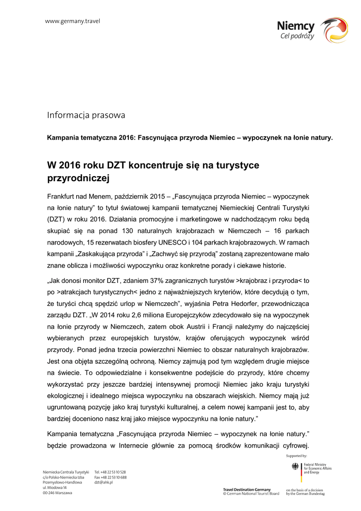 www.germany.travel Informacja prasowa Kampania tematyczna 2016: Fascynująca przyroda Niemiec – wypoczynek na łonie natury. W 2016 roku DZT koncentruje się na turystyce przyrodniczej Frankfurt nad Menem, październik 2015 – „Fascynująca przyroda Niemiec – wypoczynek na łonie natury” to tytuł światowej kampanii tematycznej Niemieckiej Centrali Turystyki (DZT) w roku 2016. Działania promocyjne i marketingowe w nadchodzącym roku będą skupiać się na ponad 130 naturalnych krajobrazach w Niemczech – 16 parkach narodowych, 15 rezerwatach biosfery UNESCO i 104 parkach krajobrazowych. W ramach kampanii „Zaskakująca przyroda” i „Zachwyć się przyrodą” zostaną zaprezentowane mało znane oblicza i możliwości wypoczynku oraz konkretne porady i ciekawe historie. „Jak donosi monitor DZT, zdaniem 37% zagranicznych turystów >krajobraz i przyroda< to po >atrakcjach turystycznych< jedno z najważniejszych kryteriów, które decydują o tym, że turyści chcą spędzić urlop w Niemczech”, wyjaśnia Petra Hedorfer, przewodnicząca zarządu DZT. „W 2014 roku 2,6 miliona Europejczyków zdecydowało się na wypoczynek na łonie przyrody w Niemczech, zatem obok Austrii i Francji należymy do najczęściej wybieranych przez europejskich turystów, krajów oferujących wypoczynek wśród przyrody. Ponad jedna trzecia powierzchni Niemiec to obszar naturalnych krajobrazów. Jest ona objęta szczególną ochroną. Niemcy zajmują pod tym względem drugie miejsce na świecie. To odpowiedzialne i konsekwentne podejście do przyrody, które chcemy wykorzystać przy jeszcze bardziej intensywnej promocji Niemiec jako kraju turystyki ekologicznej i idealnego miejsca wypoczynku na obszarach wiejskich. Niemcy mają już ugruntowaną pozycję jako kraj turystyki kulturalnej, a celem nowej kampanii jest to, aby bardziej doceniono nasz kraj jako miejsce wypoczynku na łonie natury.” Kampania tematyczna „Fascynująca przyroda Niemiec – wypoczynek na łonie natury.” będzie prowadzona w Internecie głównie za pomocą środków komunikacji cyfrowej. Niemiecka Centrala Turystyki c/o Polsko-Niemiecka Izba Przemysłowo-Handlowa ul. Miodowa 14 00-246 Warszawa Tel. +48 22 53 10 528 Fax +48 22 53 10 688 [email protected] www.germany.travel Dlatego najpierw rozbudowano treści poświęcone ofercie przyrodniczej na www.germany.travel/natur: wszystkie naturalne krajobrazy w Niemczech zostały zaznaczone na interaktywnej mapie, a dla 16 parków narodowych, 15 rezerwatów biosfery, jak również 48 wybranych parków krajobrazowych są dostępne strony internetowe ze szczegółowymi informacjami w języku niemieckim, angielskim i w innych, ważnych dla rozwoju rynku językach. Wyszukiwarka miejsc z różnymi filtrami ułatwia użytkownikowi znalezienie miejsca wypoczynku na łonie natury, dopasowanego do indywidualnych życzeń i oczekiwań. (www.germany.travel/enjoy). Projekty blogowe mają zapewnić stałe generowanie informacji i rekomendacji w postaci tekstów, zdjęć lub filmów pod hasztagiem kampanii oraz zwiększyć ruch na www.germany.travel/natur. Pod www.germany.travel/enjoygermannature, na social wall, mogą być zamieszczane treści tworzone przez użytkowników (user generated content). Głównymi rynkami kampanii są: Holandia, Wielka Brytania, Belgia, Szwajcaria, Francja, Włochy, Hiszpania, Austria, Czechy, Polska, Dania i Szwecja. Partnerami kampanii są: centrala organizacji EUROPARC Deutschland, organizacja „Naturalne krajobrazy w Niemczech” („Naturlandschaften in Deutschland”), jak również „Związek Niemieckich Parków Krajobrazowych” („Verband Deutscher Naturparke e.V.”) oraz organizacje marketingowe poszczególnych krajów związkowych. O DZT Niemiecka Centrala Turystyki (DZT) to narodowa „izba turystyki” Niemiec z siedzibą główną we Frankfurcie nad Menem. Centrala zajmuje się promowaniem Niemiec jako kraju turystycznego na zlecenie Federalnego Ministerstwa Gospodarki i Technologii (BMWi), które wspiera ją na mocy uchwały niemieckiego Bundestagu. DZT zajmuje się tworzeniem strategii i produktów oraz działaniami marketingowymi w celu dalszego umocnienia pozytywnego wizerunku Niemiec za granicą jako celu podróży oraz wspierania turystyki niemieckiej. DZT posiada 30 przedstawicielstw zagranicznych na całym świecie. Więcej informacji można znaleźć w internetowym centrum prasowym na www.germany.travel/presse. Niemiecka Centrala Turystyki c/o Polsko-Niemiecka Izba Przemysłowo-Handlowa ul. Miodowa 14 00-246 Warszawa Tel. +48 22 53 10 528 Fax +48 22 53 10 688 [email protected]
