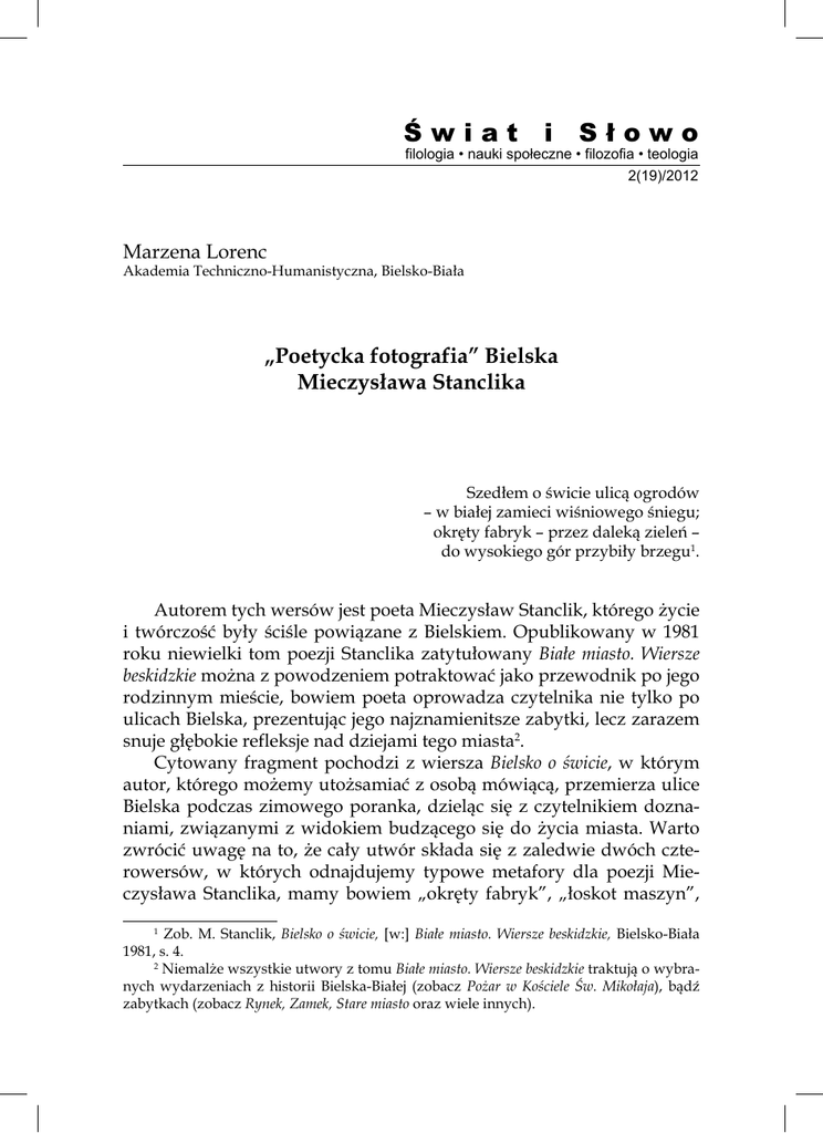 Świat i Słowo filologia • nauki społeczne • filozofia • teologia 2(19)/2012 Marzena Lorenc Akademia Techniczno-Humanistyczna, Bielsko-Biała „Poetycka fotografia” Bielska Mieczysława Stanclika Szedłem o świcie ulicą ogrodów – w białej zamieci wiśniowego śniegu; okręty fabryk – przez daleką zieleń – do wysokiego gór przybiły brzegu1. Autorem tych wersów jest poeta Mieczysław Stanclik, którego życie i twórczość były ściśle powiązane z Bielskiem. Opublikowany w 1981 roku niewielki tom poezji Stanclika zatytułowany Białe miasto. Wiersze beskidzkie można z powodzeniem potraktować jako przewodnik po jego rodzinnym mieście, bowiem poeta oprowadza czytelnika nie tylko po ulicach Bielska, prezentując jego najznamienitsze zabytki, lecz zarazem snuje głębokie refleksje nad dziejami tego miasta2. Cytowany fragment pochodzi z wiersza Bielsko o świcie, w którym autor, którego możemy utożsamiać z osobą mówiącą, przemierza ulice Bielska podczas zimowego poranka, dzieląc się z czytelnikiem doznaniami, związanymi z widokiem budzącego się do życia miasta. Warto zwrócić uwagę na to, że cały utwór składa się z zaledwie dwóch czterowersów, w których odnajdujemy typowe metafory dla poezji Mieczysława Stanclika, mamy bowiem „okręty fabryk”, „łoskot maszyn”, 1 Zob. M. Stanclik, Bielsko o świcie, [w:] Białe miasto. Wiersze beskidzkie, Bielsko-Biała 1981, s. 4. 2 Niemalże wszystkie utwory z tomu Białe miasto. Wiersze beskidzkie traktują o wybranych wydarzeniach z historii Bielska-Białej (zobacz Pożar w Kościele Św. Mikołaja), bądź zabytkach (zobacz Rynek, Zamek, Stare miasto oraz wiele innych). 248 Marzena Lorenc a z drugiej strony „ulice ogrodów”, wszędobylską zieleń i „wysokie góry”. Takie metaforyczne zestawienia są dominantą w poezji Stanclika, ponieważ zawsze mają swój określony sens3. W tym wypadku przy pomocy owego zabiegu autor chce pokazać to, o czym pisze wielu badaczy historii Bielska-Białej, a mianowicie, że: o bielskim regionie można mówić wielostronnie. Maszyny włókiennicze i szybowce, tkaniny i aparatura elektryczna, miejscowości wypoczynkowe i turystyczne trasy – tworzą kolorowy urozmaicony obraz tego zakątka Polski4. Mieczysław Stanclik ukazuje Bielsko jako miasto, w którym łączą się ze sobą dwie sfery – natury i cywilizacji, a także różne kultury: niemiecka i polska, jak również ta lokalna – bielska. Sfera natury przejawia się w górskim krajobrazie Beskidów, a zwłaszcza Beskidu Śląskiego, u którego podnóża leży to miasto. Cywilizacja natomiast to owe „okręty fabryk”, czy „łoskot maszyn” i to jest właśnie ten drugi obraz Bielska, miasta zindustrializowanego, przemysłowego, dynamicznie się rozwijającego. W wierszu Bielsko o świcie nad miastem wschodzi słońce, Bielsko jeszcze uśpione za chwilę będzie tętnić życiem i gwarem fabryk oraz miejskich zatłoczonych ulic. Zanim jednak poruszę kwestię miejskich krajobrazów, opisanych w wierszach Stanclika, chciałabym zatrzymać się na historii powstania Bielska-Białej, tym bardziej, że bielski poeta przywołuje ten kontekst w otwierającym tom wierszu Wstęp do miasta. Oto jego fragment: Wiązaliśmy, Miasto, koniec z końcem, związaliśmy się, niby brzeg z brzegiem5. Z tego miejsca Stanclik rozpoczyna swoją podróż po kartach historii miasta, odsyłając czytelnika do II połowy XIII wieku, kiedy to nad rzekę 3 Najczęściej występującym motywem, za pomocą którego Mieczysław Stanclik oraz wymieniani później autorzy opisują Bielsko, jest topos okrętu – pojawia się on w wielu utworach: „Wiem, to są krosna fabryczne okręty...” (Miasto – M. Stanclik), „Dwa żagle miasta się bielą w porcie pod przegibkiem świata...” (Bocianie gniazdo wiersza – dwojga imion – Miastu – M. Stanclik), podobnie jest u Stanisława Goli: „Zielona łódź Beskidu wypełniona dziećmi” (zob. Widokówka z Bielska, [w:] Strofy o Bielsku-Białej, oprac. S. Gola, Bielsko-Biała 1989). 4 Zob. Bielsko-Biała. Zarys rozwoju miasta i powiatu, oprac. H. Rechowicz, Katowice 1971, s. 554. Choć autorzy wyraźnie zaznaczają, że we współczesny krajobraz Bielska-Białej równie mocno wpisuje się kultura, czytamy: „W dzisiejszym wizerunku bielskiego regionu teatr i film, plastyka i muzyka, domy kultury i czytelnie rysują się wyraziście i są dostrzegalne w wielu aspektach”. 5 M. Stanclik, Białe miasto..., s. 3. „Poetycka fotografia” Bielska Mieczysława Stanclika 249 Białą dotarła fala osadników śląskich, do których dołączyli również koloniści niemieccy6. W ten sposób przez stulecia Bielsko było ośrodkiem wielokulturowym i wielonarodowym – obok siebie żyli jednocześnie Polacy, Niemcy, a od XVII wieku również Żydzi. Względy kulturowe, intensywny rozwój regionu oraz zamożność jego mieszkańców miały wpływ na to, że Bielsko określano mianem „małego Wiednia” i „zaliczano je do najpiękniejszych miast na zachodnich kresach Rzeczpospolitej”, jak podaje Przewodnik po Bielsku-Białej autorstwa Jerzego Polaka 7. Wraz z upływem czasu ten nieco wyidealizowany przez Mieczysława Stanclika wizerunek miasta ulega zmianie. Już od końca XIX wieku zaczynają wybuchać konflikty społeczne i narodowościowe, zaś ich apogeum przypada na lata 20. i 30. XX wieku. „Mały Wiedeń” przeistoczył się w tzw. „mały Berlin”8 za sprawą wybuchu II wojny światowej, która położyła kres wielokulturowości Bielska. W czasie wojny żydowską część społeczności miasta wymordowano w obozach koncentracyjnych; w 1945 roku Niemcy opuścili na stałe Bielsko, a na ich miejsce przybyli repatrianci z całej Polski9. Wracając do początków warto wspomnieć, że pierwsi osadnicy i założyciele miasta, przybyli z Zachodu z inicjatywy księcia raciborskiego i cieszyńskiego Mieszka I. W ten sposób założono nie tylko bielską osadę,