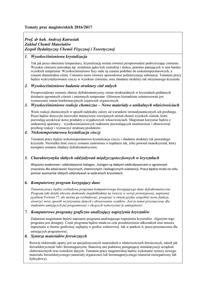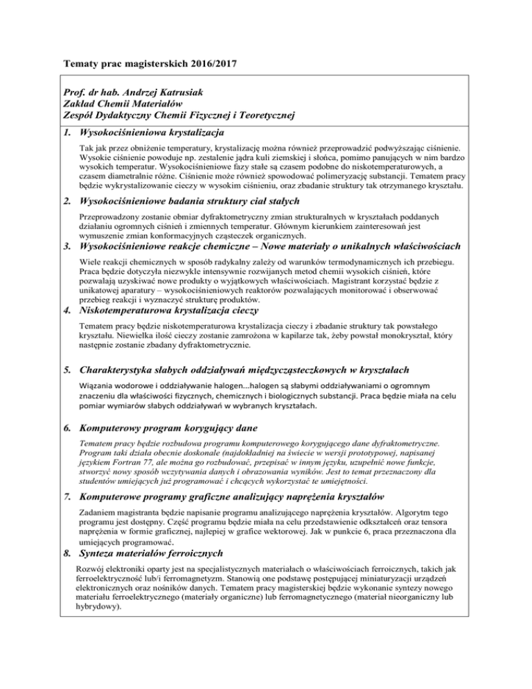 Tematy prac magisterskich 2016/2017 Prof. dr hab. Andrzej Katrusiak Zakład Chemii Materiałów Zespół Dydaktyczny Chemii Fizycznej i Teoretycznej 1. Wysokociśnieniowa krystalizacja Tak jak przez obniżenie temperatury, krystalizację można również przeprowadzić podwyższając ciśnienie. Wysokie ciśnienie powoduje np. zestalenie jądra kuli ziemskiej i słońca, pomimo panujących w nim bardzo wysokich temperatur. Wysokociśnieniowe fazy stałe są czasem podobne do niskotemperaturowych, a czasem diametralnie różne. Ciśnienie może również spowodować polimeryzację substancji. Tematem pracy będzie wykrystalizowanie cieczy w wysokim ciśnieniu, oraz zbadanie struktury tak otrzymanego kryształu. 2. Wysokociśnieniowe badania struktury ciał stałych Przeprowadzony zostanie obmiar dyfraktometryczny zmian strukturalnych w kryształach poddanych działaniu ogromnych ciśnień i zmiennych temperatur. Głównym kierunkiem zainteresowań jest wymuszenie zmian konformacyjnych cząsteczek organicznych. 3. Wysokociśnieniowe reakcje chemiczne – Nowe materiały o unikalnych właściwościach Wiele reakcji chemicznych w sposób radykalny zależy od warunków termodynamicznych ich przebiegu. Praca będzie dotyczyła niezwykle intensywnie rozwijanych metod chemii wysokich ciśnień, które pozwalają uzyskiwać nowe produkty o wyjątkowych właściwościach. Magistrant korzystać będzie z unikatowej aparatury – wysokociśnieniowych reaktorów pozwalających monitorować i obserwować przebieg reakcji i wyznaczyć strukturę produktów. 4. Niskotemperaturowa krystalizacja cieczy Tematem pracy będzie niskotemperaturowa krystalizacja cieczy i zbadanie struktury tak powstałego kryształu. Niewielka ilość cieczy zostanie zamrożona w kapilarze tak, żeby powstał monokryształ, który następnie zostanie zbadany dyfraktometrycznie. 5. Charakterystyka słabych oddziaływań międzycząsteczkowych w kryształach Wiązania wodorowe i oddziaływanie halogen...halogen są słabymi oddziaływaniami o ogromnym znaczeniu dla właściwości fizycznych, chemicznych i biologicznych substancji. Praca będzie miała na celu pomiar wymiarów słabych oddziaływań w wybranych kryształach. 6. Komputerowy program korygujący dane Tematem pracy będzie rozbudowa programu komputerowego korygującego dane dyfraktometryczne. Program taki działa obecnie doskonale (najdokładniej na świecie w wersji prototypowej, napisanej językiem Fortran 77, ale można go rozbudować, przepisać w innym języku, uzupełnić nowe funkcje, stworzyć nowy sposób wczytywania danych i obrazowania wyników. Jest to temat przeznaczony dla studentów umiejących już programować i chcących wykorzystać te umiejętności. 7. Komputerowe programy graficzne analizujący naprężenia kryształów Zadaniem magistranta będzie napisanie programu analizującego naprężenia kryształów. Algorytm tego programu jest dostępny. Część programu będzie miała na celu przedstawienie odkształceń oraz tensora naprężenia w formie graficznej, najlepiej w grafice wektorowej. Jak w punkcie 6, praca przeznaczona dla umiejących programować. 8. Synteza materiałów ferroicznych Rozwój elektroniki oparty jest na specjalistycznych materiałach o właściwościach ferroicznych, takich jak ferroelektryczność lub/i ferromagnetyzm. Stanowią one podstawę postępującej miniaturyzacji urządzeń elektronicznych oraz nośników danych. Tematem pracy magisterskiej będzie wykonanie syntezy nowego materiału ferroelektrycznego (materiały organiczne) lub ferromagnetycznego (materiał nieorganiczny lub hybrydowy). Zakład Chemii Materiałów, Wydział Chemii, Morasko seg. A, poziom -1 23.11.2015 (poniedziałek) Termin indywidualnych spotkań kierowników: 23 - 27 listopada 2015 prof. A. Katrusiak godz. 9:00-11:00 pok. 1.19 dr A. Olejniczak godz. 11:00-15:00 pok. 1.20 24.11.2015 (wtorek) prof. A. Katrusiak godz. 10:00-15:00 pok. 1.19 godz. 9:00-15:00 pok. 1.19 prof. A. Katrusiak godz. 9:00-13:00 pok. 1.19 dr A. Olejniczak godz. 13:00-14:30 pok. 1.20 25.11.2015 (środa) prof. A. Katrusiak 26.11.2015 (czwartek) 27.11 2015 (piątek) prof. A. Katrusiak godz. 9:00-15:00 pok. 1.19 ( Miejsca pisane kursywą proszę zastąpić odpowiednimi danymi.)