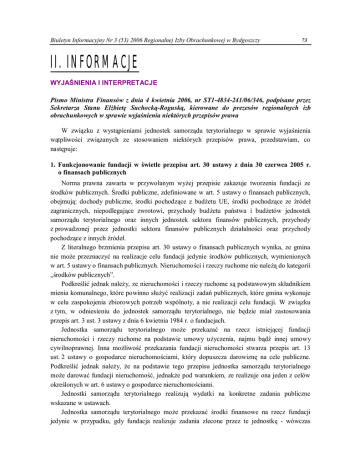 Biuletyn Informacyjny Nr 3 (53) 2006 Regionalnej Izby Obrachunkowej w Bydgoszczy 73 II. INFORMACJE WYJAŚNIENIA I INTERPRETACJE Pismo Ministra Finansów z dnia 4 kwietnia 2006, nr ST1-4834-241/06/346, podpisane przez Sekretarza Stanu Elżbietę Suchocką-Roguską, kierowane do prezesów regionalnych izb obrachunkowych w sprawie wyjaśnienia niektórych przepisów prawa W związku z wystąpieniami jednostek samorządu terytorialnego w sprawie wyjaśnienia wątpliwości związanych ze stosowaniem niektórych przepisów prawa, przedstawiam, co następuje: 1. Funkcjonowanie fundacji w świetle przepisu art. 30 ustawy z dnia 30 czerwca 2005 r. o finansach publicznych Norma prawna zawarta w przywołanym wyżej przepisie zakazuje tworzenia fundacji ze środków publicznych. Środki publiczne, zdefiniowane w art. 5 ustawy o finansach publicznych, obejmują: dochody publiczne, środki pochodzące z budżetu UE, środki pochodzące ze źródeł zagranicznych, niepodlegające zwrotowi, przychody budżetu państwa i budżetów jednostek samorządu terytorialnego oraz innych jednostek sektora finansów publicznych, przychody z prowadzonej przez jednostki sektora finansów publicznych działalności oraz przychody pochodzące z innych źródeł. Z literalnego brzmienia przepisu art. 30 ustawy o finansach publicznych wynika, ze gmina nie może przeznaczyć na realizacje celu fundacji jedynie środków publicznych, wymienionych w art. 5 ustawy o finansach publicznych. Nieruchomości i rzeczy ruchome nie należą do kategorii „środków publicznych”. Podkreślić jednak należy, ze nieruchomości i rzeczy ruchome są podstawowym składnikiem mienia komunalnego, które powinno służyć realizacji zadań publicznych, które gmina wykonuje w celu zaspokojenia zbiorowych potrzeb wspólnoty, a nie realizacji celu fundacji. W związku z tym, w odniesieniu do jednostek samorządu terytorialnego, nie będzie miał zastosowania przepis art. 3 ust. 3 ustawy z dnia 6 kwietnia 1984 r. o fundacjach. Jednostka samorządu terytorialnego może przekazać na rzecz istniejącej fundacji nieruchomości i rzeczy ruchome na podstawie umowy użyczenia, najmu bądź innej umowy cywilnoprawnej. Inna możliwość przekazania fundacji nieruchomości stwarza przepis art. 13 ust. 2 ustawy o gospodarce nieruchomościami, który dopuszcza darowiznę na cele publiczne. Podkreślić jednak należy, że na podstawie tego przepisu jednostka samorządu terytorialnego może darować fundacji nieruchomość, jednakże pod warunkiem, ze realizuje ona jeden z celów określonych w art. 6 ustawy o gospodarce nieruchomościami. Jednostki samorządu terytorialnego realizują wydatki na konkretne zadania publiczne wskazane w ustawach. Jednostka samorządu terytorialnego może przekazać środki finansowe na rzecz fundacji jedynie w przypadku, gdy fundacja realizuje zadania zlecone przez te jednostkę - wówczas 74 Biuletyn Informacyjny Nr 3 (53) 2006 Regionalnej Izby Obrachunkowej w Bydgoszczy jednostka samorządu terytorialnego może przekazać fundacji dotacje na podstawie art. 176 ustawy z dnia 30 czerwca 2005 r. o finansach publicznych. Przepis art. 30 ustawy o finansach publicznych wprowadza jednoznaczny zakaz przeznaczania środków publicznych na tworzenie fundacji. Zakaz ten dotyczy zarówno wnoszenia środków publicznych do majątku „nowej” fundacji jak i zwiększania funduszu założycielskiego fundacji już ustanowionej. 2. Dokumentowanie odpłatności za pobyt mieszkańców w domu pomocy społecznej Zgodnie z przepisem art. 17 ust. 1 pkt 16 ustawy z dnia 12 marca 2004 r. o pomocy społecznej (Dz. U. Nr 64, poz. 593 z późn. zm.), kierowanie do domu pomocy społecznej i ponoszenie odpłatności za pobyt mieszkańca gminy w tym domu, należy do zadań własnych gminy o charakterze obowiązkowym. Osoba, której przysługuje prawo do umieszczenia w domu pomocy społecznej (art. 54 ust. 1) jest kierowana do domu pomocy społecznej przez organ wykonawczy gminy. Skierowanie, jak i ustalenie opłaty za pobyt w domu pomocy społecznej, następuje w drodze decyzji administracyjnej tego organu, o czym stanowią przepisy art. 59 ust. 1 oraz art. 106 powołanej ustawy. Odpłatność gminy za pobyt w domu pomocy społecznej kierowanej osoby ustalana jest na zasadach określonych w art. 61 ustawy. Gmina - zgodnie z art. 61 ust. 2 pkt 3 - ma obowiązek wnosić opłaty w wysokości różnicy miedzy średnim kosztem utrzymania w domu pomocy społecznej a opłatami wnoszonymi przez osoby, o których mowa w pkt 1 i 2 ust. 2 art. 61. Podstawa dokumentowania odpłatności, o której mowa w art. 61 ust. 2 pkt 3 ustawy o pomocy społecznej powinna być właściwa decyzja administracyjna. 3. Klasyfikacja budżetowa Wynagrodzenia członków gminnych komisji rozwiązywania problemów alkoholowych Klasyfikacja budżetowa nie stanowi podstawy prawnej do ponoszenia wydatków budżetowych. Jest ona jedynie instrumentem technicznym do ujmowania wydatków ponoszonych na podstawie właściwych aktów prawnych. Stosownie do postanowień zawartych w art. 41 ust. 5 ustawy z dnia 26 października 1982 r. o wychowaniu w trzeźwości i przeciwdziałaniu alkoholizmowi rada gminy, w gminnych programach rozwiązywania problemów alkoholowych, określa zasady wynagradzania członków komisji rozwiązywania problemów alkoholowych. Z powyższego wynika, ze ustawodawca pozostawił swobodę w określeniu ogólnych zasad wynagradzania członków komisji organom stanowiącym gminy. Zauważyć jednak należy, ze ustawa posługuje się pojęciem „wynagrodzenie” a nie „dieta”. W świetle wyroku Naczelnego Sadu Administracyjnego w Poznaniu z dnia 10 września 1998 r. (sygn. akt. II S.A./Po 15/98) wynagrodzenie nie jest tożsame z pojęciem diety. Dieta występuje jako ryczałtowe określenie należności pieniężnej przysługującej pracownikowi na pokrycie kosztów dziennego utrzymania podczas podróży służbowej, bądź jako wynagrodzenie dzienne z tytułu pełni