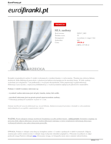 EuroFirany.pl SEA zasłony Kod towaru: Średnia ocen: Dostępność: Jednostka: Cena: DZ017_MG 55 wysyłamy w ciągu 2 dni kpl. 199.50 zł (-16%) 237.00 zł Komplet oryginalnych zasłon (2 sztuki) wykonanych z modnej tkaniny w stylu marine. Tkanina ma ciekawą fakturę drobnych, biało-błękitnych paseczków z piaskowym haftem nawiązującym do morskiej fauny. W dole zasłony wykonane jest eleganckie 7 cm podłożenie z wszytymi obciążnikami, które poprawiają wygląd dekoracji. Dekoracja szyta ręcznie, z najwyższą dokładnością i z wykorzystaniem najlepszych jakościowo materiałów. Podane w tabeli wymiary mierzone są: - wysokość zasłon mierzona jest od góry tunelu, taśmy lub szelki. - szerokość mierzona jest na prosto przed zmarszczeniem zasłony. * Tolerancja podanych wymiarów wynosi +/- 2 cm. Istnieje możliwość uszycia dekoracji wg. życzeń klienta. Zainteresowanych prosimy o kontakt w celu ustalenia indywidualnych szczegółów zamówienia i oferty. WAŻNE. Przed zakupem istnieje możliwość bezpłatnej wysyłki próbek tkanin - zadaj pytanie (formularz znajduje się powyżej obok zdjęcia dekoracji, tuż przy kodzie dekoracji) wpisując w treści wiadomości informację dotyczącą wybranych kolorów oraz adres doręczenia przesyłki. UWAGA. Podana w sklepie cena dotyczy kompletu zasłon = 2 sztuki o podanych w tabeli wymiarach. Zdjęcia aranżacyjne zasłon zamieszczone w sklepie mają wyłącznie charakter poglądowy. Pokazane na jednym ze zdjęć poduszki mogą Państwo dokupić tutaj. Zwracamy uwagę, że fotografia może nieco zmienić odcień koloru. strona 1 / 2 EuroFirany.pl Jeśli mają Państwo jakiekolwiek wątpliwości przed zakupem bardzo prosimy o kontakt mailowy lub telefoniczny. Zamów przez telefon: 85 651 35 35 (poniedziałek-piątek w godz.10-18) Zamów mailem: [email protected] Informacja dotycząca sposobu konserwacji dekoracji: UWAGA ! Dozując proszek do prania należy zwracać uwagę na zalecane ilości, zgodnie ze stopniami zabrudzenia tekstyliów. Informację dotyczącą zalecanych ilości można znaleźć na każdym opakowaniu proszku do prania. strona 2 / 2 Powered by TCPDF (www.tcpdf.org)