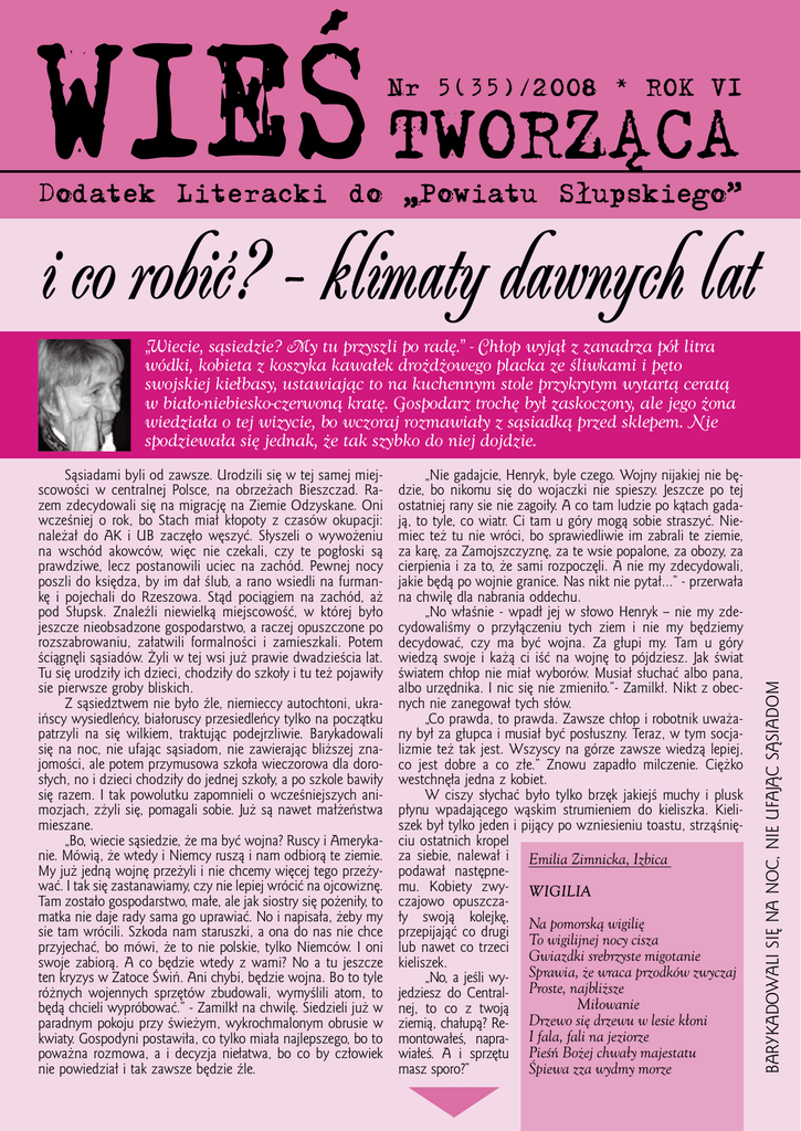 WIEŚ TWORZĄCA Nr 5(35)/2008 * ROK VI Dodatek Literacki do „Powiatu Słupskiego” i co robić? - klimaty dawnych lat Sąsiadami byli od zawsze. Urodzili się w tej samej miejscowości w centralnej Polsce, na obrzeżach Bieszczad. Razem zdecydowali się na migrację na Ziemie Odzyskane. Oni wcześniej o rok, bo Stach miał kłopoty z czasów okupacji: należał do AK i UB zaczęło węszyć. Słyszeli o wywożeniu na wschód akowców, więc nie czekali, czy te pogłoski są prawdziwe, lecz postanowili uciec na zachód. Pewnej nocy poszli do księdza, by im dał ślub, a rano wsiedli na furmankę i pojechali do Rzeszowa. Stąd pociągiem na zachód, aż pod Słupsk. Znaleźli niewielką miejscowość, w której było jeszcze nieobsadzone gospodarstwo, a raczej opuszczone po rozszabrowaniu, załatwili formalności i zamieszkali. Potem ściągnęli sąsiadów. Żyli w tej wsi już prawie dwadzieścia lat. Tu się urodziły ich dzieci, chodziły do szkoły i tu też pojawiły sie pierwsze groby bliskich. Z sąsiedztwem nie było źle, niemieccy autochtoni, ukraińscy wysiedleńcy, białoruscy przesiedleńcy tylko na początku patrzyli na się wilkiem, traktując podejrzliwie. Barykadowali się na noc, nie ufając sąsiadom, nie zawierając bliższej znajomości, ale potem przymusowa szkoła wieczorowa dla dorosłych, no i dzieci chodziły do jednej szkoły, a po szkole bawiły się razem. I tak powolutku zapomnieli o wcześniejszych animozjach, zżyli się, pomagali sobie. Już są nawet małżeństwa mieszane. „Bo, wiecie sąsiedzie, że ma być wojna? Ruscy i Amerykanie. Mówią, że wtedy i Niemcy ruszą i nam odbiorą te ziemie. My już jedną wojnę przeżyli i nie chcemy więcej tego przeżywać. I tak się zastanawiamy, czy nie lepiej wrócić na ojcowiznę. Tam zostało gospodarstwo, małe, ale jak siostry się pożeniły, to matka nie daje rady sama go uprawiać. No i napisała, żeby my sie tam wrócili. Szkoda nam staruszki, a ona do nas nie chce przyjechać, bo mówi, że to nie polskie, tylko Niemców. I oni swoje zabiorą. A co będzie wtedy z wami? No a tu jeszcze ten kryzys w Zatoce Świń. Ani chybi, będzie wojna. Bo to tyle różnych wojennych sprzętów zbudowali, wymyślili atom, to będą chcieli wypróbować.” - Zamilkł na chwilę. Siedzieli już w paradnym pokoju przy świeżym, wykrochmalonym obrusie w kwiaty. Gospodyni postawiła, co tylko miała najlepszego, bo to poważna rozmowa, a i decyzja niełatwa, bo co by człowiek nie powiedział i tak zawsze będzie źle. „Nie gadajcie, Henryk, byle czego. Wojny nijakiej nie będzie, bo nikomu się do wojaczki nie spieszy. Jeszcze po tej ostatniej rany sie nie zagoiły. A co tam ludzie po kątach gadają, to tyle, co wiatr. Ci tam u góry mogą sobie straszyć. Niemiec też tu nie wróci, bo sprawiedliwie im zabrali te ziemie, za karę, za Zamojszczyznę, za te wsie popalone, za obozy, za cierpienia i za to, że sami rozpoczęli. A nie my zdecydowali, jakie będą po wojnie granice. Nas nikt nie pytał...” - przerwała na chwilę dla nabrania oddechu. „No właśnie - wpadł jej w słowo Henryk – nie my zdecydowaliśmy o przyłączeniu tych ziem i nie my będziemy decydować, czy ma być wojna. Za głupi my. Tam u góry wiedzą swoje i każą ci iść na wojnę to pójdziesz. Jak świat światem chłop nie miał wyborów. Musiał słuchać albo pana, albo urzędnika. I nic się nie zmieniło.”- Zamilkł. Nikt z obecnych nie zanegował tych słów. „Co prawda, to prawda. Zawsze chłop i robotnik uważany był za głupca i musiał być posłuszny. Teraz, w tym socjalizmie też tak jest. Wszyscy na górze zawsze wiedzą lepiej, co jest dobre a co złe.” Znowu zapadło milczenie. Ciężko westchnęła jedna z kobiet. W ciszy słychać było tylko brzęk jakiejś muchy i plusk płynu wpadającego wąskim strumieniem do kieliszka. Kieliszek był tylko jeden i pijący po wzniesieniu toastu, strząśnięciu ostatnich kropel za siebie, nalewał i Emilia Zimnicka, Izbica podawał następnemu. Kobiety zwy- WIGILIA czajowo opuszczały swoją kolejkę, Na pomorską wigilię przepijająć co drugi To wigilijnej nocy cisza lub nawet co trzeci Gwiazdki srebrzyste migotanie kieliszek. „No, a jeśli wy- Sprawia, że wraca przodków zwyczaj jedziesz do Central- Proste, najbliższe nej, to co z twoją Miłowanie ziemią, chałupą? Re- Drzewo się drzewu w lesie kłoni montowałeś, napra- I fala, fali na jeziorze wiałeś. A i sprzętu Pieśń Bożej chwały majestatu Śpiewa zza wydmy morze masz sporo?” Barykadowali się na noc, nie ufając sąsiadom „Wiecie, sąsiedzie? My tu przyszli po radę.” - Chłop wyjął z zanadrza pół litra wódki, kobieta z koszyka kawałek drożdżowego placka ze śliwkami i pęto swojskiej kiełbasy, ustawiając to na kuchennym stole przykrytym wytartą ceratą w biało-niebiesko-czerwoną kratę. Gospodarz trochę był zaskoczony, ale jego żona wiedziała o tej wizycie, bo wczoraj rozmawiały z sąsiadką przed sklepem. Nie spodziewała się jednak, że tak szybko do niej dojdzie. pozbycie się ziemi jawiło się grzechem najgorszym „Ja, wiesz tak sobie myślę, że część maszyn tu sprzedam, bo tam się przyda każdy grosz, a chciałbym ze sobą zabrać młockarnię, bo tam we wsi mają tylko jedną i przydałaby się druga. Rozbierze się ją na części i załaduje w Damnicy na wagon towarowy. Złożyć to ją sam złożę, bo dokładnie się jej przyjrzałem. Ziemię zdam”. - Podrapał się po głowie, bo pozbycie się ziemi jawiło się grzechem najgorszym, zdradą matki – ziemi, żywicielki, jednocześnie przygładzając sterczący kosmyk. „Ale przecież to na prąd działa, ta maszyna, a tam wieś jeszcze nie została zelektryfikowana. Jak więc ją podłączysz. Można by na prądnicę. Ale to tylko w wojsku takie mają.” zastanawiał się na głos. „O to się nie martwię. Matka nam pisali, że w sąsiedniej wsi już podłączyli prąd. Na Poprawkę poci