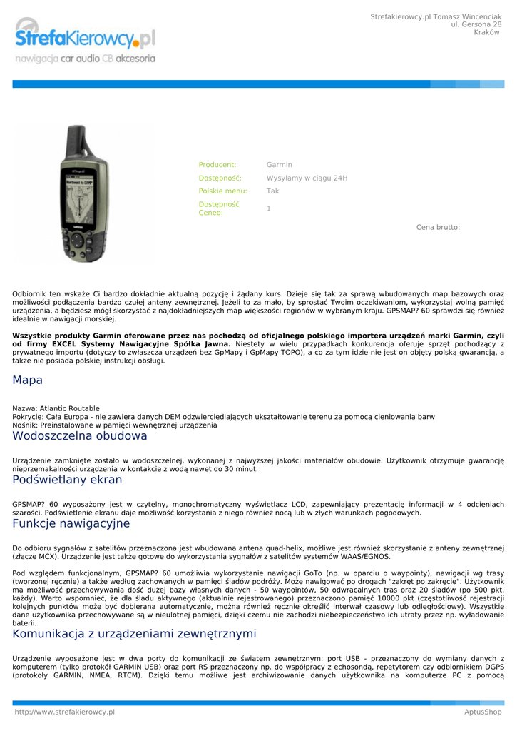 Strefakierowcy.pl Tomasz Wincenciak ul. Gersona 28 Kraków Producent: Garmin Dostępność: Wysyłamy w ciągu 24H Polskie menu: Tak Dostępność Ceneo: 1 Cena brutto: Odbiornik ten wskaże Ci bardzo dokładnie aktualną pozycję i żądany kurs. Dzieje się tak za sprawą wbudowanych map bazowych oraz możliwości podłączenia bardzo czułej anteny zewnętrznej. Jeżeli to za mało, by sprostać Twoim oczekiwaniom, wykorzystaj wolną pamięć urządzenia, a będziesz mógł skorzystać z najdokładniejszych map większości regionów w wybranym kraju. GPSMAP? 60 sprawdzi się również idealnie w nawigacji morskiej. Wszystkie produkty Garmin oferowane przez nas pochodzą od oficjalnego polskiego importera urządzeń marki Garmin, czyli od firmy EXCEL Systemy Nawigacyjne Spółka Jawna. Niestety w wielu przypadkach konkurencja oferuje sprzęt pochodzący z prywatnego importu (dotyczy to zwłaszcza urządzeń bez GpMapy i GpMapy TOPO), a co za tym idzie nie jest on objęty polską gwarancją, a także nie posiada polskiej instrukcji obsługi. Mapa Nazwa: Atlantic Routable Pokrycie: Cała Europa - nie zawiera danych DEM odzwierciedlających ukształtowanie terenu za pomocą cieniowania barw Nośnik: Preinstalowane w pamięci wewnętrznej urządzenia Wodoszczelna obudowa Urządzenie zamknięte zostało w wodoszczelnej, wykonanej z najwyższej jakości materiałów obudowie. Użytkownik otrzymuje gwarancję nieprzemakalności urządzenia w kontakcie z wodą nawet do 30 minut. Podświetlany ekran GPSMAP? 60 wyposażony jest w czytelny, monochromatyczny wyświetlacz LCD, zapewniający prezentację informacji w 4 odcieniach szarości. Podświetlenie ekranu daje możliwość korzystania z niego również nocą lub w złych warunkach pogodowych. Funkcje nawigacyjne Do odbioru sygnałów z satelitów przeznaczona jest wbudowana antena quad-helix, możliwe jest również skorzystanie z anteny zewnętrznej (złącze MCX). Urządzenie jest także gotowe do wykorzystania sygnałów z satelitów systemów WAAS/EGNOS. Pod względem funkcjonalnym, GPSMAP? 60 umożliwia wykorzystanie nawigacji GoTo (np. w oparciu o waypointy), nawigacji wg trasy (tworzonej ręcznie) a także według zachowanych w pamięci śladów podróży. Może nawigować po drogach "zakręt po zakręcie". Użytkownik ma możliwość przechowywania dość dużej bazy własnych danych - 50 waypointów, 50 odwracalnych tras oraz 20 śladów (po 500 pkt. każdy). Warto wspomnieć, że dla śladu aktywnego (aktualnie rejestrowanego) przeznaczono pamięć 10000 pkt (częstotliwość rejestracji kolejnych punktów może być dobierana automatycznie, można również ręcznie określić interwał czasowy lub odległościowy). Wszystkie dane użytkownika przechowywane są w nieulotnej pamięci, dzięki czemu nie zachodzi niebezpieczeństwo ich utraty przez np. wyładowanie baterii. Komunikacja z urządzeniami zewnętrznymi Urządzenie wyposażone jest w dwa porty do komunikacji ze światem zewnętrznym: port USB - przeznaczony do wymiany danych z komputerem (tylko protokół GARMIN USB) oraz port RS przeznaczony np. do współpracy z echosondą, repetytorem czy odbiornikiem DGPS (protokoły GARMIN, NMEA, RTCM). Dzięki temu możliwe jest archiwizowanie danych użytkownika na komputerze PC z pomocą http://www.strefakierowcy.pl AptusShop Strefakierowcy.pl Tomasz Wincenciak ul. Gersona 28 Kraków oprogramowania przeznaczonego do obsługi urządzeń firmy GARMIN. Korzystając z takiego oprogramowania użytkownik może również m.in. wcześniej zaplanować trasę podróży, czy charakterystyczne punkty i przesłać te dane do pamięci urządzenia. GPSMAP? 60 wyposażony jest w 1 MB pamięci dodatkowej, w której rezyduje fabrycznie załadowana baza miejscowości (punkty z nazwą miejscowości). Pamięć ta może zostać wykorzystana również do załadowania darmowej bazy morskich znaków nawigacyjnych (dostępna w dziale do pobrania), nie można jej jednak wykorzystać dla map czy danych użytkownika. Funkcje dodatkowe Z innych dostępnych funkcji wymienić należy alarmy dźwiękowe (kotwiczny, zejścia z kursu, przybycia, punktów niebezpiecznych, czasu) oraz funkcje budzika (urządzenie automatycznie się włącza) i stopera. Oprócz tego dostępne są: komputer podróży podający statystykę prędkości, odległości i czasów osiąganych w czasie podróży, ekran pór połowów i polowań - podający informacje o najlepszych porach do połowów i polowań w określonej lokalizacji, ekran słońca i księżyca - graficzna prezentacja ich położenia względem określonej lokalizacji oraz czasów wschodu i zachodu, tryb nawigacji geocache - umożliwia automatyczne przełączanie nawigacji do najbliższych punktów geocache i automatyczne oznaczanie odnalezionych skarbów, ekran dużych liczb - umożliwia wyświetlanie dowolnych wybranych przez użytkownika danych w dużych czytelnych polach. W zestawie Garmin GPSMAP 60 Uchwyt na pasek Smycz Przewód USB do synchronizacji z komputerem PC Oprogramowanie MapSource Trip & Waypoint Manager Szczegółowa instrukcja obsługi w języku polskim 4 akumulatorki Sanyo Eneloop 2000 mAh procesorowa ładowarka sieciowa Fujicell, procesorowa ładowarka samochodowa Fujicell Informacje dotyczące gwarancji Okres gwarancji: 24 miesiące. Serwis na terenie kraju: tak. Gwarancja w trybie door2door: tak. Tabela cech Cechy zewnętrzne ================================ ======= Wymiary 6.1 x 15.5 x 3.3 cm Rozmiar wyświetlacza 3.8 x 5.6 cm Rozdzielczość 160 x 240 pikseli Typ wyświetlacza LCD, 4 poziomy szarości, podświetlany Waga 198 g (z bateriami) Typ baterii 2 baterie AA Czas pracy na baterii do 28 godzin Wodoodporny Tak, IPX 7 Odbiornik wysokiej czułości Tak Wersja RoHS Tak Pływająca obudowa (na powierzchni wody) Nie Interfejs PC serial i USB Mapy i pamięć ================================ ======= Mapa bazowa Tak http://www.strefakierowcy.pl AptusShop Strefakierowcy.pl Tomasz Wincenciak ul. Gersona 28