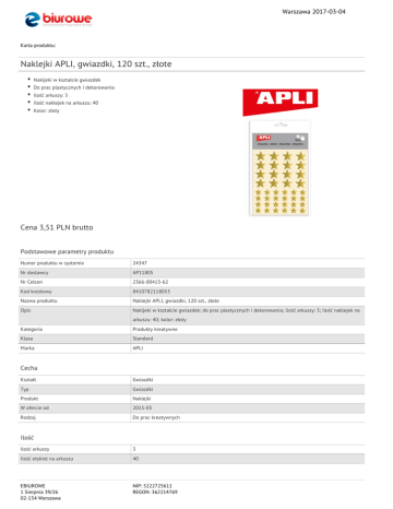 Warszawa 2017-03-04 Karta produktu: Naklejki APLI, gwiazdki, 120 szt., złote Nakljeki w kształcie gwiazdek Do prac plastycznych i dekorowania Ilość arkuszy: 3 Ilość naklejek na arkuszu: 40 Kolor: złoty Cena 3,51 PLN brutto Podstawowe parametry produktu Numer produktu w systemie 24347 Nr dostawcy AP11805 Nr Celcen 2366-00413-62 Kod kreskowy 8410782118053 Nazwa produktu Naklejki APLI, gwiazdki, 120 szt., złote Opis Nakljeki w kształcie gwiazdek; do prac plastycznych i dekorowania; ilość arkuszy: 3; ilość naklejek na arkuszu: 40; kolor: złoty Kategoria Produkty kreatywne Klasa Standard Marka APLI Cecha Kształt Gwiazdki Typ Gwiazdki Produkt Naklejki W ofercie od 2015-03 Rodzaj Do prac kreatywnych Ilość Ilość arkuszy 3 Ilość etykiet na arkuszu 40 EBIUROWE 1 Sierpnia 39/26 02-134 Warszawa NIP: 5222725611 REGON: 362214769 Warszawa 2017-03-04 Karta katalogowa produktu cd. Naklejki APLI, gwiazdki, 120 szt., złote Certyfikaty Nowy produkt w ofercie Standard Hit Standard Kolor Kolor Złoty Serdecznie zapraszamy do współpracy EBIUROWE zespół. EBIUROWE 1 Sierpnia 39/26 02-134 Warszawa NIP: 5222725611 REGON: 362214769