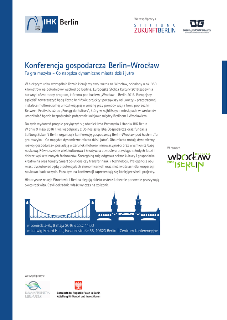 We współpracy z Konferencja gospodarcza Berlin-Wrocław Tu gra muzyka – Co napędza dynamiczne miasta dziś i jutro W bieżącym roku szczególnie licznie kierujemy swój wzrok na Wrocław, oddalony o ok. 350 kilometrów na południowy wschód od Berlina. Europejska Stolica Kultury 2016 zapewnia barwny i różnorodny program, któremu pod hasłem „Wrocław – Berlin 2016. Europejscy sąsiedzi“ towarzyszyć będą liczne berlińskie projekty: począwszy od Lunety - przestrzennej instalacji multimedialnej umożliwiającej wymianę przy pomocy wizji i fonii, poprzez In Between Festivals, aż po „Pociąg do Kultury”, który w najbliższych miesiącach w weekendy umożliwiać będzie bezpośrednie połączenie kolejowe między Berlinem i Wrocławiem. Do tych wydarzeń pragnie przyłączyć się również Izba Przemysłu i Handlu IHK Berlin. W dniu 9 maja 2016 r. we współpracy z Dolnośląską Izbą Gospodarczą oraz fundacją Stiftung Zukunft Berlin organizuje konferencję gospodarczą Berlin-Wrocław pod hasłem „Tu gra muzyka – Co napędza dynamiczne miasta dziś i jutro“. Oba miasta notują dynamiczny rozwój gospodarczy, posiadają wizerunek motorów innowacyjności oraz wyśmienitą bazę naukową. Równocześnie wielokulturowa i kreatywna atmosfera przyciąga młodych ludzi i dobrze wykształconych fachowców. Szczególną rolę odgrywa sektor kultury i gospodarka kreatywna oraz tematy Smart Solutions czy transfer nauki i technologii. Prelegenci z obu miast dyskutować będą o potencjałach ekonomicznych oraz możliwościach dla kooperacji naukowo-badawczych. Poza tym na konferencji zaprezentują się istniejące sieci i projekty. Historyczne relacje Wrocławia i Berlina sięgają daleko wstecz i obecnie ponownie przeżywają okres rozkwitu. Czyli dokładnie właściwy czas na zbliżenie. W W poniedziałek, 9 maja 2016 O GODZ 14.00 Ludwig Erhard Haus, Fasanenstraße 85, 10623 Berlin | Centrum konferencyjne We współpracy z W ramach We współpracy z godz.14.00 Otwarcie Nicole Srock.Stanley Członek prezydium IHK Berlin Dr. Volker Hassemer Prezes zarządu Stiftung Zukunft Berlin godz.15.30 Przerwa godz.16.00 Witryna Berlin-Wrocław Krótka prezentacja: Projekt Berlin Poland, Luneta, współpraca ulic handlowych oraz Pociąg do Kultury Berlin-Wrocław Powitanie Sekretarz stanu Hella Dunger-Löper Pełnomocnik ds. europejskich kraju związkowego Berlin Grzegorz Roman Pełnomocnik prezydenta Wrocławia Więcej niż melodia przyszłości – rozwiązania smart - made in Berlin and Wrocław Dr. Philipp Bouteiller Berlin TXL The Urban Tech Republic Sektor kultury i gospodarka kreatywna jako generator nowoczesnych miast Christophe Knoch Łukasz Czajkowski Koalition der freien Szene, In-Between-Festivals SIBB e. V., Projekt LOOKOUT Lutz Leichsenring Cem Ergün-Müller Clubcommission Berlin Think Thank CEO, Deutsche Telekom AG Tanja Mühlhans Prof. Detlef Hommel Administracja Senatu ds. Gospodarki, Badań Nau- Wrocław Research Center EIT+ Agencja Rozwoju Aglomeracji Wrocławskiej René Ebert kowych i Technologii Kraju Związkowego Berlin Katarzyna Roj Prowadzenie BWA Wrocław Design Gallery Dr. Petra König Janina Woźna Kierownik Działu Innowacji, Technologii i Nauki, Biuro Rozwoju Gospodarczego Urzędu IHK Berlin Miejskiego Wrocławia godz.18.00 Get-together przy polskim bufecie Prowadzenie Jürgen Schepers Koordynator branży przemysłów kreatywnych, IHK Berlin Spotkanie prowadzić będą Christian Wiesenhütter, wicedyrektor generalny IHK Berlin, oraz Jowita Cetnar-Kupracz, specjalista ds. projektów międzynarodowych Dolnośląskiej Izby Gospodarczej. O oprawę muzyczną zadbają Anna Kaluza (saksofon) i Mateusz Rybicki (klarnet). ZGŁOSZENIA We współpracy z dnia 6 maja 2016 Prosimy o zgłaszanie uczestnictwa do breslau pod adresem www.ihk-berlin.de/berlinnicznie na Wydarzenie będzie tłumaczone symulta język polski i niemiecki