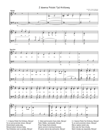1. Z dawna Polski Tyś Królową, Maryjo! Ty za nami przemów słowo, Maryjo! Ociemniałym podaj rękę, Niewytrwałym skracaj mękę, Twe Królestwo weź w porękę, Maryjo! 2. Gdyś pod krzyżem Syna stała, Maryjo! Tyleś, Matko, wycierpiała, Maryjo! Przez Twego Syna konanie Uproś sercom zmartwychwstanie, W ojców wierze daj wytrwanie, Maryjo! 3. Z dawna Polski Tyś Królową, Maryjo! Ty za nami przemów słowo, Maryjo! Miej w opiece naród cały, Który żyje dla Twej chwały, Niech rozwija się wspaniały, Maryjo!
