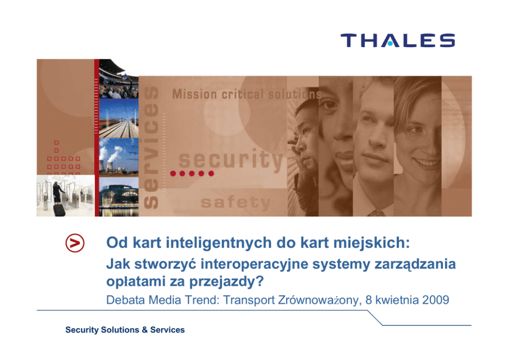 Od kart inteligentnych do kart miejskich: Jak stworzyć interoperacyjne systemy zarządzania opłatami za przejazdy? Debata Media Trend: Transport ZrównowaŜony, 8 kwietnia 2009 Security Solutions & Services Thales nr 1 na świecie Oslo Toronto Mexico City Paris Madrid Lisbon Algiers Gran Canaria Santo Domingo Denmark Netherlands Strasbourg Turin Naples New Delhi Cairo Dubai Beijing Nanjing Shenzhen Bangkok Taipei, Taiwan HSR Manila Caracas Hong Kong Rio de Janeiro Sao Paulo Santiago 2 Security Solutions & Services Kuala Lumpur Gautrain Singapore (Johannesburg-Tshwane) Regionalny elektroniczny system biletów bezstykowych w Oslo System obejmujący wielu operatorów Stolica Norwegii: 700 000 mieszkańców, 1,2 mln wraz z prowincją Akershus Interoperacyjność pomiędzy 3 operatorami OS (miejski transport publiczny w Oslo) Przyznanie kontraktów: Analiza przypadku: stycz. 2002r. • Specyfikacja tech.: czerw. 2002r. • Dostawa systemu: wrześ. 2003r. Oddanie do uŜytku: 3 72 wagonów tramwajowych, 400 autobusów 7 statków SL (autobusy i promy prowincji Akershus) NSB (Norweskie Państwowe Linie Kolejowe) kaŜdy posiada moduł integrujący • • WdroŜenie: 104 stacje metra W pełni bezstykowy system mediów inteligentnych listop. 2005r. Bilety Mifare UltraLight (jednorazowe i dzienne) 4 kw. 2007r. Karty Mifare DESFire (inne bilety oraz portmonetka transportowa) Security Solutions & Services Zasady taryfowe i handlowe OS SL NSB 6 5 1 Oslo 5 4 2 3 Prowincja Akershus 2 Interoperacyjne oferty taryfowe OS: Taryfa płaska SL: Taryfa strefowa z 3 strefami w Oslo + bilet lokalny NSB AS: System taryfowy od stacji do stacji 4 Security Solutions & Services Poziom 4 Regionalna architektura automatycznego pobierania opłat w Oslo Centralna izba rozrachunkowa Central Computer Workstations LAN Poziom 3 WAN OS Komputer centralny Centralny komputer LAN SL NSB Komputer centralny Komputer centralny Poziom 0 Poziom 1 Poziom 2 OS WAN 5 SL WAN NSB WAN OS SL NSB Systemy stacji i zajezdni System zajezdni Systemy stacji OS SL NSB Urządzenia klienckie Urządzenia klienckie Urządzenia klienckie Oslo - wspólne media taryfowe oraz interoperacyjne oferty taryfowe Security Solutions & Services Bezstykowe Inteligentne bilety i karty Bariery dla interoperacyjności Technologia karty: kaŜda karta interoperacyjna musi być przeczytana i przetworzona z zachowaniem wymaganego dla wszystkich urządzeń klienckich poziomu bezpieczeństwa. Struktura danych: kaŜde urządzenie klienckie musi rozpoznawać strukturę danych, aby mogło obliczyć opłaty z przejazd w momencie kasowania. Zasady handlowe: definiują one ofertę interoperacyjną, zasady korzystania z niej oraz zasady podziału wpływów. System rozliczeniowy: jest on wymagany celem przeprowadzenia rozliczeń oraz podziału wpływów w przypadku istnienia co najmniej dwóch operatorów. 6 Security Solutions & Services Nasza oferta dla transportu publicznego Strategy Dept / May 2007©Thales 2007 Urban transport 77 Security Solutions & Services Security Solutions & Services Main Lines Road Nasza oferta dla transportu publicznego Thales projektuje i dostarcza kompleksowe rozwiązania dla transportu publicznego Zintegrowane systemy biletowe Strategy / Marketing / BD Dept / May 2007©Thales 2007 • Pełny zakres maszyn do sprzedaŜy i sprawdzania • • • biletów Systemy przetwarzania danych dla zintegrowanych systemów komunikacji publicznej Systemy rozdziału wpływów z biletów pomiędzy operatorów Bezstykowe czytniki kart i biletów Rozwiązania parkingowe • Zarządzanie systemami parkingowymi • Systemy płatnicze oraz identyfikacji pojazdów 8 Security Solutions & Services Nasza oferta dla transportu publicznego Thales projektuje i dostarcza kompleksowe rozwiązania dla transportu publicznego Systemy nadzoru Strategy / Marketing / BD Dept / May 2007©Thales 2007 • Nadzór w czasie rzeczywistym • Zarządzania i monitoring floty pojazdów • Monitoring zasilania • Systemy telekomunikacyjne i alarmowe Komunikacja (na pojazdach & na peronach) • Komunikacja pojazd – infrastruktura/tor • Sieci szkieletowe na potrzeby komunikacji przewodowej i radiowej 9 Security Solutions & Services Nasza oferta dla transportu publicznego Bezpieczeństwo (na pojeździe & na peronach) • Monitoring vdeo, nagrywanie i analiza obrazu • Kontrola dostępu, systemy detekcji włamania i poŜaru • Detekcja czynników chemicznych, biologicznych, radiologicznych i promieniotwórczych Informacja dla podróŜnych (na pojeździe & na peronie) Strategy / Marketing / BD Dept / May 2007©Thales 2007 • • • • • Systemy rozgłoszeniowe Systemy informacji podróŜnych Elektroniczne systemy informacyjne w internecie Telefonia wypadkoa/alarmowa WiFi/WiMAX Internet access Utrzymanie i serwis • Systemów telekomunikacyjnych • Urządzeń technicznych 10 Security Solutions & Services Thales Strategy / Marketing / BD Dept / May 2007©Thales 2007 Dziękuję za uwagę 11 Security Solutions & Services