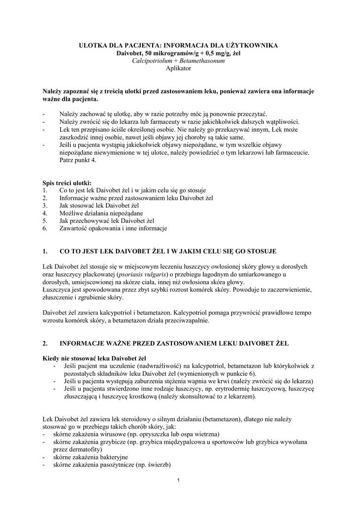 ULOTKA DLA PACJENTA: INFORMACJA DLA UŻYTKOWNIKA Daivobet, 50 mikrogramów/g + 0,5 mg/g, żel Calcipotriolum + Betamethasonum Aplikator Należy zapoznać się z treścią ulotki przed zastosowaniem leku, ponieważ zawiera ona informacje ważne dla pacjenta. - Należy zachować tę ulotkę, aby w razie potrzeby móc ją ponownie przeczytać. Należy zwrócić się do lekarza lub farmaceuty w razie jakichkolwiek dalszych wątpliwości. Lek ten przepisano ściśle określonej osobie. Nie należy go przekazywać innym, Lek może zaszkodzić innej osobie, nawet jeśli objawy jej choroby są takie same. Jeśli u pacjenta wystąpią jakiekolwiek objawy niepożądane, w tym wszelkie objawy niepożądane niewymienione w tej ulotce, należy powiedzieć o tym lekarzowi lub farmaceucie. Patrz punkt 4. Spis treści ulotki: 1. Co to jest lek Daivobet żel i w jakim celu się go stosuje 2. Informacje ważne przed zastosowaniem leku Daivobet żel 3. Jak stosować lek Daivobet żel 4. Możliwe działania niepożądane 5. Jak przechowywać lek Daivobet żel 6. Zawartość opakowania i inne informacje 1. CO TO JEST LEK DAIVOBET ŻEL I W JAKIM CELU SIĘ GO STOSUJE Lek Daivobet żel stosuje się w miejscowym leczeniu łuszczycy owłosionej skóry głowy u dorosłych oraz łuszczycy plackowatej (psoriasis vulgaris) o przebiegu łagodnym do umiarkowanego u dorosłych, umiejscowionej na skórze ciała, innej niż owłosiona skóra głowy. Łuszczyca jest spowodowana przez zbyt szybki rozrost komórek skóry. Powoduje to zaczerwienienie, złuszczenie i zgrubienie skóry. Daivobet żel zawiera kalcypotriol i betametazon. Kalcypotriol pomaga przywrócić prawidłowe tempo wzrostu komórek skóry, a betametazon działa przeciwzapalnie. 2. INFORMACJE WAŻNE PRZED ZASTOSOWANIEM LEKU DAIVOBET ŻEL Kiedy nie stosować leku Daivobet żel - Jeśli pacjent ma uczulenie (nadwrażliwość) na kalcypotriol, betametazon lub którykolwiek z pozostałych składników leku Daivobet żel (wymienionych w punkcie 6). - Jeśli u pacjenta występują zaburzenia stężenia wapnia we krwi (należy zwrócić się do lekarza) - Jeśli u pacjenta stwierdzono inne rodzaje łuszczycy, np. erytrodermię łuszczycową, łuszczycę złuszczającą i łuszczycę krostkową (należy skonsultować to z lekarzem). Lek Daivobet żel zawiera lek steroidowy o silnym działaniu (betametazon), dlatego nie należy stosować go w przebiegu takich chorób skóry, jak: - skórne zakażenia wirusowe (np. opryszczka lub ospa wietrzna) - skórne zakażenia grzybicze (np. grzybica międzypalcowa u sportowców lub grzybica wywołana przez dermatofity) - skórne zakażenia bakteryjne - skórne zakażenia pasożytnicze (np. świerzb) 1 - gruźlica okołowargowe zapalenie skóry (czerwona wysypka wokół ust) cienka skóra, łamliwość naczyń skórnych, rozstępy skórne rybia łuska (sucha skóra z łuskami podobnymi do rybich łusek) trądzik trądzik różowaty (silne wykwity lub zaczerwienienia skóry twarzy) owrzodzenia lub uszkodzenie skóry Ostrzeżenia i środki ostrożności Przed rozpoczęciem stosowania leku Daivobet żel należy omówić to z lekarzem lub farmaceutą, jeżeli: - pacjent stosuje inne leki zawierające kortykosteroidy, ponieważ mogą wystąpić działania niepożądane - pacjent stosował ten lek przez długi czas i planuje przerwać stosowanie (ponieważ istnieje ryzyko, że łuszczyca pogorszy się lub wystąpi jej nasilenie związane z nagłym przerwaniem stosowania leku zawierającego steroid) - pacjent ma cukrzycę, gdyż leki zawierające steroidy mogą mieć wpływ na stężenie cukru/glukozy we krwi - wystąpiło zakażenie skóry, ponieważ w takim przypadku może być konieczne przerwanie leczenia - u pacjenta występuje łuszczyca kropelkowata Środki ostrożności - unikać stosowania leku na więcej niż 30% powierzchni ciała oraz stosowania większych ilości niż 15 g na dobę - unikać stosowania leku pod czepkami kąpielowymi, bandażami lub opatrunkami, ponieważ zwiększa to wchłanianie steroidu - unikać stosowania leku na dużej powierzchni uszkodzonej skóry, błonach śłuzowych lub w fałdach skórnych (pachwiny, pachy, pod piersiami), ponieważ zwiększa to wchłanianie steroidu - unikać stosowania na twarz i narządy rozrodcze (narządy płciowe), ponieważ są one szczególnie wrażliwe na steroidy - unikać nadmiernego opalania, korzystania z solarium lub innych form fototerapii Dzieci i młodzież Daivobet żel nie jest zalecany do stosowania u dzieci w wieku poniżej 18 lat. Lek Daivobet żel a inne leki Należy powiedzieć lekarzowi lub farmaceucie o wszystkich przyjmowanych przez pacjenta aktualnie lub ostatnio lekach, również tych, które wydawane są bez recepty. Ciąża i karmienie piersią Przed zastosowaniem jakiegokolwiek leku należy poradzić się lekarza lub farmaceuty. Nie stosować leku Daivobet żel w okresie ciąży (lub w przypadku podejrzenia ciąży) lub w okresie karmienia piersią, jeżeli nie zostało to najpierw uzgodnione z lekarzem. Jeśli lekarz zgodził się na karmienie piersią, należy zachować ostrożność i nie stosować leku Daivobet żel na powierzchni piersi. Prowadzenie pojazdów i obsługiwanie maszyn Lek ten nie powinien mieć żadnego wpływu na zdolność do prowadzenia pojazdów i obsługiwania maszyn. Daivobet żel zawiera butylohydroksytoluen (E321) Lek Daivobet żel zawiera butylohydroksytoluen (E321), który może powodować miejscowe reakcje skórne (np. kontaktowe zapalenie skóry) lub podrażnienie oczu i błon śluzowych. 3. JAK STOSOWAĆ LEK DAIVOBET ŻEL 2 Lek Daivobet żel należy zawsze stosować zgodnie z zaleceniami lekarza. W razie wątpliwości należy skontaktować się z lekarzem lub farmaceutą. Sposób zastosowania leku Daivobet żel: podanie na skórę. Przed zastosowaniem leku Daivobet żel w aplikatorze, należy uważnie przeczytać instrukcję użycia aplikatora zamieszczoną na końcu tej ulotki. W instrukcji użycia zamieszczono info
