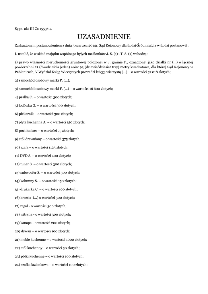 Sygn. akt III Ca 1553/14 UZASADNIENIE Zaskarżonym postanowieniem z dnia 5 czerwca 2014r. Sąd Rejonowy dla Łodzi-Śródmieścia w Łodzi postanowił : I. ustalić, że w skład majątku wspólnego byłych małżonków J. S. (1) i T. S. (1) wchodzą: 1) prawo własności nieruchomości gruntowej położonej w J. gminie P., oznaczonej jako działki nr (...) o łącznej powierzchni 21 (dwadzieścia jeden) arów 93 (dziewięćdziesiąt trzy) metry kwadratowe, dla której Sąd Rejonowy w Pabianicach, V Wydział Ksiąg Wieczystych prowadzi księgę wieczystą (...) – o wartości 57 018 złotych; 2) samochód osobowy marki P. (...); 3) samochód osobowy marki F. (...) – o wartości 16 600 złotych; 4) pralka C. – o wartości 300 złotych; 5) lodówka G. – o wartości 300 złotych; 6) piekarnik – o wartości 300 złotych; 7) płyta kuchenna A. – o wartości 150 złotych; 8) pochłaniacz – o wartości 75 złotych; 9) stół drewniany – o wartości 375 złotych; 10) szafa – o wartości 1125 złotych; 11) DVD S. – o wartości 400 złotych; 12) tuner S. – o wartości 300 złotych; 13) subwoofer S. – o wartości 300 złotych; 14) kolumny S. – o wartości 150 złotych; 15) drukarka C. – o wartości 100 złotych; 16) krzesła (...) o wartości 300 złotych; 17) regał - o wartości 300 złotych; 18) witryna - o wartości 300 złotych; 19) kanapa - o wartości 200 złotych; 20) dywan – o wartości 100 złotych; 21) meble kuchenne – o wartości 1000 złotych; 22) stół kuchenny – o wartości 50 złotych; 23) półki kuchenne – o wartości 100 złotych; 24) szafka łazienkowa – o wartości 100 złotych; 25) odkurzacz – o wartości 150 złotych; 26) żelazko – o wartości 100 złotych; 27) płyty DVD – o wartości 1000 złotych; 28) płyty CD – o wartości 600 złotych; 29) telewizor S. – o wartości 4 500 złotych; 30) grafika autorstwa H. P. – o wartości 1000 złotych; 31) środki pieniężne zgromadzone na koncie bankowym w wysokości 486,98 zł; II. ustalić, iż wartość nakładów z majątku wspólnego na majątek osobisty T. S. (2) wyniosła 4 916 złotych; III. dokonać podziału majątku wspólnego opisanego w punkcie I. w ten sposób, że: 1) przyznać na własność T. S. (2) prawo własności nieruchomości opisane w punkcie 1 (pierwszym) oraz ruchomości opisane w punktach 3 – 28 ; 2) przyznać na własność J. S. (1) ruchomości opisane w punktach 29 – 30; 3) środki pieniężne opisane w punkcie 31 podzielić pomiędzy T. S. (2) i J. S. (1) przyznając im po 1/2 części, tj. po 243,49 zł; 4) zasądzić tytułem dopłaty od T. S. (2) na rzecz J. S. (1) kwotę 40 604 złote płatną w terminie 30 dni od uprawomocnienia się postanowienia, z ustawowymi odsetkami w razie uchybienia terminowi płatności; IV. zarządzić sprzedaż w drodze licytacji publicznej przez komornika sądowego składnika majątkowego opisanego w punkcie 2 punktu I. ; V. pieniądze uzyskane ze sprzedaży, o której mowa w punkcie IV, podzielić pomiędzy T. S. (2) i J. S. (1) przyznając im po 1/2 części ceny sprzedaży; VI. zobowiązać T. S. (2) do wydania J. S. (1) ruchomości opisanych w punktach 29 i 30 w terminie 14 dni od uprawomocnienia się postanowienia; VII. oddalić wniosek w pozostałym zakresie; VIII. nakazać pobrać od T. S. (2) na rzecz Skarbu Państwa – Sądu Rejonowego dla Łodzi – Śródmieścia w Łodzi kwotę 1 500 złotych tytułem zwrotu połowy nieuiszczonych kosztów sądowych; IX. nakazać pobrać od J. S. (1) na rzecz Skarbu Państwa – Sądu Rejonowego dla Łodzi – Śródmieścia w Łodzi kwotę 1 500 złotych tytułem zwrotu połowy nieuiszczonych kosztów sądowych; X. ustalić, że wnioskodawczyni i uczestnik ponoszą koszty związane ze swoim udziałem w sprawie. Uprzednio postanowieniem wstępnym z dnia 16 września 2010 roku Sąd Rejonowy dla Łodzi - Śródmieścia w Łodzi ustalił równe udziały w majątku wspólnym po ustaniu wspólności ustawowej J. S. (1) i T. S. (2). Postanowieniem z dnia 26 kwietnia 2011 roku Sąd Okręgowy w Łodzi oddalił apelację uczestnika od tego rozstrzygnięcia. W sprawie Sąd Rejonowy ustalił, że wyrokiem z dnia 23 lipca 2009 roku wydanym w sprawie XII C 624/09 Sąd Okręgowy w Łodzi XII Wydział Cywilny rozwiązał przez rozwód związek małżeński J. S. (1) i T. S. (2) zawarty w dniu 2 października 1999 roku. W dniu 8 sierpnia 2008 roku przed notariuszem R. K. zawarta została warunkowa umowa sprzedaży (Repertorium A Nr 6118/2008) pomiędzy D. J. jako sprzedającym oraz T. S. (2) jako kupującym. Jej przedmiotem było prawo własności nieruchomości gruntowej położonej w J., gminie P., oznaczonej jako działki nr (...) o łącznej powierzchni 21 arów 93 metry kwadratowe, dla której Sąd Rejonowy w Pabianicach, V Wydział Ksiąg Wieczystych prowadzi obecnie księgę wieczystą (...) za cenę 49 213,00 zł. T. S. (2) oświadczył wówczas, iż dokonuje zakupu do majątku osobistego, co zostało potwierdzone przez stawającą podczas sporządzania aktu notarialnego J. S. (1). W dniu 9 września 2008 roku zawarta została przed w/w notariuszem pomiędzy w/w stronami umowa przeniesienia w/w nieruchomości (Repertorium A Nr 6918/2008). Obecnie wartość opisanej powyżej nieruchomości wynosi 57 018 (pięćdziesiąt siedem tysięcy osiemnaście) złotych. Ponadto sąd ustalił, że strony w trakcie małżeństwa nabyły ruchomości: - pralka C. – o wartości 300 złotych; - lodówka G. – o wartości 300 złotych; - piekarnik – o wartości 300 złotych; - płyta kuchenna A. – o wartości 150 złotych; - pochłaniacz – o wartości 75 złotych; - stół drewniany – o wartości 375 złotych; - szafa – o wartości 1125 złotych; - DVD S. – o wartości 400 złotych; - tuner S. – o wartości 300 złotych; - subwoofer S. – o wartości 300 złotych; - kolumny S. – o wartości 150 złotych; - drukarka C. – o wartości 100 złotych; - krzesła (...) o wartości