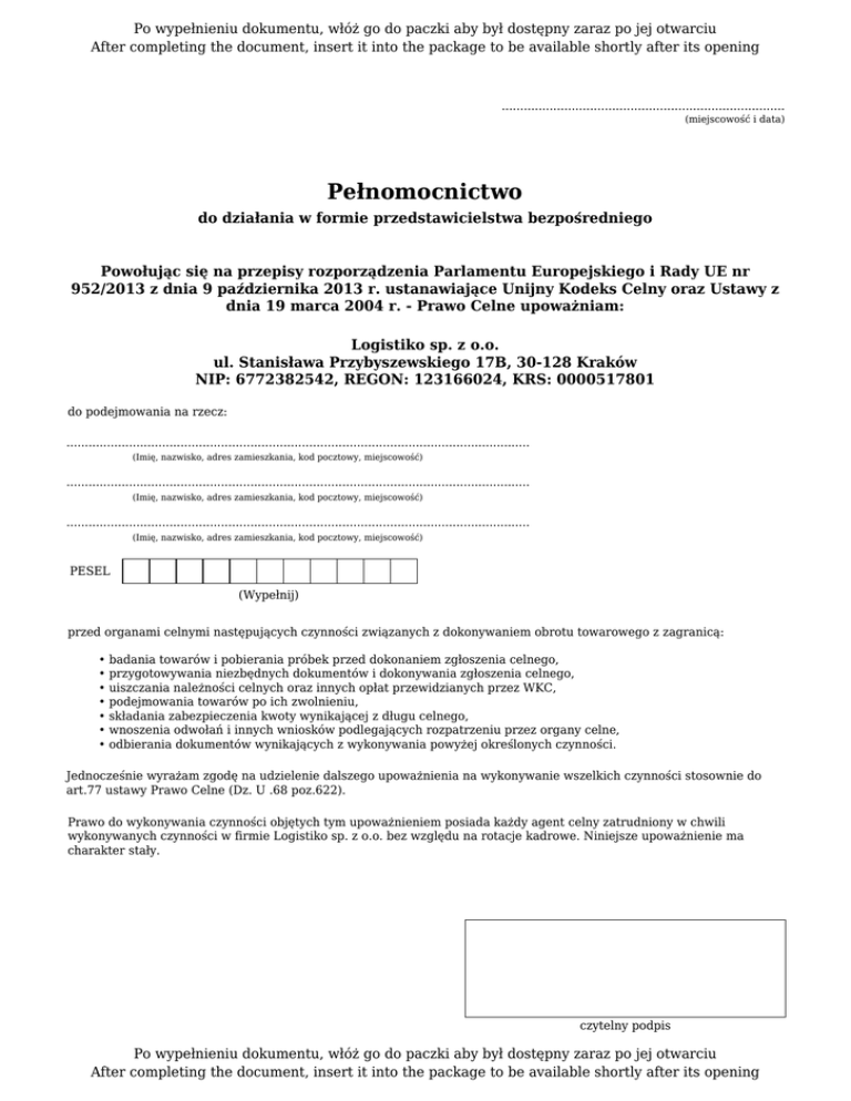 Po wypełnieniu dokumentu, włóż go do paczki aby był dostępny zaraz po jej otwarciu After completing the document, insert it into the package to be available shortly after its opening ............................................................................. (miejscowość i data) Pełnomocnictwo do działania w formie przedstawicielstwa bezpośredniego Powołując się na przepisy rozporządzenia Parlamentu Europejskiego i Rady UE nr 952/2013 z dnia 9 października 2013 r. ustanawiające Unijny Kodeks Celny oraz Ustawy z dnia 19 marca 2004 r. - Prawo Celne upoważniam: Logistiko sp. z o.o. ul. Stanisława Przybyszewskiego 17B, 30-128 Kraków NIP: 6772382542, REGON: 123166024, KRS: 0000517801 do podejmowania na rzecz: .............................................................................................................................. (Imię, nazwisko, adres zamieszkania, kod pocztowy, miejscowość) .............................................................................................................................. (Imię, nazwisko, adres zamieszkania, kod pocztowy, miejscowość) .............................................................................................................................. (Imię, nazwisko, adres zamieszkania, kod pocztowy, miejscowość) PESEL (Wypełnij) przed organami celnymi następujących czynności związanych z dokonywaniem obrotu towarowego z zagranicą: • badania towarów i pobierania próbek przed dokonaniem zgłoszenia celnego, • przygotowywania niezbędnych dokumentów i dokonywania zgłoszenia celnego, • uiszczania należności celnych oraz innych opłat przewidzianych przez WKC, • podejmowania towarów po ich zwolnieniu, • składania zabezpieczenia kwoty wynikającej z długu celnego, • wnoszenia odwołań i innych wniosków podlegających rozpatrzeniu przez organy celne, • odbierania dokumentów wynikających z wykonywania powyżej określonych czynności. Jednocześnie wyrażam zgodę na udzielenie dalszego upoważnienia na wykonywanie wszelkich czynności stosownie do art.77 ustawy Prawo Celne (Dz. U .68 poz.622). Prawo do wykonywania czynności objętych tym upoważnieniem posiada każdy agent celny zatrudniony w chwili wykonywanych czynności w firmie Logistiko sp. z o.o. bez względu na rotacje kadrowe. Niniejsze upoważnienie ma charakter stały. czytelny podpis Po wypełnieniu dokumentu, włóż go do paczki aby był dostępny zaraz po jej otwarciu After completing the document, insert it into the package to be available shortly after its opening
