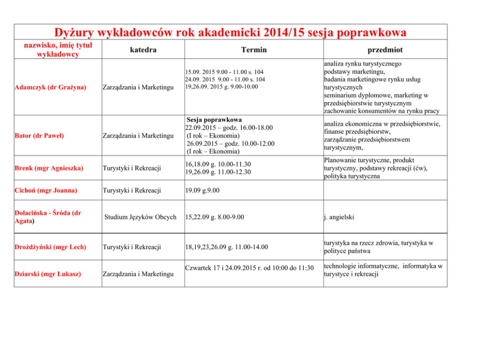 Dyżury wykładowców rok akademicki 2014/15 sesja poprawkowa