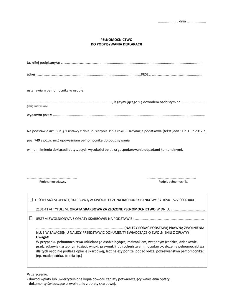 ...................., dnia .................... PEŁNOMOCNICTWO DO PODPISYWANIA DEKLARACJI Ja, niżej podpisany/a: ……………………………………............................................................................................................ adres: ………………………………………...................................................................PESEL: ………………………………..….............. ustanawiam pełnomocnika w osobie: ……………………………………………………………………………………., legitymującego się dowodem osobistym nr ………………………. (imię i nazwisko) wydanym przez: .............................................................................................................................................................. Na podstawie art. 80a § 1 ustawy z dnia 29 sierpnia 1997 roku - Ordynacja podatkowa (tekst jedn.: Dz. U. z 2012 r. poz. 749 z późn. zm.) upoważniam pełnomocnika do podpisywania w moim imieniu deklaracji dotyczących wysokości opłat za gospodarowanie odpadami komunalnymi. ………………………………………………… Podpis mocodawcy …..…………………………………………… Podpis pełnomocnika UIŚCIŁEM/AM OPŁATĘ SKARBOWĄ W KWOCIE 17 ZŁ NA RACHUNEK BANKOWY 37 1090 1577 0000 0001 2131 4174 TYTUŁEM: OPŁATA SKARBOWA ZA ZŁOŻONE PEŁNOMOCNICTWO W DNIU: ………………………………… JESTEM ZWOLNIONY/A Z OPŁATY SKARBOWEJ NA PODSTAWIE: ………..…………………………………………..……………… ….…………………………………………………………………………………… (NALEŻY PODAĆ PODSTAWĘ PRAWNĄ ZWOLNIENIA I/LUB W ZAŁĄCZENIU NALEŻY PRZEDSTAWIĆ DOKUMENTY ŚWIADCZĄCE O ZWOLNIENIU Z OPŁATY) Uwaga!! W przypadku pełnomocnictwa udzielanego osobie będącej małżonkiem, wstępnym (rodzice, dziadkowie, pradziadkowie), zstępnym (dzieci, wnuki, prawnuki) lub rodzeństwem mocodawcy, złożenie pełnomocnictwa dla tych osób nie podlega opłacie skarbowej, lecz należy poniżej podać rodzaj pokrewieństwa pełnomocnika: (np. matka, córka, babcia itp.) ……………………………………………………………………………………………………………………………………………………………..………... W załączeniu: - dowód wpłaty lub uwierzytelniona kopia dowodu zapłaty potwierdzający wniesienia opłaty, - dokumenty świadczące o zwolnieniu z opłaty skarbowej.
