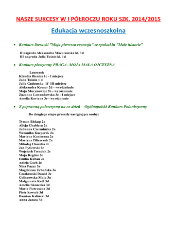 NASZE SUKCESY W I PÓŁROCZU ROKU SZK. 2014/2015 Edukacja wczesnoszkolna Konkurs literacki " ”Moja pierwsza recenzja" ze spektaklu " ”Małe historie" II nagroda Aleksandra Mazurowska kl. 1d III nagroda Julia Tuśnio kl. 1d Konkurs plastyczny PRAGA- MOJA MAŁA OJCZYZNA Laureaci: Klaudia Bienias 1c - I miejsce Julia Tuśnio 1 d Julia Gadomska 1f- III miejsce Aleksandra Komor 2d - wyróżnienie Maja Murynowicz 3b - wyróżnienie Zuzanna Lewandowska 3e - I miejsce Amelia Kortyna 3e - wyróżnienie Z poprawną polszczyzną na co dzień – Ogólnopolski Konkurs Polonistyczny Do drugiego etapu przeszły następujące osoby: Tymon Biskup 2a Alicja Chabiera 2a Julianna Czermińska 2a Weronika Kacperek 2a Martyna Konieczna 2a Martyna Piliszczuk 2a Mikołaj Choroba 2c Jan Pytlewski 2c Wojciech Trendak 2c Maja Regdos 2e Emilia Kuban 2e Aniela Goch 2e Nina Pazur 3a Magdalena Urbańska 3a Czatkowski Dawid 3c Goliszewska Maja 3a Małgorzata Król 3d Amelia Skonecka 3d Maria Pietruszka 3d Piotr Szwech 3d Damian Kaliński 3d Anna Janica 3d Z ortografią na co dzień – VIII Ogólnopolski Konkurs Polonistyczny Do drugiego etapu przeszły następujące osoby: Gabriela Wojdylak 2c Jan Pytlewski 2c Mikołaj Choroba 2c Wojciech Trendak 2c Karol Kosiorek 2e Maja Regdos 2e Michał Włodarczyk 3c Anita Goliszewska 3c Małgorzata Król 3d Anna Janica 3d Damian Kaliński 3d Piotr Szwech 3d STYPENDIADA WCZESNOSZKOLNA DLA KLAS 3: 1. Konkurs czytelniczy „Abecadło” 2. Konkurs ortograficzny „Ortografek” 3. Konkurs matematyczny „Plusik” 4. Konkurs plastyczny „Plastuś” W konkursach brali udział uczniowie klas III. Wyniki będą w drugim semestrze. OGÓLNOPOLSKI EDUKACYJNY KONKURS PODSTAWOWYCH „IGRZYSKA WIEDZY” DLA UCZNIÓW SZKÓŁ Michał Pallasch 3e - II stopień PRAGA JAKIEJ NIE ZNACIE - konkurs fotograficzny organizowany przez Dom Kultury „Praga” Rafał Zając 2d - I miejsce Maciej Możdżyński 2d - wyróżnienie OLIMPIADA - OLIMPUSEK Z JĘZYKA ANGIELSKIEGO Udział brali uczniowie z klas II i III. Wyniki będą w drugim semestrze. Język polski Ogólnopolski Konkurs Polonistyczny – „Poprawna polszczyzna” Do II etapu zakwalifikowali się: Kala Anna – 4e Biskup Bruno – 4e Wrębiak Konrad – 4f Gnyszko Mateusz – 4e Król Małgorzata – 4e Konieczna Patrycja – 4e Czerwińska Joanna – 5e Koźmińska Kasia – 5c Dawidowska Zuzanna – 5d Konkurs ortograficzny Do II etapu zakwalifikowali się: Kala Anna – 4e Biskup Bruno – 4e Wrębiak Konrad – 4f Gnyszko Mateusz – 4e Król Małgorzata – 4e Sikorska Izabela – 4e Dubas Oliwia – 4e Konieczna Patrycja – 4e Konieczna Patrycja – 4e Konkurs literacki Laureaci konkursu: Kęciek Maria – 6b Murasiewicz Maja – 6b Kolczyńska Maja – 5e Czermińska Joasia – 5e Cieśla Irenka – 5e Język angielski Konkurs Języka Angielskiego The Bat Kid – wyniki wkrótce II Dzielnicowy Konkurs z J. Angielskiego " ”Brainy" Najlepsze wyniki w naszej szkole: Bieńko Gustaw – 6b Mamiński Kosma – 6a Łapkowska Martyna – 6a Jabłońska Roksana – 5c Zieja Zuzanna – 5c Ogólnopolski Konkurs Języka Angielskiego – „Olimpus” - wyniki w marcu Przyroda Ogólnopolski Konkurs Geograficzny „Geo-Planeta” - wyniki wkrótce Technika Szkolny konkurs techniczny „Kokarda narodowa” I miejsce – Maja Murasiewicz klasa 6b Zofia Urbanik klasa 4b II miejsce – Katarzyna Jędrak klasa 6c Aleksandra Strzeszewska klasa 4b III miejsce – Natalia Bajera klasa 6c Gabriela Brodacka klasa 4b wyróżnienie: Olga Grygieńć klasa 4b Diana Lewandowska klasa 6c Religia SCHOLA zajęła II miejsce w Diecezjalnym Zlocie Liturgicznym " Nieznane postacie lub grupy ludzi, które w historii Polski miały wpływ na pogłębienie wiary w Narodzie" Matematyka i informatyka Ogólnopolski Konkurs matematyczny – „Olimpus” Laureat – Wrębiak Konrad – 4f – VI miejsce w Polsce!!! Najlepsze wyniki w naszej szkole: Osiekowicz Leon – 5d Sikorska Klara – 6a Ogólnopolski Konkurs matematyczny – „Plus – Minus” - wyniki wkrótce Międzydzielnicowy Konkurs Matematyczny – „MIKS” Do II etapu konkursu zakwalifikowali się następujący uczniowie: Sowa Ewa – 4c Mąka Małgorzata – 4d Konieczna Patrycja – 4e Jutkiewicz Bianka – 5b Dawidowska Zuzanna – 5d Mamiński Kosma – 6a Sikorska Klara – 6a Modrzejewski Jakub – 6d Międzyszkolny Turniej Scratcha (konkurs informatyczny) Dawidowska Zuzanna kl. 5d – laureat II miejsca Mazurowska Katarzyna kl. 5d – wyróżnienie Osiekowicz Leon kl. 5d – wyróżnienie Sztuka „Praga jakiej nie znacie” – Ogólnopolski Konkurs Plastyczny i Fotograficzny I miejsce – Zosia Brzezińska klasa 5a wyróżnienie – Natalia Bereda klasa 6a wyróżnienie – Julia Lisowska klasa 4c „Pocztówka z wakacji” – Ogólnopolski Konkurs Plastyczny wyróżnienie – Zosia Brzezińska klasa 5a „Jadę na święta” – Międzyszkolny Konkurs Muzyczny Wokalny wyróżnienie – Oliwia Kusznir klasa 4f wyróżnienie – Małgosia Prekurat klasa 4f wyróżnienie – Patryk Oczyński klasa 6a wyróżnienie – Marcin Mukowoz klasa 5a „Kolędować Małemu” – Warszawski Konkurs Muzyczny Wokalny dla dzieci i dorosłych II miejsce – zespół SZÓSTECZKA klasa 5a wyróżnienie – Marcin Mukowoz klasa 5a I miejsce – nauczycielski zespół wokalno-instrumentalny DYSONANS II miejsce – Teresa Bator – nauczyciel Wychowanie fizyczne 1. Szkoła podstawowa nr 258 w Mistrzostwach Dzielnicy Praga Północ organizowanych, w ramach XLVIII Warszawskiej Olimpiady Młodzieży, przez Wydział Sportu i Rekreacji Dzielnicy Praga Północ w roku szkolnym 2014/2015 w klasyfikacji ogólnej zajmuje trzecie miejsce w dzielnicy z dorobkiem 65 punktów. Reprezentacje dziewcząt i chłopców naszej szkoły brały udział w Mistrzostwach Dzielnicy Praga Północ z następującymi rezultatami: DZIEWCZĘTA CHŁOPCY DYSCYPLINA MIEJSCE DYSCYPLINA MIEJSCE Biegi przełajowe II Biegi przełajowe III Drużynowe