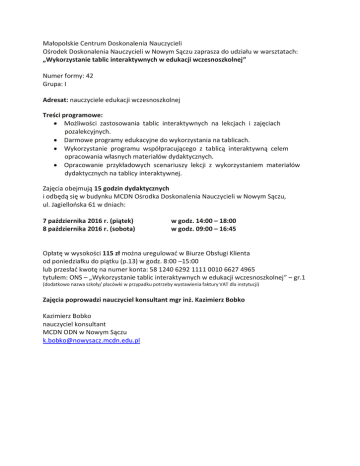 Małopolskie Centrum Doskonalenia Nauczycieli Ośrodek Doskonalenia Nauczycieli w Nowym Sączu zaprasza do udziału w warsztatach: „Wykorzystanie tablic interaktywnych w edukacji wczesnoszkolnej” Numer formy: 42 Grupa: I Adresat: nauczyciele edukacji wczesnoszkolnej Treści programowe: Możliwości zastosowania tablic interaktywnych na lekcjach i zajęciach pozalekcyjnych. Darmowe programy edukacyjne do wykorzystania na tablicach. Wykorzystanie programu współpracującego z tablicą interaktywną celem opracowania własnych materiałów dydaktycznych. Opracowanie przykładowych scenariuszy lekcji z wykorzystaniem materiałów dydaktycznych na tablicy interaktywnej. Zajęcia obejmują 15 godzin dydaktycznych i odbędą się w budynku MCDN Ośrodka Doskonalenia Nauczycieli w Nowym Sączu, ul. Jagiellońska 61 w dniach: 7 października 2016 r. (piątek) 8 października 2016 r. (sobota) w godz. 14:00 – 18:00 w godz. 09:00 – 16:45 Opłatę w wysokości 115 zł można uregulować w Biurze Obsługi Klienta od poniedziałku do piątku (p.13) w godz. 8:00 –15:00 lub przesłać kwotę na numer konta: 58 1240 6292 1111 0010 6627 4965 tytułem: ONS – „Wykorzystanie tablic interaktywnych w edukacji wczesnoszkolnej” – gr.1 (dodatkowo nazwa szkoły/ placówki w przypadku potrzeby wystawienia faktury VAT dla instytucji) Zajęcia poprowadzi nauczyciel konsultant mgr inż. Kazimierz Bobko Kazimierz Bobko nauczyciel konsultant MCDN ODN w Nowym Sączu [email protected]
