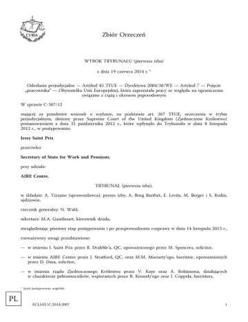 Zbiór Orzeczeń WYROK TRYBUNAŁU (pierwsza izba) z dnia 19 czerwca 2014 r. * Odesłanie prejudycjalne — Artykuł 45 TFUE — Dyrektywa 2004/38/WE — Artykuł 7 — Pojęcie „pracownika” — Obywatelka Unii Europejskiej, która zaprzestała pracy ze względu na ograniczenia związane z ciążą i okresem poporodowym W sprawie C-507/12 mającej za przedmiot wniosek o wydanie, na podstawie art. 267 TFUE, orzeczenia w trybie prejudycjalnym, złożony przez Supreme Court of the United Kingdom (Zjednoczone Królestwo) postanowieniem z dnia 31 października 2012 r., które wpłynęło do Trybunału w dniu 8 listopada 2012 r., w postępowaniu: Jessy Saint Prix przeciwko Secretary of State for Work and Pensions, przy udziale: AIRE Centre, TRYBUNAŁ (pierwsza izba), w składzie: A. Tizzano (sprawozdawca), prezes izby, A. Borg Barthet, E. Levits, M. Berger i S. Rodin, sędziowie, rzecznik generalny: N. Wahl, sekretarz: M.A. Gaudissart, kierownik działu, uwzględniając pisemny etap postępowania i po przeprowadzeniu rozprawy w dniu 14 listopada 2013 r., rozważywszy uwagi przedstawione: — w imieniu J. Saint Prix przez R. Drabble’a, QC, upoważnionego przez M. Spencera, solicitor, — w imieniu AIRE Centre przez J. Stratford, QC, oraz M.M. Moriarty’ego, barrister, upoważnionych przez D. Dasa, solicitor, — w imieniu rządu Zjednoczonego Królestwa przez V. Kaye oraz A. Robinsona, działających w charakterze pełnomocników, wspieranych przez B. Kennely’ego oraz J. Coppela, barristers, * Język postępowania: angielski. PL ECLI:EU:C:2014:2007 1 WYROK Z DNIA 19.6.2014 R. – SPRAWA C-507/12 SAINT PRIX — w imieniu rządu polskiego przez B. Majczynę oraz M. Szpunara, działających w charakterze pełnomocników, — w imieniu Komisji Europejskiej przez C. Tufvessona oraz J. Enegrena i M. Wilderspina, działających w charakterze pełnomocników, — w imieniu Autorité de surveillance AELE przez X. Lewisa oraz M. Moustakali i C. Howdle, działające w charakterze pełnomocników, po zapoznaniu się z opinią rzecznika generalnego na posiedzeniu w dniu 12 grudnia 2013 r., wydaje następujący Wyrok 1 Wniosek o wydanie orzeczenia w trybie prejudycjalnym dotyczy wykładni art. 45 TFUE i art. 7 dyrektywy 2004/38/WE Parlamentu Europejskiego i Rady z dnia 29 kwietnia 2004 r. w sprawie prawa obywateli Unii i członków ich rodzin do swobodnego przemieszczania się i pobytu na terytorium państw członkowskich, zmieniającej rozporządzenie (EWG) nr 1612/68 i uchylającej dyrektywy 64/221/EWG, 68/360/EWG, 72/194/EWG, 73/148/EWG, 75/34/EWG, 75/35/EWG, 90/364/EWG, 90/365/EWG i 93/96/EWG (Dz.U. L 158, s. 77; sprostowania Dz.U. L 229, s. 35 i Dz.U. 2005, L 197, s. 34 – wyd. spec. w jęz. polskim, rozdz. 5, t. 5, s. 46). 2 Wniosek ten został złożony w ramach sporu pomiędzy J. Saint Prix a Secretary of State for Work and Pensions (sekretarzem stanu właściwym w sprawach z zakresu zatrudnienia i emerytur, zwanym dalej „Secretary of State”) w przedmiocie wydanej przez Secretary of State odmowy przyznania J. Saint Prix zasiłku socjalnego. Ramy prawne Prawo Unii 3 Motywy 2–4 i 31 dyrektywy 2004/38 mają następujące brzmienie: „(2) Swobodny przepływ osób stanowi jedną z podstawowych swobód rynku wewnętrznego obejmującego przestrzeń bez granic wewnętrznych, gdzie swoboda ta jest zapewniona zgodnie z postanowieniami traktatu [WE]. (3) Obywatelstwo Unii powinno stanowić podstawowy status obywateli państw członkowskich, w przypadku gdy korzystają z prawa do swobodnego przemieszczania się i pobytu. Należy zatem skodyfikować i zweryfikować istniejące instrumenty wspólnotowe, które traktują oddzielnie pracowników najemnych, osoby pracujące na własny rachunek, studentów i inne osoby niezatrudnione w celu uproszczenia i wzmocnienia prawa do swobodnego przemieszczania się i pobytu wszystkich obywateli Unii. (4) Aby odejść od takiego sektorowego i fragmentarycznego podejścia do prawa swobodnego przemieszczania się i pobytu oraz ułatwić korzystanie z tego prawa, należy przygotować jeden akt prawny, który wprowadzi zmiany w rozporządzeniu Rady (EWG) nr 1612/68 z dnia 15 października 1968 r. w sprawie swobodnego przepływu pracowników wewnątrz Wspólnoty [(Dz.U. L 257, s. 2 – wyd. spec. w jęz. polskim, rozdz. 5, t. 1, s. 15), rozporządzenie ostatnio zmienione rozporządzeniem (EWG) nr 2434/92 (Dz.U. L 245, s. 1 – wyd. spec. w jęz. polskim, rozdz. 5, t. 2, s. 69)] oraz uchyli następujące akty: dyrektywę Rady 68/360/EWG z dnia 2 ECLI:EU:C:2014:2007 WYROK Z DNIA 19.6.2014 R. – SPRAWA C-507/12 SAINT PRIX 15 października 1968 r. w sprawie zniesienia ograniczeń w przemieszczaniu się i pobycie pracowników państw członkowskich i ich rodzin we Wspólnocie [(Dz.U. L 257, s. 13 – wyd. spec. w jęz. polskim, rozdz. 5, t. 1, s. 27), dyrektywę Rady 73/148/EWG z dnia 21 maja 1973 r. w sprawie zniesienia ograniczeń w zakresie przemieszczania się i pobytu obywateli państw członkowskich wewnątrz Wspólnoty, które dotyczą przedsiębiorczości i świadczenia usług [(Dz.U. L 172, s. 14 – wyd. spec. w jęz. polskim, rozdz. 5, t. 1, s. 167)], dyrektywę Rady 90/364/EWG z dnia 28 czerwca 1990 r. w sprawie prawa pobytu [(Dz.U. L 180, s. 26 – wyd. spec. w jęz. polskim, rozdz. 20, t. 1, s. 3)], dyrektywę Rady 90/365/EWG z dnia 28 czerwca 1990 r. w sprawie prawa pobytu pracowników i osób prowadzących działalność na własny rachunek, które zakończyły działalność zawodową [(Dz.U. L 180, s. 28)] i dyrektywę Rady 93/96/EWG z dnia 29 października 1993 r. w sprawie prawa pobytu dla studentów [(Dz.U. L 317, s. 59 – wyd. spec. w jęz. polskim, rozdz. 20, t. 1, s. 5)]. […] (31) Niniejsza dyrektywa przestrzega podstawowych praw i wolności oraz stosuje się do zasad uznanych w szczególności przez Kartę praw podstawowych Unii Europejskiej. Zgodnie z zakazem dyskryminacji zawartej w [k]arcie, państwa członkowskie powinny wdrożyć niniejs