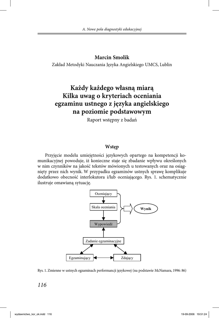A. Nowe pola diagnostyki edukacyjnej Marcin Smolik Zakład Metodyki Nauczania Języka Angielskiego UMCS, Lublin Każdy każdego własną miarą Kilka uwag o kryteriach oceniania egzaminu ustnego z języka angielskiego na poziomie podstawowym Raport wstępny z badań Wstęp Przyjęcie modelu umiejętności językowych opartego na kompetencji komunikacyjnej powoduje, iż konieczne staje się zbadanie wpływu określonych w nim czynników na jakość tekstów mówionych u testowanych oraz na osiągnięty przez nich wynik. W przypadku egzaminów ustnych sprawę komplikuje dodatkowo obecność interlokutora i/lub oceniającego. Rys. 1. schematycznie ilustruje omawianą sytuację. Oceniający Skala oceniania Wynik Wypowiedź Zadanie egzaminacyjne Egzaminujący Zdający Rys. 1. Zmienne w ustnych egzaminach performancji językowej (na podstawie McNamara, 1996: 86) 116 wydawnictwo_kor_ok.indd 116 19-09-2006 19:51:24 Marcin Smolik, Każdy każdego własną miarą Diagram ten wyraźnie pokazuje, iż uzyskiwany przez testowanego wynik nie jest, wbrew dość powszechnie panującemu przekonaniu, odzwierciedleniem poziomu opanowania umiejętności mówienia. To, czym zdający się wykaże, zależy nie tylko od niego, ale również od tego, na co pozwoli mu zadanie egzaminacyjne oraz osoba egzaminująca (Brown, 2005). Co więcej, ta w dużej mierze współtworzona wypowiedź (Jacoby i Ochs, 1995) podlega ocenie w wyniku interpretacji jej zawartości i jakości przez oceniającego, który patrzy nań przez pryzmat własnej interpretacji utworzonych dla egzaminu kryteriów oceniania, zazwyczaj dodatkowo odpowiednio zmodyfikowanej poprzez szkolenie w ich stosowaniu. Ostateczny wynik zawiera zatem echa wszystkich tych wpływów, co prowadzi McNamarę (1997) do stwierdzenia, iż wynik tyle samo mówi nam o testowanym, co o testującym. Problem Bez wątpienia kluczowym elementem w rozwikłaniu zagadki ‘Co ukrywa wynik?’, czyli odpowiedzi na fundamentalne pytanie dotyczące trafności interpretacji, jest zrozumienie, jaki wpływ na ów wynik ma oceniający. Jasne jest, że próba analizowania wpływu jednej zmiennej w oderwaniu od oddziaływania innych zmiennych nie rozwiąże całego problemu. Jednakże próba analizowania wszystkich zmiennych jednocześnie stwarza nierozwiązywalne na obecnym etapie problemy metodologiczne. Fakt, że możemy badać wpływ oceniających na wyniki egzaminu bez konieczności organizowania czasochłonnych i kosztowych schematów badawczych i tak zawdzięczamy pojawieniu się nowych metodologii (np. wieloaspektowego skalowania Rascha; por. Smolik, 2005). W przeważającej większości znanych mi egzaminów ustnych z języka obcego oceniający ustala wynik, wykorzystując do tego występującą pod różnymi nazwami skalę oceniania.1 W założeniu, skala oceniania jest niezbędnym składnikiem każdego egzaminu performancji językowej (praktycznego), gdyż stanowi operacjonalizację konstruktu, który podlega ocenie w każdym teście. Konstrukt sam w sobie jest hipotetycznym konceptem opisującym, zazwyczaj w dość ogólny, teoretyczny sposób, istotę „rzeczywistości” mentalnej podlegającą ocenie, w przypadku języków obcych najczęściej w odwołaniu do jednego lub kilku modeli umiejętności językowych lub do celów nauczania określonych w programie. Zadania egzaminacyjne oraz skala oceniania identyfikują zachowania (zmienne obserwowalne), które można uznać za przejaw tej hipotetycznej konstrukcji mentalnej. Skala oceniania jest zatem swoistego rodzaju 1 Ograniczenie w długości artykułu nie pozwala mi na dokładne omówienie ani typów stosowanych skal, ani sposobu ich tworzenia, pozwolę sobie zatem tylko podać źródła, gdzie informacje te można znaleźć: Alderson (1991), Brindley (1998), Fulcher (2003), Luoma (2004). 117 wydawnictwo_kor_ok.indd 117 19-09-2006 19:51:24 A. Nowe pola diagnostyki edukacyjnej kluczem do określenia poziomu wiedzy i umiejętności, leżących u podstaw zaobserwowanych zachowań (kwestia ta jest ogromnie problematyczna dla testowania języka obcego, szerzej omawiają ją McNamara (1996) oraz Smolik (w przygotowaniu). Z punktu widzenia twórców egzaminów ustnych kwestią absolutnie nadrzędną jest, aby wszyscy oceniający w sposób możliwie identyczny rozumieli i używali zawartych w skali deskryptorów. Innymi słowy, konieczne jest ocenianie według tych samych standardów; tylko wówczas będziemy mogli mówić o ocenianiu wypowiedzi testowanych w sposób porównywalny. Jeżeli oceniający odmiennie rozumieją zawarte w skali opisy, mogą w różny sposób (w sensie ilości przyznanych punktów) oceniać wypowiedzi jakościowo podobne, bądź w podobny sposób oceniać wypowiedzi jakościowo całkowicie odmienne. W konsekwencji, prowadzi to do sytuacji, w której każdy wynik znaczy zupełnie coś innego i niemożliwe staje się zinterpretowanie go w oderwaniu od osoby, która dokonała oceny. John H.A.L. de Jong w sposób odrobinę przewrotny proponuje, aby w przypadku wykrycia takiej sytuacji do każdego wyniku dołączać nazwisko oceniającego i jego curriculum vitae, bo tylko wówczas wynik stałby się interpretowalny (forum internetowe LTEST-L, post z 14 lipca 2006). Proszę zauważyć, iż w takiej sytuacji patrzenie na porównywalność oceniania jedynie poprzez pryzmat wysokich wskaźników korelacji zgodności sędziów (zarówno w sensie stałości oceniania jak i zgodności pomiędzy oceniającymi) jest – choć wysoce pożądane – niewystarczające. Ta sama liczba punktów może bowiem opisywać zupełnie inną jakość lub być wynikiem zastosowania, tak naprawdę, zupełnie innych kryteriów. Psychometryczne wskaźniki stają się wówczas w dużej mierze bezużyteczne, gdyż informują nas jedynie, iż oceniający zgadzają się w swoich ocenach dwóch zupełnie różnych kwestii. To trochę tak, jakby cieszyć się z wysokiej dodatniej korelacji pomiędzy wzrostem a poziomem inteligencji. Powyż