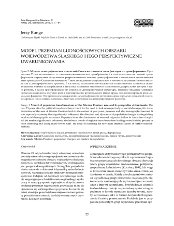 Acta Geographica Silesiana, 21. WNoZ UŚ, Sosnowiec, 2016, s. 77–84 ISSN 1897–5100 Jerzy Runge Uniwersytet Śląski, Wydział Nauk o Ziemi, ul. Będzińska 60, 41-200 Sosnowiec; e-mail: [email protected] MODEL PRZEMIAN LUDNOŚCIOWYCH OBSZARU WOJEWÓDZTWA ŚLĄSKIEGO I JEGO PERSPEKTYWICZNE UWARUNKOWANIA Рунге Е. Модель демографических изменений Силезского воеводства и факторы их трансформации. Прошедшее 25 лет политических и социально-экономических преобразований в ходе постсоциалистичекой трансформации определяют актуальность ретроспективного анализа демографической и социальной составляющей этих процессов в Силезском воеводстве. Такие исследования актуальны как в контексте ретроспективного анализа, как и демографического прогноза. В частности, экономическое воздействие хозяйственного комплекса оказало сильное влияние на направления и динамику изменений численности населения индустриальных центров и всего региона, а также трансформацию их социально-демографической структуры. Внешние трудовые миграции перестали выполнять ведущую роль в формировании регионального рынка труда, что активизировало роль локальных факторов. Это проявилось в сокращении демографического потенциала ряда городских поселений и активизировало поиск новых, в основном местных, источников их демографического развития. Runge J. Model of population transformations of the Silesian Province area and its perspective determinants. The past 25 years after the political transformation account for the need to look retrospectively at social -demographic transformations of the area of Silesian Province both in the context of past years, presence and also demographic forecast. It was especially economy that significantly influenced the direction and dynamics of population changes distinguishing local social-demographic structures. Departure from the domination of external migration inflow in formation of regional job market significantly influenced the hitherto trends of regional transformations leading to multi-sided process of town shrinking and facing many towns with the need of searching for new more internal factors of further transfor mations. Słowa kluczowe: województwo śląskie, przemiany ludnościowe, rynek pracy, depopulacja Ключевые слова: Силезское воеводство, демографическая трансформация, рынок труда, депопуляция Key words: Silesian Province, population changes, job market, depopulation Zarys treści WPROWADZENIE Minione 25 lat po transformacji ustrojowej uzasadnia potrzebę retrospektywnego spojrzenia na przemiany demograficzno-społeczne obszaru województwa śląskiego, zarówno w kontekście lat wcześniejszych, teraźniejszości, jak i prognoz demograficznych. Szczególnie gospodarka silnie rzutowała na kierunek i dynamikę zmian ludnościowych, różnicując lokalne struktury demograficznospołeczne. Odejście od dominacji zewnętrznego zasilania migracyjnego w kształtowaniu regionalnego rynku pracy w znaczący sposób wpłynęło na dotychczasowe tendencje przemian regionalnych, prowadząc m. in. do ujawnienia się wieloaspektowego procesu kurczenia się miast, stawiając przed wieloma miejscowościami potrzebę poszukiwania nowych, bardziej wewnętrznych czynników dalszych przemian. Z przeglądu dotychczasowego piśmiennictwa geograficzno-ekonomicznego wynika, iż o przemianach społeczno-gospodarczych dowolnego obszaru decydują cztery grupy czynników: środowiskowe, polityczne, gospodarcze, ludnościowe (KUCIŃSKI, 1998). Ich waga w kreowaniu zmian może być taka sama, różna, jak i zmienna w czasie. Każdy z tych czynników stanowi wypadkową grupy elementów cząstkowych, niekoniecznie zmieniających się harmonijnie w czasie wraz z innymi czynnikami. Przykładowo, czynnik środowiskowy rzutuje na przemiany społeczno-gospodarcze w formie stymulant (zasoby terenu, zasoby surowcowe), jak i w formie destymulant (ograniczenia i bariery przestrzenne). Podobnie jest w przypadku pozostałych grup czynników przemian spo- 77 łeczno-gospodarczych. I tak, zmiany ludnościowe są pochodną elementów ruchu naturalnego i migracji, ale mogą także stanowić konsekwencję zdeformowanych struktur ludnościowych (znaczna feminizacja, niedobór aktywnych zawodowo grup wieku, czy też duża monofunkcyjność struktury pracujących). O ile na poziomie pojedynczych miejscowości, a nawet aglomeracji miejskich, identyfikacja kierunku przemian raczej nie nastręcza problemu, o tyle w przypadkach złożonych układów osadniczych typu konurbacji możemy się spotkać z nakładaniem się na siebie zmian, nieco odmiennych co do dynamiki, jak i kierunku. Owo bezpośrednie sąsiedztwo jednostek terytorialnych to koincydencja, która może mieć wymiar mnożnikowy w sytuacji zgodności kierunku zmian. Na przykład, lokalizacja Fabryki Opla w Gliwicach spowodowała nie tylko wzrost liczby miejsc pracy w tym mieście, ale przyczyniła się też do pojawienia w bliższym i dalszym sąsiedztwie dodatkowych miejsc pracy branży samochodowej (produkcja części, naprawa, stacje diagnost