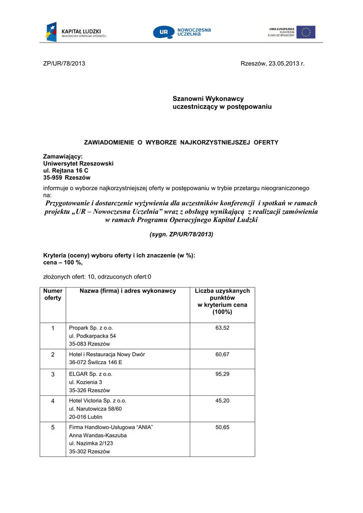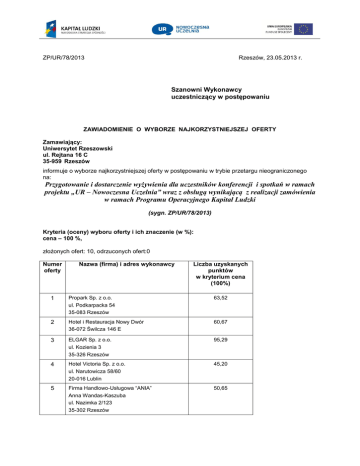Rzeszów, 23.05.2013 r. ZP/UR/78/2013 Szanowni Wykonawcy uczestniczący w postępowaniu ZAWIADOMIENIE O WYBORZE NAJKORZYSTNIEJSZEJ OFERTY Zamawiający: Uniwersytet Rzeszowski ul. Rejtana 16 C 35-959 Rzeszów informuje o wyborze najkorzystniejszej oferty w postępowaniu w trybie przetargu nieograniczonego na: Przygotowanie i dostarczenie wyżywienia dla uczestników konferencji i spotkań w ramach projektu „UR – Nowoczesna Uczelnia” wraz z obsługą wynikającą z realizacji zamówienia w ramach Programu Operacyjnego Kapitał Ludzki (sygn. ZP/UR/78/2013) Kryteria (oceny) wyboru oferty i ich znaczenie (w %): cena – 100 %, złożonych ofert: 10, odrzuconych ofert:0 Numer oferty Nazwa (firma) i adres wykonawcy Liczba uzyskanych punktów w kryterium cena (100%) 1 Propark Sp. z o.o. ul. Podkarpacka 54 35-083 Rzeszów 63,52 2 Hotel i Restauracja Nowy Dwór 36-072 Świlcza 146 E 60,67 3 ELGAR Sp. z o.o. ul. Kozienia 3 35-326 Rzeszów 95,29 4 Hotel Victoria Sp. z o.o. ul. Narutowicza 58/60 20-016 Lublin 45,20 5 Firma Handlowo-Usługowa “ANIA” Anna Wandas-Kaszuba ul. Nazimka 2/123 35-302 Rzeszów 50,65 6 Hotel „Trzy Korony” Z. Kobylańska, M. Łyczka, M. Kata s.c. ul. Wola Cicha 146 36-Głogów Młp. 54,54 7 Hotel Dymarka Sp. z o.o. Dąbrówki 431 37-100 Łańcut 87,09 8 Firma Usługowo Cateringowa „KASKADA” ul. Ćwiklińskiej 2 35-601 Rzeszów 100,00 9 SKAW-MAR Małgorzata Skawina-Babiarz, Marcin Szczepka Pl. Dworcowy 1 35-201 Rzeszów 60,00 Firma „ANGRE” Sp. Jawna Aneta Masłyk, Grzegorz Pytko ul. Osiedlowa 4 36-200 Brzozów 42,85 10 Wybrana oferta Wykonawcy: Firma Usługowo Cateringowa „KASKADA” ul. Ćwiklińskiej 2 35-601 Rzeszów Uzasadnienie prawne: art.91 ust.1 ustawy Pzp Uzasadnienie faktyczne: oferta najkorzystniejsza, spełniająca warunki SIWZ, niepodlegająca odrzuceniu. Dziękujemy Państwu za złożenie oferty i udział w przetargu. Z poważaniem z up. Prorektora UR Samodzielny Referent ds. Zamówień Publicznych mgr Adam Zwoliński Otrzymują: tablica ogłoszeń www.univ.rzeszow.pl a/a DZP 2