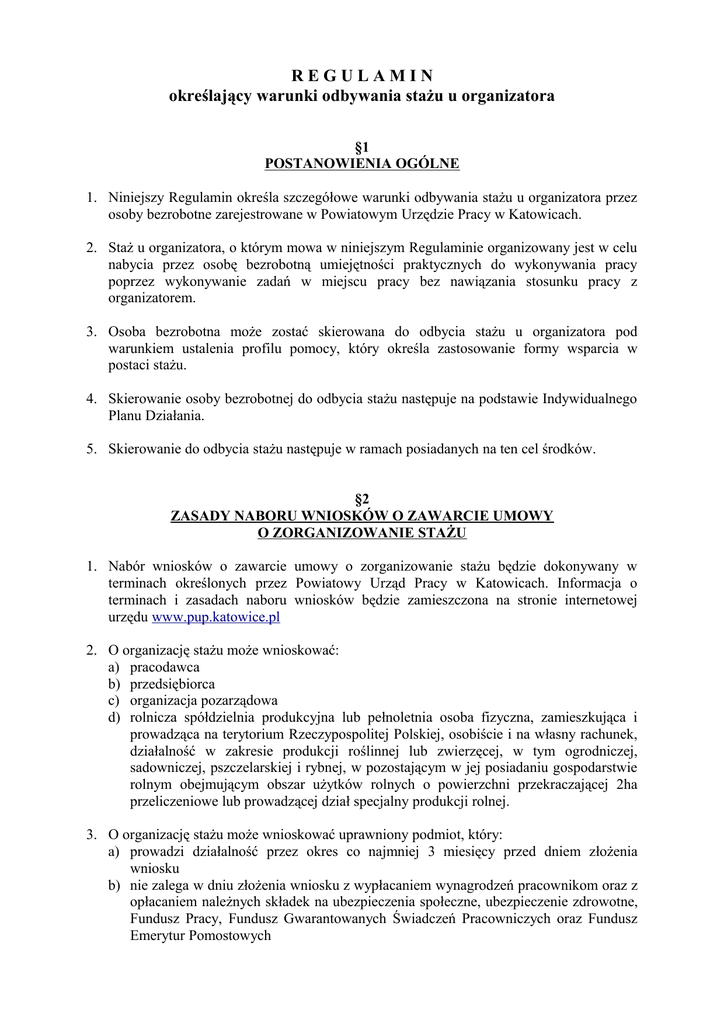REGULAMIN określający warunki odbywania stażu u organizatora §1 POSTANOWIENIA OGÓLNE 1. Niniejszy Regulamin określa szczegółowe warunki odbywania stażu u organizatora przez osoby bezrobotne zarejestrowane w Powiatowym Urzędzie Pracy w Katowicach. 2. Staż u organizatora, o którym mowa w niniejszym Regulaminie organizowany jest w celu nabycia przez osobę bezrobotną umiejętności praktycznych do wykonywania pracy poprzez wykonywanie zadań w miejscu pracy bez nawiązania stosunku pracy z organizatorem. 3. Osoba bezrobotna może zostać skierowana do odbycia stażu u organizatora pod warunkiem ustalenia profilu pomocy, który określa zastosowanie formy wsparcia w postaci stażu. 4. Skierowanie osoby bezrobotnej do odbycia stażu następuje na podstawie Indywidualnego Planu Działania. 5. Skierowanie do odbycia stażu następuje w ramach posiadanych na ten cel środków. §2 ZASADY NABORU WNIOSKÓW O ZAWARCIE UMOWY O ZORGANIZOWANIE STAŻU 1. Nabór wniosków o zawarcie umowy o zorganizowanie stażu będzie dokonywany w terminach określonych przez Powiatowy Urząd Pracy w Katowicach. Informacja o terminach i zasadach naboru wniosków będzie zamieszczona na stronie internetowej urzędu www.pup.katowice.pl 2. O organizację stażu może wnioskować: a) pracodawca b) przedsiębiorca c) organizacja pozarządowa d) rolnicza spółdzielnia produkcyjna lub pełnoletnia osoba fizyczna, zamieszkująca i prowadząca na terytorium Rzeczypospolitej Polskiej, osobiście i na własny rachunek, działalność w zakresie produkcji roślinnej lub zwierzęcej, w tym ogrodniczej, sadowniczej, pszczelarskiej i rybnej, w pozostającym w jej posiadaniu gospodarstwie rolnym obejmującym obszar użytków rolnych o powierzchni przekraczającej 2ha przeliczeniowe lub prowadzącej dział specjalny produkcji rolnej. 3. O organizację stażu może wnioskować uprawniony podmiot, który: a) prowadzi działalność przez okres co najmniej 3 miesięcy przed dniem złożenia wniosku b) nie zalega w dniu złożenia wniosku z wypłacaniem wynagrodzeń pracownikom oraz z opłacaniem należnych składek na ubezpieczenia społeczne, ubezpieczenie zdrowotne, Fundusz Pracy, Fundusz Gwarantowanych Świadczeń Pracowniczych oraz Fundusz Emerytur Pomostowych c) nie zalega w dniu złożenia wniosku z opłacaniem innych danin publicznych d) nie posiada w dniu złożenia wniosku nieuregulowanych w terminie zobowiązań cywilnoprawnych e) nie jest objęty postępowaniem upadłościowym oraz nie jest w stanie likwidacji f) nie został ukarany w okresie 2 lat przed dniem złożenia wniosku za przestępstwo przeciwko obrotowi gospodarczemu w rozumieniu ustawy z dnia 6 czerwca 1997r. Kodeks karny lub ustawy z dnia 28 października 2002r. o odpowiedzialności podmiotów zbiorowych za czyny zabronione pod groźbą kary. 4. Skierowanie osoby bezrobotnej do odbycia stażu następuje na podstawie złożonego przez organizatora Wniosku o zawarcie umowy o zorganizowanie stażu. 5. Wniosek niekompletnie wypełniony lub bez wymaganych załączników nie podlega rozpatrzeniu. 6. Do wniosku o zawarcie umowy o zorganizowanie stażu wnioskodawca składa następujące dokumenty: a) kserokopia aktualnego dokumentu poświadczającego formę prawną wnioskodawcy (np. KRS, statut, akt powołania, itp.; nie dotyczy osób fizycznych prowadzących działalność gospodarczą). W przypadku spółki cywilnej do wniosku należy dołączyć umowę spółki b) pełnomocnictwo do reprezentowania wnioskodawcy (jeśli dotyczy) c) w przypadku, gdy miejsce odbywania stażu nie wynika z dokumentów rejestrowych wnioskodawcy, dokument (np. umowa najmu, dzierżawy, inne) potwierdzający prawo do dysponowania lokalem wskazanym jako miejsce odbywania stażu. 7. O uwzględnieniu lub odmowie uwzględnienia wniosku urząd informuje wnioskodawcę w terminie 30 dni od dnia złożenia wniosku. 8. Do realizacji będą przyjęte wnioski organizatorów, którzy deklarują zatrudnienie 100% stażystów po odbytym stażu. 9. Organizator zobowiązuje się do zatrudnienia bezrobotnego bezpośrednio po okresie odbywania stażu przez okres co najmniej 3 miesięcy w pełnym wymiarze czasu pracy za wynagrodzeniem miesięcznym w wysokości co najmniej minimalnego wynagrodzenia za pracę określonego w Rozporządzeniu Rady Ministrów w sprawie wysokości minimalnego wynagrodzenia za pracę lub nawiązania z bezrobotnym umowy zlecenia przez okres co najmniej 3 miesięcy, której wymiar zadań odpowiadałby pełnemu wymiarowi czasu pracy przewidzianemu dla umowy o pracę za wynagrodzeniem miesięcznym w wysokości co najmniej minimalnego wynagrodzenia za pracę określonego w Rozporządzeniu Rady Ministrów w sprawie wysokości minimalnego wynagrodzenia za pracę. 10. Do realizacji nie będą kwalifikowane wnioski organizatorów, którzy nie wywiązali się z deklaracji zatrudnienia w ramach realizowanych z urzędem umów stażowych w roku poprzednim i bieżącym. 11. W przypadku niewywiązania się przez organizatora z obowiązku określonego w § 2 pkt 9 Regulaminu z przyczyn leżących po stronie organizatora, organizator nie będzie mógł skorzystać ze środków Funduszu Pracy oraz Europejskiego Funduszu Społecznego będących w dyspozycji Powiatowego Urzędu Pracy w Katowicach przeznaczonych na aktywizację zawodową osób bezrobotnych w ramach umów o zorganizowanie stażu, przez okres 12 miesięcy od daty zakończenia umowy. §3 ZASADY I WARUNKI ODBYWANIA STAŻU U ORGANIZATORA 1. Urząd może skierować osobę bezrobotną do odbycia stażu na okres nie krótszy niż 3 miesiące i nie dłuższy niż 6 miesięcy. 2. Urząd może skierować do odbycia stażu na okres do 12 miesięcy osobę bezrobotną, która nie ukończyła 30 roku życia. 3. Stażu u organizatora nie może odbywać bezrobotny o stopniu pokrewieństwa: a) małżonek organizatora b) rodzic organizatora c) rodzeństwo organizatora d) dziecko własne lub przysposobione organizatora, małżonka organizatora, ro