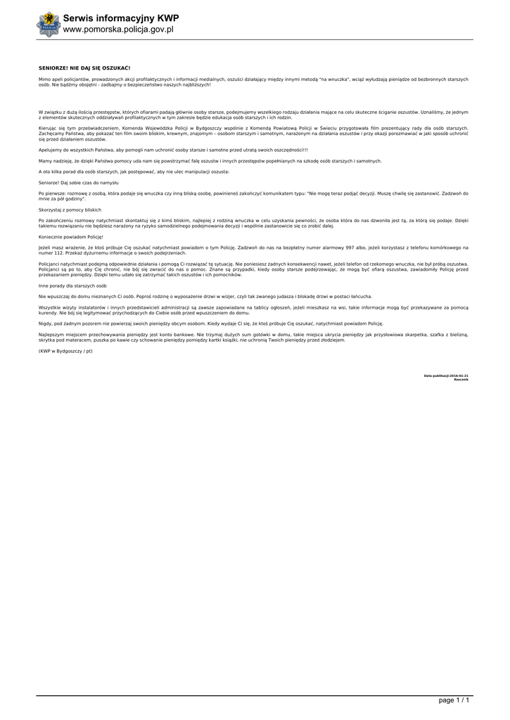 Serwis informacyjny KWP www.pomorska.policja.gov.pl SENIORZE! NIE DAJ SIĘ OSZUKAĆ! Mimo apeli policjantów, prowadzonych akcji profilaktycznych i informacji medialnych, oszuści działający między innymi metodą "na wnuczka", wciąż wyłudzają pieniądze od bezbronnych starszych osób. Nie bądźmy obojętni - zadbajmy o bezpieczeństwo naszych najbliższych! W związku z dużą ilością przestępstw, których ofiarami padają głównie osoby starsze, podejmujemy wszelkiego rodzaju działania mające na celu skuteczne ściganie oszustów. Uznaliśmy, że jednym z elementów skutecznych oddziaływań profilaktycznych w tym zakresie będzie edukacja osób starszych i ich rodzin. Kierując się tym przeświadczeniem, Komenda Wojewódzka Policji w Bydgoszczy wspólnie z Komendą Powiatową Policji w Świeciu przygotowała film prezentujący rady dla osób starszych. Zachęcamy Państwa, aby pokazać ten film swoim bliskim, krewnym, znajomym – osobom starszym i samotnym, narażonym na działania oszustów i przy okazji porozmawiać w jaki sposób uchronić się przed działaniem oszustów. Apelujemy do wszystkich Państwa, aby pomogli nam uchronić osoby starsze i samotne przed utratą swoich oszczędności!!! Mamy nadzieję, że dzięki Państwa pomocy uda nam się powstrzymać falę oszustw i innych przestępstw popełnianych na szkodę osób starszych i samotnych. A oto kilka porad dla osób starszych, jak postępować, aby nie ulec manipulacji oszusta: Seniorze! Daj sobie czas do namysłu Po pierwsze: rozmowę z osobą, która podaje się wnuczka czy inną bliską osobę, powinieneś zakończyć komunikatem typu: "Nie mogę teraz podjąć decyzji. Muszę chwilę się zastanowić. Zadzwoń do mnie za pół godziny". Skorzystaj z pomocy bliskich Po zakończeniu rozmowy natychmiast skontaktuj się z kimś bliskim, najlepiej z rodziną wnuczka w celu uzyskania pewności, że osoba która do nas dzwoniła jest tą, za którą się podaje. Dzięki takiemu rozwiązaniu nie będziesz narażony na ryzyko samodzielnego podejmowania decyzji i wspólnie zastanowicie się co zrobić dalej. Koniecznie powiadom Policję! Jeżeli masz wrażenie, że ktoś próbuje Cię oszukać natychmiast powiadom o tym Policję. Zadzwoń do nas na bezpłatny numer alarmowy 997 albo, jeżeli korzystasz z telefonu komórkowego na numer 112. Przekaż dyżurnemu informacje o swoich podejrzeniach. Policjanci natychmiast podejmą odpowiednie działania i pomogą Ci rozwiązać tę sytuację. Nie poniesiesz żadnych konsekwencji nawet, jeżeli telefon od rzekomego wnuczka, nie był próbą oszustwa. Policjanci są po to, aby Cię chronić, nie bój się zwracić do nas o pomoc. Znane są przypadki, kiedy osoby starsze podejrzewając, że mogą być ofiarą oszustwa, zawiadomiły Policję przed przekazaniem pieniędzy. Dzięki temu udało się zatrzymać takich oszustów i ich pomocników. Inne porady dla starszych osób Nie wpuszczaj do domu nieznanych Ci osób. Poproś rodzinę o wyposażenie drzwi w wizjer, czyli tak zwanego judasza i blokadę drzwi w postaci łańcucha. Wszystkie wizyty instalatorów i innych przedstawicieli administracji są zawsze zapowiadane na tablicy ogłoszeń, jeżeli mieszkasz na wsi, takie informacje mogą być przekazywane za pomocą kurendy. Nie bój się legitymować przychodzących do Ciebie osób przed wpuszczeniem do domu. Nigdy, pod żadnym pozorem nie powierzaj swoich pieniędzy obcym osobom. Kiedy wydaje Ci się, że ktoś próbuje Cię oszukać, natychmiast powiadom Policję. Najlepszym miejscem przechowywania pieniędzy jest konto bankowe. Nie trzymaj dużych sum gotówki w domu, takie miejsca ukrycia pieniędzy jak przysłowiowa skarpetka, szafka z bielizną, skrytka pod materacem, puszka po kawie czy schowanie pieniędzy pomiędzy kartki książki, nie uchronią Twoich pieniędzy przed złodziejem. (KWP w Bydgoszczy / pt) Data publikacji:2016-01-21 Rzecznik page 1 / 1 Powered by TCPDF (www.tcpdf.org)