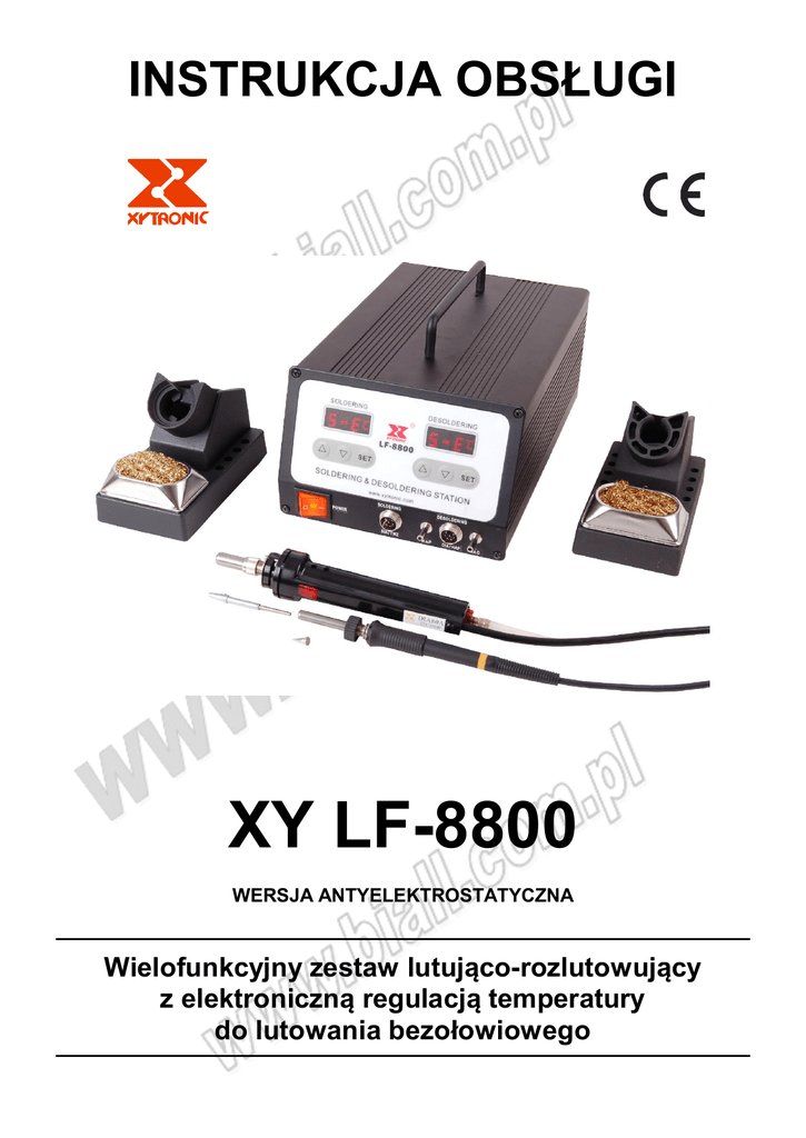 INSTRUKCJA OBSŁUGI XY LF-8800 WERSJA ANTYELEKTROSTATYCZNA Wielofunkcyjny zestaw lutująco-rozlutowujący z elektroniczną regulacją temperatury do lutowania bezołowiowego GRATULUJEMY ZAKUPU STACJI LUTOWNICZEJ XY LF-8800 Stacja lutownicza XY LF-9000 firmy Xytronic została zaprojektowana tak, aby zaspokoić obecne i przyszłe potrzeby przemysłu elektronicznego w zakresie lutowania bezołowiowego. Liczne zalety produktów firmy Xytronic powodują, że są to idealne narzędzia zarówno w serwisie, jak i w produkcji. Przed przystąpieniem do uruchomienia i obsługi urządzenia należy dokładnie zapoznać się z instrukcją obsługi. OSTROŻNIE Urządzenie nie jest przeznaczone do obsługi przez dzieci lub osoby, które nie są w stanie posługiwać się urządzeniem w sposób bezpieczny ze względu na brak predyspozycji psychicznych, zmysłowych lub manualnych. Należy chronić te osoby przed dostępem do urządzenia. Dzieci powinny być pod specjalną opieką aby nie mogły używać urządzenia np. do zabawy Niedostateczne przestrzeganie wymogów bezpieczeństwa może stanowić ryzyko utraty życia lub zranienia użytkownika Producent i dystrybutor nie biorą odpowiedzialności za uszkodzenia powstałe w wyniku nieprawidłowego użytkowania zestawu lub nieautoryzowanych przeróbek lub ingerencji UWAGA Zawsze, jeżeli nie są używane należy kolbę lutownicy i kolbę rozlutownicy umieszczać w oryginalnych podstawkach Podczas pracy grot lutownicy i dyszę rozlutownicy oraz elementy grzejne należy trzymać w oddaleniu od ciała, ubrania i palnych materiałów Grot lutownicy, dysza rozlutownicy oraz elementy grzejne pozostają wciąż gorące po wyłączeniu zasilania. Należy zapewnić ochronę przed dotykiem tych elementów Dla ochrony zdrowia unikać wdychania oparów lutowniczych -2- Użytkownik nie może podejmować żadnych czynności związanych z obwodami pod napięciem. Tylko przeszkolony personel techniczny może przeprowadzać naprawy (autoryzowany serwis dystrybutora). Do napraw należy używać wyłącznie oryginalnych części zamiennych. 1. CHARAKTERYSTYKA ZESTAWU SYGNALIZACJA USZKODZENIA GRZAŁKI/CZUJNIKA TEMP Jeżeli jest uszkodzony obwód czujnika temperatury to sygnalizowane to jest komunikatem „S--E” na wyświetlaczu, jednocześnie następuje odłączenie zasilania grzałki. Jeżeli jest uszkodzony obwód grzałki na wyświetlaczu pojawia się komunikat „H--E”, jednocześnie następuje odłączenie zasilania grzałki BLOKADA ZADANEJ TEMPERATURY Zadana temperatura pracy może być chroniona hasłem kodowym co jest bardzo użyteczne dla zarządzania np. linią produkcyjną OCHRONA ANTYELEKTROSTATYCZNA I UKŁADY ELEKTRONICZNE NIE WYTWARZAJĄCE PRZEPIĘĆ Układ włączania w „zerze” chroni wrażliwe elementy elektroniczne (np. układy CMOS), gdyż na grocie nie występują chwilowe impulsy napięciowe, jakie mogą się pojawiać w innych stacjach lutowniczych, nie posiadających takich układów zabezpieczających. ODSYSACZ Z OPÓŹNIONYM WYŁĄCZANIEM W celu wyeliminowania problemu gromadzenia się resztek lutu na grocie rozlutowniczym, zestaw wyposażono w funkcję przedłużenia czasu pracy pompy odsysacza. Dzięki tej funkcji, po zwolnieniu wyłącznika, odsysacz pracuje jeszcze przez 1,5 sekundy. LEKKA KOLBA LUTOWNICZA Ergonomiczna mini kolba lutownicza zapewnia odpowiednie chłodzenie rączki i wygodną pracę OSZCZĘDNOŚĆ ENERGII Stacja lutownicza automatycznie przełącza się w stan czuwania automatyczniepo 20 minutach bezczynności z obniżeniem temperatury grota o 150 °C w stosunku do zadanej temperatury. Aktywacja kolby lutowniczej lub rozlutowniczej wywołuje aktywację pełnego zasilania i temperatura grota/dyszy powraca momentalnie do zadanej temperatury. Po czasie dłuższym niż 40 minut bezczynności następuje -3- samoczynne odłączenie zasilania i stacja przechodzi w stan „uśpienia” co ogranicza zużycie energii i wydłuża żywotność grota. Uwaga: W celu opuszczenia trybu „uśpienia” należy wyłączyć stację wyłącznikiem (doprowadzić do pozycji „OFF”) i następnie ponownie włączyć stację. OPCJONALNA PRACA NARZĘDZI Zarówno lutownica jak rozlutownica mogą pracować jednocześnie w tym samym czasie lub osobno. Wciśnięcie przycisków „SET + ▲” pozwala na wybór pracy lutownicy lub rozlutownicy. W tym momencie lutownica/rozlutownica wyłącza zasilanie. Jeżeli wciśniemy następnie przycisk „▼” to uruchomimy zasilanie odpowiednio lutownicy lub rozlutownicy. . OPCJONALNA PRACA Z LUTOWNICĄ PINCETOWĄ (TWZ90) Dodatkową zaletą jest możliwość współpracy z lutownicą pincetową (wyposażenie opcjonalne), który jest specjalnie zaprojektowany do prac z elementami SMD, SOT, płasko upakowanymi IC itd. TWZ90 może pracować zamiennie z lutownicą. Przy podłączaniu tweezera należy bezwzględnie upewnić się, że zasilanie stacji jest odłączone (wyłącznik w położeniu „OFF”) w celu uniknięcia możliwości uszkodzenia lutownicy 2. OPIS ZESTAWU LF-8800 zapewnia zasilanie lutownicy dużą mocą 32V/100W co jest specjalnie zaprojektowane dla spełnienia wymagań Dyrektywy RoHS dla lutowania i wylutowywanie elementów w technologii bezołowiowej. W urządzeniu zabudowana jest samodzielna, bezolejowa, bezobsługowa i cichobieżna pompa próżniowa, która jest kontrolowana elektronicznie i nie jest przeciążana nawet przy ciągłym użyciu co eliminuje konieczność stosowania zewnętrznych pomp powietrza. Pompa próżniowa wytwarza podciśnienie do 50 cmHg (20”Hg); jest to aktywowane przez wciśnięcie przycisku w rękojeści kolby rozlutowniczej. Wewnętrzny kolektor szklany do odsysanego lutowia może być łatwo i szybko demontowany w celu opróżnienia i czyszczenia. Umieszczona wewnątrz wkładka aluminiowa pozwala na schłodzanie odsysanego lutowia. Otwory wentylacyjne w rękojeści służące do chłodzenia zwiększają komfort obsługi LF-8800 zawiera układy elektroniczne pozwa