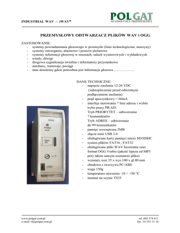 INDUSTRIAL WAV – iWAV AUTOMATYKA PRZEMYSŁOWA PRZEMYSŁOWY ODTWARZACZ PLIKÓW WAV i OGG ZASTOSOWANIE: - systemy powiadamiania głosowego w przemyśle (linie technologiczne, maszyny) - systemy ostrzegania, alarmowe i przeciw-pożarowe - systemy informacji głosowej w muzeach, salach wystawowych i wykładowych - windy, dźwigi - drogowa sygnalizacja świetlna i informatory przystankowe - autobusy, tramwaje, pociągi - inne dziedziny gdzie potrzebna jest informacja głosowa …………….. DANE TECHNICZNE: - napięcie zasilania 12-26 VDC (zabezpieczenie przed odwrotnym podłączeniem zasilania) - prąd spoczynkowy < 60mA - interfejs sterowania 7 linii adresu i wybór trybu pracy PR/AD: Tryb PRIORYTET – odtworzenie 7 komunikatów Tryb ADRES – odtworzenie do 99 komunikatów - pamięć wewnętrzna 2MB - złącze mini USB 2.0 - obsługiwane karty pamięci micro SD/SDHC - system plików FAT16 , FAT32 - obsługiwane pliki WAV bezstratne oraz format OGG Vorbis (jakość lepsza od MP3 przy takim samym rozmiarze pliku) - wymiary szer.35 x wys.100 x gł.80 mm - obudowa z tworzywa PC/ABS - waga 150g - temperatura otoczenia -10 ÷ +50 °C - montaż na szynie TS35 www.polgat.com.pl e-mail: [email protected] tel. 605 574 611 fax 34 353 11 16 AUTOMATYKA PRZEMYSŁOWA PODŁĄCZENIA iWAV: Wykonanie A- zasilanie 12 lub 24 VDC: Stereo 2 x 3W , ( RL=8Ω ), Wykonanie B- zasilanie 12-26 VDC: Stereo 2 x (5W dla U=24V, RL=8Ω ); (2 W dla U=12V, RL=4Ω ) Strona 2 z 6 AUTOMATYKA PRZEMYSŁOWA OBSŁUGA Urządzenie iWAV przeznaczone jest do odtwarzania komunikatów głosowych nagranych w formacie WAV i OGG Vorbis. Komunikaty mogą być umieszczone w wewnętrznej pamięci urządzenia (format OGG) lub na karcie pamięci (format WAV). Proste sterowanie za pomocą 8 sygnałów, umożliwia łatwą integrację z dowolnym sterownikiem programowalnym. Na płycie czołowej znajdują się następujące elementy: Dwukolorowa dioda sygnalizuje stan pracy: - kolor zielony - sygnalizuje podanie napięcia zasilania. - kolor pomarańczowy - zapala się podczas odtwarzania nagrania Gniazdo na karty pamięci micro SD. Gniazdo karty pamięci nie posiada zaskoku, kartę należy wsunąć do poru. Potencjometr regulacji siły głosu. Przekręcenie potencjometru całkowicie w lewo, do zaskoku ,wyłącza wzmacniacz wewnętrzny. Gniazdo USB mini. Górna krawędź urządzenia: Złącze zasilania. Złącze sterowania. Złącze sygnalizacji odtwarzania – (opcja na zamówienie). Dolna krawędź urządzenia: Złącze do podłączenia głośników Wyjście liniowe audio stereo - JACK 3,5mm. Pamięć wewnętrzna. Po podłączeniu do komputera przez złącze USB odtwarzacz widoczny jest jako pamięć masowa o pojemności 2MB. Nie wymaga to instalacji żadnych dodatkowych sterowników. Podłączenie do komputera jednocześnie zasila urządzenie (bez wzmacniacza, pobór prądu 25 mA) i główne zasilanie powinno być wtedy odłączone. Do pamięci wewnętrznej są początkowo wgrane 64 komunikaty (liczby od 1 do 64), co umożliwia łatwe przetestowanie urządzenia. Następnie można przygotować i wgrać własne komunikaty. Łączny maksymalny czas nagrań w pamięci wewnętrznej wynosi od 2 do 4 minut zależnie od zastosowanej częstotliwości próbkowania i ustawionej jakości zapisu pliku OGG. Z pamięci wewnętrznej można odtworzyć maksymalnie 64 komunikaty w formacie OGG. Karta pamięci. Kartę pamięci należy sformatować w komputerze i nagrać na nią komunikaty. Po włożeniu karty odtwarzacz przełącza się automatycznie na odtwarzanie plików umieszczonych na niej i pomija pliki w pamięci wewnętrznej. Z karty pamięci można odtworzyć maksymalnie 99 komunikatów w formacie WAV. Strona 3 z 6 AUTOMATYKA PRZEMYSŁOWA STEROWANIE Wszystkie 8 torów sterujących posiada optoizolację. ZERO logiczne – poniżej 1V JEDYNKA logiczna – powyżej 4,5V Rezystancja wejściowa każdego toru 4,7kΩ Poniżej opisano możliwe tryby pracy. Wybór trybu pracy interfejsu sterowania Tor sterowania opisany jako PR/AD służy do wyboru trybu pracy odtwarzacza. 0 logiczne 1 logiczna Tryb PRIORYTET - PR Tryb ADRES - AD Tryb sterowania PRIORYTET Wejścia mają przypisane priorytety od 1 do 7. Najwyższy priorytet ma wejście 1, najniższy wejście 7 W tym trybie każdemu wejściu binarnemu przypisany jest jeden komunikat. Komunikat odtwarzany jest po podaniu JEDYNKI na wejście. Jeśli wysterowanie zostanie zdjęte, komunikat jest odtworzony do końca i następuje oczekiwanie na następne wysterowanie. Jeśli wejście pozostawimy wysterowane komunikat będzie powtarzany wielokrotnie. Wejście o wyższym priorytecie przerywa odtwarzanie komunikatu o niższym priorytecie i wyzwala odtwarzanie własnego komunikatu. Komunikatu z wejścia 1 (najwyższy priorytet) nie da się przerwać i musi zostać odtworzony do końca. Jeśli zakończy się odtwarzanie komunikatu o wyższym priorytecie ( i nie jest już wysterowany), a jednocześnie pozostało wysterowane wejście o niższym priorytecie to rozpocznie się odtwarzanie komunikatu przypisanego do tego wejścia. Tryb sterowania ADRES W tym trybie należy wybrać adres nagrania podając jedynkę logiczną na odpowiednie wejścia. Początek odtwarzania pliku następuje natychmiast po wybraniu adresu dlatego wszystkie bity wymaganego adresu powinny być wysterowane jednocześnie. Każdy plik jest odtwarzany do końca lub wielokrotnie jeśli adres jest ciągle wybrany. Zmiana adresu powoduje przerwanie odtwarzania aktualnego nagrania i rozpoczęcie odtwarzania innego. Po wyzerowaniu adresu aktualny plik jest odtworzony do końca po czym następuje oczekiwanie na kolejne wysterowanie. Strona 4 z 6 AUTOMATYKA PRZEMYSŁOWA Podczas przygotowywania nagrań należy pamiętać o pozostawieniu na początku każdego komunikatu ok. 0,2s ciszy. Jest to czas potrzebny na odblokowanie wzmacniacza, który w przerwach jest wyłączany dla obniżenia poboru prądu. Tabela adresacji i nazw plików: Tryb PR sygnały na wejściach