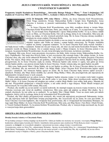 JEZUS CHRYSTUS KRÓL WSZECHŚWIATA DO POLAKÓW I WSZYSTKICH NARODÓW Fragmenty książki Kazimierza Domańskiego „ Jutrzenka Bożego Pokoju z Oławy ” -Tom I obejmujący 142 orędzia od 8 czerwca 1983 r. do 8 czerwca 1993 r., wydanie l. Oława 8.12.1996 r. Niepokalane Poczęcie N.M.P. : [112] 24 listopada 1991 roku Oława : Zbliża, się Jezus Chrystus Król Wszechświata. Obok Niego aniołowie, Święty Maksymilian Kolbe i ksiądz Jerzy Popiołuszko. Jezus Chrystus w koronie, w jasności nadziemskiej. Promienie biją na nas. Obok Króla jego słudzy: - Ja Jezus Chrystus Król Wszechświata, synu Mój, zszedłem dzisiaj w święto Moje, Chrystusa Króla Wszechświata. Patrz, jacy słudzy są ze mną. To są męczennicy z waszego kraju. To jest ksiądz Jerzy Popiołuszko i ojciec Maksymilian Kolbe. To są ci, którzy oddali życie za Mnie, za Chrystusa Króla. Oni szli tą drogą, którą Ja im wskazałem. Mój synu jak Serce się raduje, że tylu wiernych przybyło tutaj. Bo Ja Jezus Chrystus dzisiaj zszedłem i przekażę im swoje orędzie Chrystusa Króla. - Mój synu strasznie będzie się działo u was na ziemi, bo zeszło całe piekło na ziemię. Ale wkrótce zejdzie całe Niebo na ziemię i szatan będzie zniszczony, bo Wojsko Anielskie Śp.Kazimierz Domański zejdzie na ziemię i pogromi szatanów. To Ja Jezus Chrystus Król ześlę swoich Aniołów i oni będą toczyć walkę z szatanem. Szatan nie ma już więcej siły, ale mści się nad moim Kościołem Świętym. Wielu szatanów weszło do Mojej świątyni. Ale ci szatani muszą wyjść z Mojej świątyni. Ja Jezus Chrystus jestem w tej świątyni. Ja jestem Królem Wszechświata i Ja cały świat dźwignę tym Krzyżem, na którym zawisłem. - Pamiętaj, Mój synu, Krzyż wam przyniesie zwycięstwo, ten biały, który trzyma święty Maksymilian Kolbe i ks. Jerzy Popiołuszko. Oni mają dwa Krzyże białe, to jest zwycięstwo dla waszego kraju i dla całego świata. Ja Jezus Chrystus chcę, aby cały świat odmawiał Różaniec Św. i aby każdy był przygotowany bo będzie przyjście Chrystusa Króla. Nie znacie, Moje dzieci ani dnia, ani godziny, kiedy przyjdzie Chrystus Król na ziemię. Bądźcie Moje dzieci przygotowani, bo Ja Jezus Chrystus zejdę na ziemię. Wtenczas będzie cała ziemia w ogniu, tam gdzie po lewej stronie będzie piekło, a po prawej stronie będę Ja Jezus Chrystus. I kiedy wskażę ręką, ten ogień będzie się palił. - Mój synu, będą prosić Mnie i Moją Matkę, ale to już będzie za późno. Bo Ja Jezus Chrystus dałem im czas na ziemi i chciałem, aby się nawrócili do Mnie i do Mojej Matki. Jezus Chrystus Król Wszechświata będzie sądził żywych i umarłych. Ale wtenczas będzie zgrzyt na ziemi. Bo Ja Jezus Chrystus będę surowo sądził żywych i umarłych. Przekaż, aby Moje dzieci modliły się i prosiły Moją Matkę i Mnie, aby przystępowały jak najczęściej do Sakramentów świętych teraz w tych czasach. - Widzisz jaki niepokój jest na całym świecie. Najpierw będzie straszna wojna i w tej wojnie wiele ludzi wyginie. Mój synu przekazywałem w Medziugorje, ale drwili sobie w tym kraju. Moje dzieci przekazywały orędzia Mojej Matki i Moje. A Ja Jezus Chrystus nie mogłem już czekać, a także Moja Matka i jest walka, brak pracy. Musiało się tak stać. Przyjeżdżali pielgrzymi z różnych krajów, a oni sobie drwili z tego miejsca. Wiele Moich świątyń jest zniszczonych, bo wszystko robił szatan, Mój synu. - Przekaż, aby modlić się za ten naród i za naród żydowski, bo stamtąd rozpęta się trzecia wojna światowa. Ja Jezus Chrystus wzywam cały świat do modlitwy różańcowej. Mój synu, patrz jak pięknie są ubrani Moi słudzy. Są w szatach złocistych, bo oni sobie na to zasłużyli. To są słudzy Moi i Mojej Matki. Teraz na ziemi mało jest takich kapłanów, którzy szli by tą drogą, którą Ja im wskazałem Król Wszechświata. - Przekaż, aby Moi słudzy przygotowywali wiernych, aby wierni jak najczęściej przyjmowali Sakramenty święte, aby jak najwięcej ludzi do Spowiedzi świętej przystępowało, aby oczyszczali się na ziemi, bo czas jest krótki. Ja Jezus Chrystus wzywam kapłanów, aby świątynie były pootwierane, aby w świątyniach był nieustanny Różaniec, bo tego żąda Moja Matka i Ja Jezus Chrystus Król Wszechświata. Mój synu, jest Bóg Ojciec i Syn Boży i Duch Święty, w Trzech Osobach Boskich. To Ja jestem Królem Wszechświata. Przekaż, aby w waszym kraju nawracali się, bo jest w waszym kraju dużo grzeszników. ODEZWA DO POLAKÓW I WSZYSTKICH NARODÓW : Drodzy bracia i siostry w Chrystusie Panu. W tej trudnej sytuacji w której znajduje się Kościół Św. Gdzie po ludzku nie możemy nic uczynić, wzywajmy Potęgi Bożej, a konkretnie odmawiajmy koronkę do Chórów Anielskich, która pomoże nam zrealizować Wolę Bożą na ziemi i wyrzucić szatanów ze świątyń i ze wszystkich zakątków i przestrzeni tej ziemi, całego świata i wszechświata. Uczestniczmy często we Mszy Św., odmawiajmy Różaniec , łączmy się na każdej Mszy św. z intencjami Niepokalanego Serca Matki Bożej. Pamiętajmy, że Pan Bóg bez nas nic nie może uczynić, a więc pomóżmy Mu, aby wypełniły się na nas słowa powiedziane wyżej w Orędziu z Oławy, przez Chrystusa Króla. Amen. Druk : prorocykatolik.pl