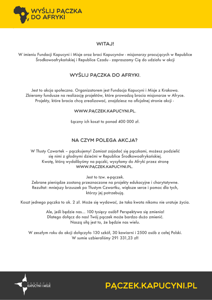 Witaj! W imieniu Fundacji Kapucyni i Misje oraz braci Kapucynów - misjonarzy pracuj ących w Republice Środkowoafrykańskiej i Republice Czadu - zapraszamy Cię do udziału w akcji Wyślij Pączka do Afryki. Jest to akcja społeczna. Organizatorem jest Fundacja Kapucyni i Misje z Krakowa. Zbieramy fundusze na realizację projektów, które prowadzą bracia misjonarze w Afryce. Projekty, które bracia chcą zrealizować, znajdziesz na oficjalnej stronie akcji - www.pączek.kapucyni.pl. Łączny ich koszt to ponad 400 000 zł. Na czym polega akcja? W Tłusty Czwartek – pączkujemy! Zamiast zajadać się pączkami, możesz podzielić się nimi z głodnymi dziećmi w Republice Środkowoafrykańskiej. Kwotę, którą wydalibyśmy na pączki, wysyłamy do Afryki przez stronę www.pączek.kapucyni.pl. Jest to tzw. e-pączek. Zebrane pieniądze zostaną przeznaczone na projekty edukacyjne i charytatywne. Rezultat: mniejszy brzuszek po Tłustym Czwartku, większe serce i pomoc dla tych, którzy jej potrzebują. Koszt jednego pączka to ok. 2 zł. Może się wydawać, że taka kwota nikomu nie uratuje życia. Ale, jeśli będzie nas... 100 tysięcy osób? Perspektywa się zmienia! Dlatego dołącz do nas! Twój pączek może bardzo dużo zmienić. Naszą siłą jest to, że będzie nas wielu. W zeszłym roku do akcji dołączyło 130 szkół, 30 kawiarni i 2500 osób z całej Polski. W sumie uzbieraliśmy 291 331,23 zł! W tym roku, aby zrealizować projekty dokarmiania dzieci, budowy szkół i kaplic, potrzebujemy 400 000 zł. Czy nam się to uda? Jeśli dołączysz do nas – zrobimy to razem! Poniżej znajdziesz kilka wskazówek i pomysłów jak przyłączyć się do akcji: 1. Pączkuj z Nami Chcesz pomóc? Dołącz do nas! W tym roku wszyscy jemy pączki afrykańskie! Specjalnie na Tłusty Czwartek usmażmy pączki. Zabierzmy je do pracy, przygotujmy spotkanie w domu. Zaprośmy znajomych, rodzinę i częstujmy tymi pączkami. Jednocześnie poprośmy o datki za te pączki. Później pieniądze przelejmy na specjalne konto Fundacji Kapucyni i Misje: Fundacja Kapucyni i Misje ul. Korzeniaka 16, 30-298 Kraków PKO S.A. o/Kraków 26 1240 4533 1111 0010 5274 9794 Z dopiskiem: Pączek dla Afryki W ten sposób w ubiegłym roku prawie 2500 osób zebrało prawie 160 000 zł!!! 2. Szkoły Akcja odbędzie się również w szkołach. Nauczyciele i uczniowie, którzy chcą wziąć udział w akcji muszą uzyskać zgodę dyrekcji. Później przygotowują nietypowy Tłusty Czwartek. Do szkoły trafiają nasze plakaty i ulotki. Nauczyciele wraz z uczniami organizują akcję informacyjną - „Zjesz dobrego pączka i pomożesz rówieśnikom w Afryce”. Dzień przed Tłustym Czwartkiem smażą pączki, które później sprzedają w szkole. Ich cena jest do ustalenia (np. w Kleszczowie w trzech szkołach pączki będą sprzedawane po 2,50 zł). W ubiegłym roku niektórzy nauczyciele wraz z uczniami udali się do zaprzyjaźnionych cukierni i poprosili o pączki na cele charytatywne. W podziękowaniu - jeszcze przed akcją – staraliśmy się zamieścić logotyp cukierni oraz informację o niej na naszej stronie internetowej. Po zakończonej akcji cukiernie otrzymywały podziękowania - certyfikaty „Czadowych cukierni”. To samo zrobimy w tym roku. Uzbierane pieniądze należy przelać na konto: Fundacja Kapucyni i Misje Ul. Korzeniaka 16, 30-298 Kraków PKO S.A. o/Kraków 26 1240 4533 1111 0010 5274 9794 Z dopiskiem: Pączek dla Afryki Jesteś uczniem? Dołącz i pomóż swoim rówieśnikom w Afryce! Zbierz kolegów i koleżanki, poproście nauczycieli i dyrekcję Waszej szkoły o pozwolenie na zrobienie akcji. Prześlemy Wam plakaty i puszki. W Tłusty Czwartek przeprowadzicie akcję w swojej szkole, a po jej zakończeniu przelejecie zebrane pieniądze na podane wyżej konto. Jesteś nauczycielem? Zbierz kilku uczniów - wolontariuszy i zrealizujcie akcję u siebie w szkole! Możesz pomóc w naprawdę prosty sposób.Wystarczy Twoje zaangażowanie oraz 10 uczniów. Każdy z Was niech usmaży po 20 pączków. W Tłusty Czwartek sprzedajcie je na terenie szkoły jako specjalne pączki afrykańskie. Nic trudnego! Wystarczą dobre chęci! W zeszłym roku do akcji włączyło się 130 szkół. W sumie uczniowie uzbierali ponad 130 000 zł! Wystarczy drobny gest, który dla innych znaczy bardzo dużo. Dołącz do nas! Zrób akcję w swojej szkole! Po wszelkie instrukcje oraz informacje piszcie – [email protected] 3. Cukiernie Akcja będzie odbywała się również w cukierniach. Przygotowaliśmy specjalną umowę. Po deklaracji, że dana cukiernia chce wziąć udział w akcji, podpisujemy ją. Później publikujemy logo i adres cukierni na głównej stronie akcji oraz promujemy ją w mediach. Cukiernie mogą pomóc na wiele sposobów. Jak? Można taniej albo za darmo przekazać pączki do szkoły, w której będzie prowadzona sprzedaż. Można również sprzedawać pewną ilość pączków jako specjalne pączki afrykańskie. Po zakończeniu akcji, zgodnie z umową, uzbierane pieniądze przelewane są na konto: Fundacja Kapucyni i Misje ul. Korzeniaka 16, 30-298 Kraków PKO S.A. o/Kraków 26 1240 4533 1111 0010 5274 9794 Z dopiskiem: Pączek dla Afryki Jak Ty możesz pomóc? Jeśli znasz właściciela jakiejś cukierni – namów go do udziału w akcji. Prześlemy Ci plakaty do powieszenia oraz umowę. Po jej podpisaniu wystarczy ją odesłać do Fundacji. Możesz również poszukać w swoim mieście cukierni, które chciałyby dołączyć do akcji i zaprosić je do współpracy. Wystarczy napisać maila albo zadzwonić. Jeśli cukiernia zainteresuje się współpracą – jej logotyp oraz adres zostanie umieszczony na stronie – www.pączek.kapucyni.pl. W ten sposób będziemy promować cukiernię. 4. Strona internetowa www.pączek.kapucyni.pl Najważniejszym elementem akcji jest strona www.pączek.kapucyni.pl - na niej opisujemy to, co teraz dzieje się w RŚA. Wyjaśnimy też, na jakie cele przeznaczamy p