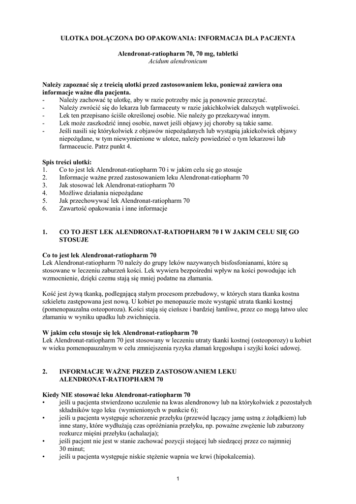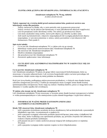 ULOTKA DOŁĄCZONA DO OPAKOWANIA: INFORMACJA DLA PACJENTA Alendronat-ratiopharm 70, 70 mg, tabletki Acidum alendronicum Należy zapoznać się z treścią ulotki przed zastosowaniem leku, ponieważ zawiera ona informacje ważne dla pacjenta. Należy zachować tę ulotkę, aby w razie potrzeby móc ją ponownie przeczytać. Należy zwrócić się do lekarza lub farmaceuty w razie jakichkolwiek dalszych wątpliwości. Lek ten przepisano ściśle określonej osobie. Nie należy go przekazywać innym. Lek może zaszkodzić innej osobie, nawet jeśli objawy jej choroby są takie same. Jeśli nasili się którykolwiek z objawów niepożądanych lub wystąpią jakiekolwiek objawy niepożądane, w tym niewymienione w ulotce, należy powiedzieć o tym lekarzowi lub farmaceucie. Patrz punkt 4. Spis treści ulotki: 1. Co to jest lek Alendronat-ratiopharm 70 i w jakim celu się go stosuje 2. Informacje ważne przed zastosowaniem leku Alendronat-ratiopharm 70 3. Jak stosować lek Alendronat-ratiopharm 70 4. Możliwe działania niepożądane 5. Jak przechowywać lek Alendronat-ratiopharm 70 6. Zawartość opakowania i inne informacje 1. CO TO JEST LEK ALENDRONAT-RATIOPHARM 70 I W JAKIM CELU SIĘ GO STOSUJE Co to jest lek Alendronat-ratiopharm 70 Lek Alendronat-ratiopharm 70 należy do grupy leków nazywanych bisfosfonianami, które są stosowane w leczeniu zaburzeń kości. Lek wywiera bezpośredni wpływ na kości powodując ich wzmocnienie, dzięki czemu stają się mniej podatne na złamania. Kość jest żywą tkanką, podlegającą stałym procesom przebudowy, w których stara tkanka kostna szkieletu zastępowana jest nową. U kobiet po menopauzie może wystąpić utrata tkanki kostnej (pomenopauzalna osteoporoza). Kości stają się cieńsze i bardziej łamliwe, przez co mogą łatwo ulec złamaniu w wyniku upadku lub zwichnięcia. W jakim celu stosuje się lek Alendronat-ratiopharm 70 Lek Alendronat-ratiopharm 70 jest stosowany w leczeniu utraty tkanki kostnej (osteoporozy) u kobiet w wieku pomenopauzalnym w celu zmniejszenia ryzyka złamań kręgosłupa i szyjki kości udowej. 2. INFORMACJE WAŻNE PRZED ZASTOSOWANIEM LEKU ALENDRONAT-RATIOPHARM 70 Kiedy NIE stosować leku Alendronat-ratiopharm 70 • jeśli u pacjenta stwierdzono uczulenie na kwas alendronowy lub na którykolwiek z pozostałych składników tego leku (wymienionych w punkcie 6); • jeśli u pacjenta występuje schorzenie przełyku (przewód łączący jamę ustną z żołądkiem) lub inne stany, które wydłużają czas opróżniania przełyku, np. poważne zwężenie lub zaburzony rozkurcz mięśni przełyku (achalazja); • jeśli pacjent nie jest w stanie zachować pozycji stojącej lub siedzącej przez co najmniej 30 minut; • jeśli u pacjenta występuje niskie stężenie wapnia we krwi (hipokalcemia). 1 Jeśli występuje którakolwiek z powyższych sytuacji, nie należy stosować leku. Należy najpierw skonsultować się z lekarzem i przestrzegać jego zaleceń. Ostrzeżenia i środki ostrożności Przed rozpoczęciem stosowania leku Alendronat-ratiopharm 70 należy zwrócić się do lekarza lub farmaceuty • jeśli u pacjenta występują zaburzenia żołądka i jelit, np. trudności z połykaniem, zaburzenia przełyku, zapalenia lub wrzody żołądka lub dwunastnicy; • jeśli u pacjenta w ciągu ostatniego roku wystąpiło poważne zaburzenie żołądka i jelit, w tym owrzodzenie żołądka lub krwawienie z przewodu pokarmowego albo wykonano jakiekolwiek zabiegi chirurgiczne w górnym odcinku przewodu pokarmowego; • jeśli lekarz stwierdził u pacjenta przełyk Barretta (choroba związana ze zmianami komórek wyściełających dolny odcinek przełyku); • jeśli u pacjenta występują zaburzenia tkanki kostnej lub nieprawidłowy metabolizm pierwiastków mineralnych (np. niedobór witaminy D, ograniczone wchłanianie wapnia, problemy z hormonami przytarczyc), które mogą prowadzić do małego stężenia wapnia we krwi; • jeśli pacjent zażywa pewne leki (glikokortykosteroidy, produkty zawierające kortyzon); • jeśli u pacjenta zdiagnozowano raka; • jeśli pacjent jest poddawany chemioterapii lub radioterapii; • jeśli pacjent nie korzysta z właściwej opieki stomatologicznej; • jeśli u pacjenta występują choroby przyzębia; • jeśli pacjent pali tytoń; • jeśli pacjent jest w trakcie leczenia stomatologicznego lub planuje zabieg stomatologiczny, powinien poinformować lekarza o przyjmowaniu leku Alendronat-ratiopharm 70; • jeśli pacjent ma zaburzenia czynności nerek. Jeśli występuje którakolwiek z powyższych sytuacji, należy poinformować o tym lekarza przed zażyciem leku Alendronat-ratiopharm 70. Środki ostrożności: W czasie leczenia pacjent powinien dbać o dobrą higienę jamy ustnej i regularnie dokonywać przeglądów stomatologicznych. Należy skontaktować się z lekarzem jeśli wystąpią objawy takie jak ruchliwość zębów, ból lub obrzęk. Dzieci i młodzież Leku Alendronat-ratiopharm 70 nie należy podawać dzieciom i młodzieży. Inne leki i Alendronat-ratiopharm 70 Należy powiedzieć lekarzowi lub farmaceucie o wszystkich lekach przyjmowanych obecnie lub ostatnio a także o lekach, które pacjent planuje przyjmować. Lek Alendronat-ratiopharm 70 nie może być stosowany razem z produktami zawierającymi wapń, lekami zobojętniającymi sok żołądkowy lub innymi lekami, ponieważ zaburza to wchłanianie kwasu alendronowego. Leki można zażyć dopiero po upływie przynajmniej 30 minut po przyjęciu leku Alendronat-ratiopharm 70. Należy zachować szczególną ostrożność stosując lek Alendronat-ratiopharm 70 z niesteroidowymi lekami przeciwzapalnymi i przeciwbólowymi, ze względu na ryzyko częstszego występowania działań niepożądanych ze strony układu pokarmowego. Alendronat-ratiopharm 70 z jedzeniem i piciem Lek Alendronat-ratiopharm 70 nie może być przyjmowany razem z jedzeniem lub napojami (w tym wodą mineralną). Jedzenie lub napoje (w tym wod