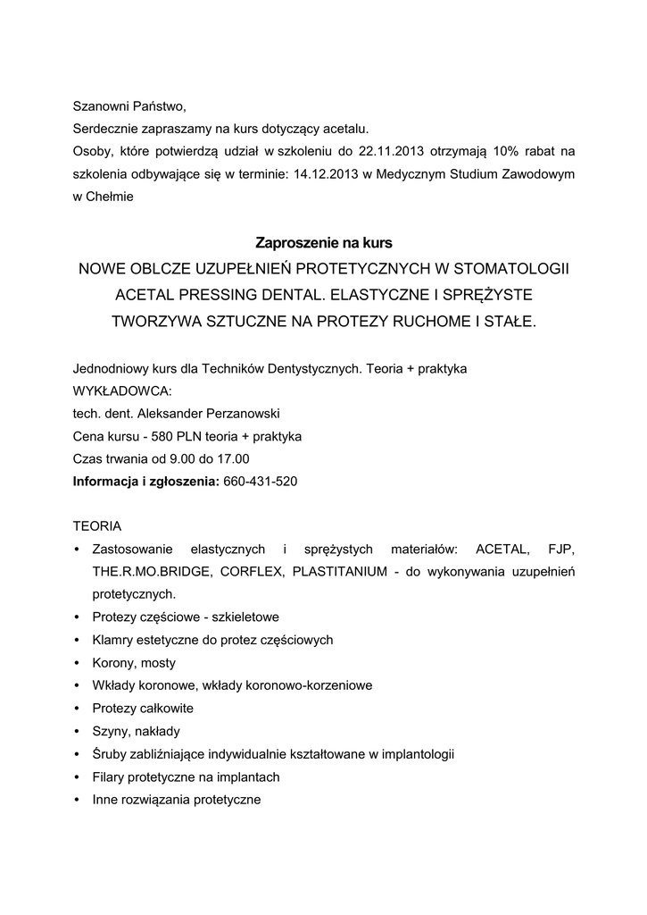 Szanowni Państwo, Serdecznie zapraszamy na kurs dotyczący acetalu. Osoby, które potwierdzą udział w szkoleniu do 22.11.2013 otrzymają 10% rabat na szkolenia odbywające się w terminie: 14.12.2013 w Medycznym Studium Zawodowym w Chełmie Zaproszenie na kurs NOWE OBLCZE UZUPEŁNIEŃ PROTETYCZNYCH W STOMATOLOGII ACETAL PRESSING DENTAL. ELASTYCZNE I SPRĘŻYSTE TWORZYWA SZTUCZNE NA PROTEZY RUCHOME I STAŁE. Jednodniowy kurs dla Techników Dentystycznych. Teoria + praktyka WYKŁADOWCA: tech. dent. Aleksander Perzanowski Cena kursu - 580 PLN teoria + praktyka Czas trwania od 9.00 do 17.00 Informacja i zgłoszenia: 660-431-520 TEORIA • Zastosowanie elastycznych i sprężystych materiałów: ACETAL, FJP, THE.R.MO.BRIDGE, CORFLEX, PLASTITANIUM - do wykonywania uzupełnień protetycznych. • Protezy częściowe - szkieletowe • Klamry estetyczne do protez częściowych • Korony, mosty • Wkłady koronowe, wkłady koronowo-korzeniowe • Protezy całkowite • Szyny, nakłady • Śruby zabliźniające indywidualnie kształtowane w implantologii • Filary protetyczne na implantach • Inne rozwiązania protetyczne PRAKTYKA • Prezentacja technologii wykonania elementów protetycznych stosowanych w technice dentystycznej przy użyciu urządzenia do wtrysku termicznego PRESSING DENTAL. Praca na modelu. • Utwardzenie modelu • Modelowanie woskiem elementów przyszłej protezy acetalowej • Puszkowanie • Wyparzanie • Wykonanie wtrysku termicznego Pressing Dental za pomocą urządzenia J100 • Wybicie protezy z puszki • Obróbka mechaniczna protezy acetalowej ĆWICZENIA PRAKTYCZNE: • Modelowanie protezy szkieletowej z wosku System Fast Protec Fast Protec - nowatorski system wykonywania prac protetycznych bez użycia gipsu w krótszym o połowę czasie Jednodniowy kurs dla Techników Dentystycznych. Teoria + praktyka. Wykładowca: tech. dent. Aleksander Perzanowski Cena kursu: bezpłatnie Czas trwania: 13.00-16.00 Termin: 28.11.2013 Miejsce: Medyczne Studium Zawodowe w Chełmie PROGRAM Część teoretyczna: Prezentacja systemu Fast Protec. Przedstawienie możliwości systemu w zależności od rodzaju uzupełnień protetycznych: • Formowanie ceramiki • Wykonanie praz protetycznych na implantach (mosty Toronto) • Akrylowanie metodą wlewową protezy górnej całkowitej Prezentacja elementów i materiałów należqcych do systemu. Część praktyczna: Wykonanie Protezy całkowitej górnej metodq akrylu wlewowego: • Umieszczenie protezy woskowej w wertykulatorze • Doczepienie kanałów wlewowych do modelacji woskowej protezy • Wykonanie formy wlewowej w specjalnej puszce, z dwóch warstw silikonu typu putty • Usunięcie wosku i wyparzenie zębów "Sztucznych • Pokrycie modelu roboczego preparatem izolującum • Akrylowanie metodą wlewową • Polimeryzacja • Kontrola pracy w artykulatorze.