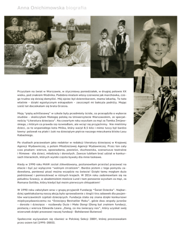 Anna Onichimowska biografia Przyszłam na świat w Warszawie, w styczniowy poniedziałek, w drugiej połowie XX wieku, pod znakiem Wodnika. Podobno miałam włosy czerwone jak marchewka, czego trudno się dzisiaj domyślić. Mój ojciec był dziennikarzem, mama lekarką. To tato właśnie - dzięki egzotycznym eskapadom - zaszczepił mi bakcyla podróży. Mając sześć lat doczekałam się brata Grzesia. Moją “piętą achillesową” w szkole były przedmioty ścisłe, co przesądziło o wyborze studiów - skończyłam filologię polską na Uniwersytecie Warszawskim, ze specjalnością “Literatura dziecięca”. Na czwartym roku wyszłam za mąż za Tomka Żmijewskiego, z którym co prawda się rozwiodłam, ale wciąż się przyjaźnimy. Nie mieliśmy dzieci, za to wspaniałego kota Miśka, który ważył 8,5 kilo i mimo tuszy był bardzo łowny: polował na ptaki i żuki na dziesiątym piętrze naszego mieszkania blisko Lasu Kabackiego. Po studiach pracowałam jako redaktor w redakcji literatury dziecięcej w Krajowej Agencji Wydawniczej, a potem Młodzieżowej Agencji Wydawniczej. Przez ten cały czas pisałam: wiersze, opowiadania, powieści, słuchowiska, scenariusze teatralne i filmowe – dla dzieci, młodzieży i dorosłych. Zawsze lubiłam brać udział w konkursach literackich, których wyniki często bywały dla mnie łaskawe. Kiedy w 1990 roku MAW został zlikwidowany, postanowiłam przestać pracować na etacie i być już wyłącznie “wolnym strzelcem”. Bardzo jestem z tego pomysłu zadowolona, ponieważ pisać można wszędzie na świecie! Dzięki temu mogłam dużo podróżować i pomieszkiwać w różnych krajach. W 2014 roku zadomowiłam się na południu Szwecji, w akademickim mieście Lund i tam ponownie wyszłam za mąż, za Romana Gotliba, który kiedyś był moim pierwszym chłopakiem! W 1990 roku założyłam wraz z grupą przyjaciół Fundację “Świat Dziecka”. Najbardziej spektakularną naszą akcją było sprowadzenie z Anglii tira zabawek dla pacjentów warszawskich szpitali dziecięcych. Fundacja stała się znana dzięki konkursowi międzywydawniczemu na “Dziecięcy Bestseller Roku”, gdzie dwa zespoły jurorów - dorosłe i dziecięce - rozdawały Duże i Małe Dongi (Dong był znakiem fundacji, postacią z wiersza Edwarda Leara „Dong, co ma świecący nos”, który uzyskał swój wizerunek dzięki prezesowi naszej fundacji – Bohdanowi Butence) Społecznie wyżywałam się również w Polskiej Sekcji IBBY, której prezesowałam przez osiem lat (1995-2003).