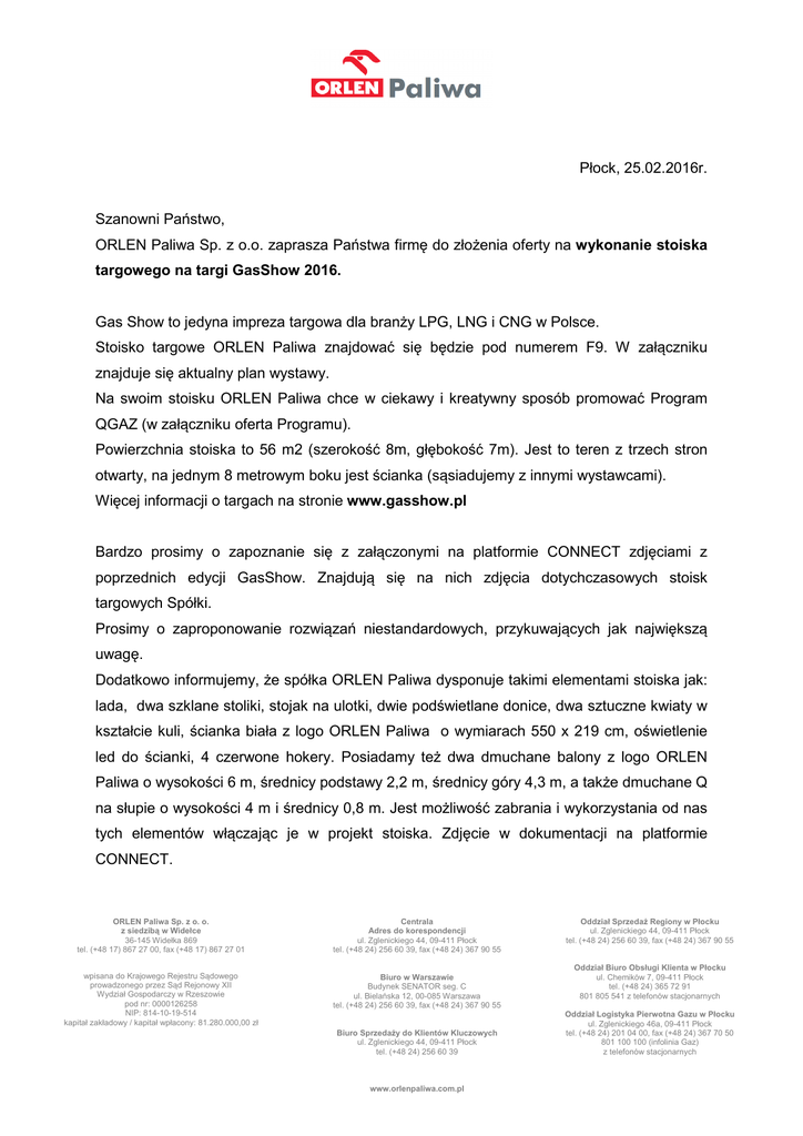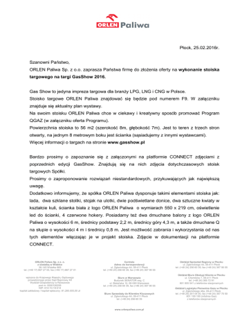 Płock, 25.02.2016r. COPCO Polska Sp. z o.o. Szanowni Państwo, ORLEN Paliwa Sp. z o.o. zaprasza Państwa firmę do złożenia oferty na wykonanie stoiska targowego na targi GasShow 2016. Gas Show to jedyna impreza targowa dla branży LPG, LNG i CNG w Polsce. Stoisko targowe ORLEN Paliwa znajdować się będzie pod numerem F9. W załączniku znajduje się aktualny plan wystawy. Na swoim stoisku ORLEN Paliwa chce w ciekawy i kreatywny sposób promować Program QGAZ (w załączniku oferta Programu). Powierzchnia stoiska to 56 m2 (szerokość 8m, głębokość 7m). Jest to teren z trzech stron otwarty, na jednym 8 metrowym boku jest ścianka (sąsiadujemy z innymi wystawcami). Więcej informacji o targach na stronie www.gasshow.pl Bardzo prosimy o zapoznanie się z załączonymi na platformie CONNECT zdjęciami z poprzednich edycji GasShow. Znajdują się na nich zdjęcia dotychczasowych stoisk targowych Spółki. Prosimy o zaproponowanie rozwiązań niestandardowych, przykuwających jak największą uwagę. Dodatkowo informujemy, że spółka ORLEN Paliwa dysponuje takimi elementami stoiska jak: lada, dwa szklane stoliki, stojak na ulotki, dwie podświetlane donice, dwa sztuczne kwiaty w kształcie kuli, ścianka biała z logo ORLEN Paliwa o wymiarach 550 x 219 cm, oświetlenie led do ścianki, 4 czerwone hokery. Posiadamy też dwa dmuchane balony z logo ORLEN Paliwa o wysokości 6 m, średnicy podstawy 2,2 m, średnicy góry 4,3 m, a także dmuchane Q na słupie o wysokości 4 m i średnicy 0,8 m. Jest możliwość zabrania i wykorzystania od nas tych elementów włączając je w projekt stoiska. Zdjęcie w dokumentacji na platformie CONNECT. ORLEN Paliwa Sp. z o. o. z siedzibą w Widełce 36-145 Widełka 869 tel. (+48 17) 867 27 00, fax (+48 17) 867 27 01 Centrala Adres do korespondencji ul. Zglenickiego 44, 09-411 Płock tel. (+48 24) 256 60 39, fax (+48 24) 367 90 55 wpisana do Krajowego Rejestru Sądowego prowadzonego przez Sąd Rejonowy XII Wydział Gospodarczy w Rzeszowie pod nr: 0000126258 NIP: 814-10-19-514 kapitał zakładowy / kapitał wpłacony: 81.280.000,00 zł Biuro w Warszawie Budynek SENATOR seg. C ul. Bielańska 12, 00-085 Warszawa tel. (+48 24) 256 60 39, fax (+48 24) 367 90 55 Biuro Sprzedaży do Klientów Kluczowych ul. Zglenickiego 44, 09-411 Płock tel. (+48 24) 256 60 39 www.orlenpaliwa.com.pl Oddział Sprzedaż Regiony w Płocku ul. Zglenickiego 44, 09-411 Płock tel. (+48 24) 256 60 39, fax (+48 24) 367 90 55 Oddział Biuro Obsługi Klienta w Płocku ul. Chemików 7, 09-411 Płock tel. (+48 24) 365 72 91 801 805 541 z telefonów stacjonarnych Oddział Logistyka Pierwotna Gazu w Płocku ul. Zglenickiego 46a, 09-411 Płock tel. (+48 24) 201 04 00, fax (+48 24) 367 70 50 801 100 100 (infolinia Gaz) z telefonów stacjonarnych Oferta powinna zawierać: - propozycję zagospodarowania przestrzeni, która koniecznie powinna uwzględniać: a) aranżację przestrzeni, w której można będzie usiąść i porozmawiać z Klientami, wypić kawę/herbatę b) umeblowanie stoiska (krzesła, stolik) c) miejsce na ekspozycję ulotek reklamowych i innych materiałów promocyjnych d) ustawienie minimum 40 calowego telewizora (wypożyczonego przez zleceniobiorcę) na którym z pendriva puszczana będzie prezentacja oferty oraz film „Jak powstaje QGAZ” e) propozycję małego zaplecza (miejsce gdzie można będzie podłączyć czajnik, schować materiały promocyjne) - cenę całkowitą netto przedmiotu zapytania wraz z propozycją wyceny prac, z wyszczególnieniem: • kosztu obsługi stoiska przez dwie hostessy przez 2 dni (W zakresie agencji będzie także projekt i produkcja strojów dla hostess). • wykonanie usługi montażu i demontażu • koszt wszystkich elementów stoiska • transport - 3 wstępne wizualizacje stoiska - przykłady podobnych realizacji (stoisk targowych) - minimum 3 referencje lub wykaz podmiotów, dla których realizowali Państwo usługę w tym zakresie - harmonogram realizacji prac - aktualny dokument dotyczący reprezentacji Spółki – KRS lub CEIDG; - podpisane oświadczenie oferenta dot. zachowania tajemnicy; - akceptacja Ogólnych Warunków Zamówienia (OWZ); Termin realizacji: 07-09.04.2016r. Montaż stoiska - 07.04.2016 6:00 - 22:00; Demontaż - 09.04.2016 16:30 - 22:00 Termin ważności składanej oferty 60 dni. Termin płatności 30 dni od daty otrzymania faktury (bez zaliczki) ORLEN Paliwa Sp. z o. o. z siedzibą w Widełce 36-145 Widełka 869 tel. (+48 17) 867 27 00, fax (+48 17) 867 27 01 Centrala Adres do korespondencji ul. Zglenickiego 44, 09-411 Płock tel. (+48 24) 256 60 39, fax (+48 24) 367 90 55 wpisana do Krajowego Rejestru Sądowego prowadzonego przez Sąd Rejonowy XII Wydział Gospodarczy w Rzeszowie pod nr: 0000126258 NIP: 814-10-19-514 kapitał zakładowy / kapitał wpłacony: 81.280.000,00 zł Biuro w Warszawie Budynek SENATOR seg. C ul. Bielańska 12, 00-085 Warszawa tel. (+48 24) 256 60 39, fax (+48 24) 367 90 55 Biuro Sprzedaży do Klientów Kluczowych ul. Zglenickiego 44, 09-411 Płock tel. (+48 24) 256 60 39 www.orlenpaliwa.com.pl Oddział Sprzedaż Regiony w Płocku ul. Zglenickiego 44, 09-411 Płock tel. (+48 24) 256 60 39, fax (+48 24) 367 90 55 Oddział Biuro Obsługi Klienta w Płocku ul. Chemików 7, 09-411 Płock tel. (+48 24) 365 72 91 801 805 541 z telefonów stacjonarnych Oddział Logistyka Pierwotna Gazu w Płocku ul. Zglenickiego 46a, 09-411 Płock tel. (+48 24) 201 04 00, fax (+48 24) 367 70 50 801 100 100 (infolinia Gaz) z telefonów stacjonarnych Więcej informacji uzyskacie Państwo logując się na platformie zakupowej CONNECT. Wszelkie pytania proszę kierować przez zakładkę pytania/ odpowiedzi. Termin składania ofert: 03.03.2016r. godz. 13:00 UWAGA! Oferty można składać jedynie za pośrednictwem Platformy Zakupowej CONNECT, logując się do systemu na https://connect.orlen.pl/ Z poważaniem, Natalia Bartosiewicz-Burdanowska 603 394 696 Oferent ponosi wszystkie koszty związane z przygotowaniem i