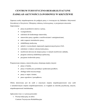 CENTRUM TURYSTYCZNO-REHABLILITACYJNE ZADKŁAD AKTYNOŚCI ZAWODOWEJ W KRZYŻEWIE Zaprasza osoby niepełnosprawne do podjęcia pracy w tworzącym się Zakładzie Aktywności Zawodowej w Krzyżewie. Oferujemy ciekawą, twórczą pracę, w przyjaznym otoczeniu. Zapewniamy: pracę na podstawie umowy o pracę, wynagrodzenie, szkolenie do konkretnego stanowiska, stanowisko pracy zgodnie z możliwościami i umiejętnościami, stałe wsparcie instruktorów pracy, rehabilitację medyczną, udział w wycieczkach, imprezach organizowanych przez ZAZ, szkolenie w trakcie wykonywania pracy, możliwość dowozu do miejsca pracy w ramach możliwości zakładu, program ciekawej rehabilitacji społecznej, przyjazne środowisko pracy. Proponowane miejsca, stanowiska pracy obejmują między innymi: pracę w hotelu, pracę w kuchni przy produkcji i podawaniu posiłków, obsługę ruchu turystycznego, pracę w stajni z końmi, prace ogrodowe i porządkowe. Oferta skierowana jest do osób o znacznym stopniu niepełnosprawności oraz osób o umiarkowanym stopniu niepełnosprawności, ze względu na chorobę psychiczną, autyzm, niepełnosprawność intelektualną. Zgłoszenia wraz z cv proszę przesyłać: 1. Pocztą tradycyjną, na adres: Centrum Turystyczno-Rehabilitacyjne Małgorzata Raciborska Krzyżewo 32 18-218 Sokoły 2. Pocztą elektroniczną, na adres e-mail: [email protected] Dodatkowe informacje można uzyskać: u Pani Małgorzaty Raciborskiej, pod numerem telefonu: 504 247 229.