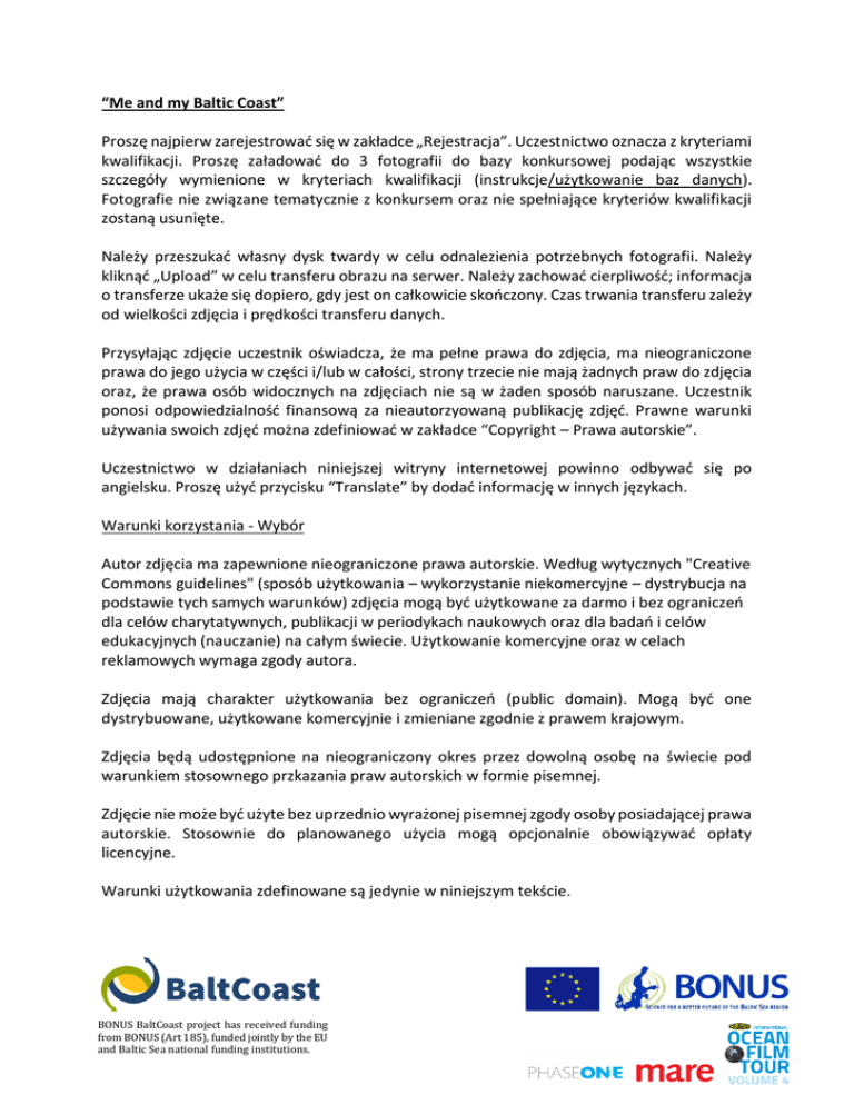 “Me and my Baltic Coast” Proszę najpierw zarejestrować się w zakładce „Rejestracja”. Uczestnictwo oznacza z kryteriami kwalifikacji. Proszę załadować do 3 fotografii do bazy konkursowej podając wszystkie szczegóły wymienione w kryteriach kwalifikacji (instrukcje/użytkowanie baz danych). Fotografie nie związane tematycznie z konkursem oraz nie spełniające kryteriów kwalifikacji zostaną usunięte. Należy przeszukać własny dysk twardy w celu odnalezienia potrzebnych fotografii. Należy kliknąć „Upload” w celu transferu obrazu na serwer. Należy zachować cierpliwość; informacja o transferze ukaże się dopiero, gdy jest on całkowicie skończony. Czas trwania transferu zależy od wielkości zdjęcia i prędkości transferu danych. Przysyłając zdjęcie uczestnik oświadcza, że ma pełne prawa do zdjęcia, ma nieograniczone prawa do jego użycia w części i/lub w całości, strony trzecie nie mają żadnych praw do zdjęcia oraz, że prawa osób widocznych na zdjęciach nie są w żaden sposób naruszane. Uczestnik ponosi odpowiedzialność finansową za nieautorzyowaną publikację zdjęć. Prawne warunki używania swoich zdjęć można zdefiniować w zakładce “Copyright – Prawa autorskie”. Uczestnictwo w działaniach niniejszej witryny internetowej powinno odbywać się po angielsku. Proszę użyć przycisku “Translate” by dodać informację w innych językach. Warunki korzystania - Wybór Autor zdjęcia ma zapewnione nieograniczone prawa autorskie. Według wytycznych "Creative Commons guidelines" (sposób użytkowania – wykorzystanie niekomercyjne – dystrybucja na podstawie tych samych warunków) zdjęcia mogą być użytkowane za darmo i bez ograniczeń dla celów charytatywnych, publikacji w periodykach naukowych oraz dla badań i celów edukacyjnych (nauczanie) na całym świecie. Użytkowanie komercyjne oraz w celach reklamowych wymaga zgody autora. Zdjęcia mają charakter użytkowania bez ograniczeń (public domain). Mogą być one dystrybuowane, użytkowane komercyjnie i zmieniane zgodnie z prawem krajowym. Zdjęcia będą udostępnione na nieograniczony okres przez dowolną osobę na świecie pod warunkiem stosownego przkazania praw autorskich w formie pisemnej. Zdjęcie nie może być użyte bez uprzednio wyrażonej pisemnej zgody osoby posiadającej prawa autorskie. Stosownie do planowanego użycia mogą opcjonalnie obowiązywać opłaty licencyjne. Warunki użytkowania zdefinowane są jedynie w niniejszym tekście. BONUS BaltCoast project has received funding from BONUS (Art 185), funded jointly by the EU and Baltic Sea national funding institutions.