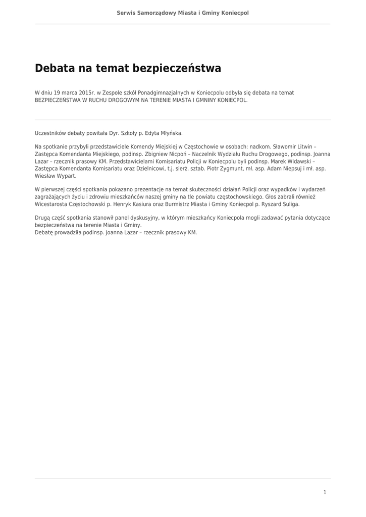 Serwis Samorządowy Miasta i Gminy Koniecpol Debata na temat bezpieczeństwa W dniu 19 marca 2015r. w Zespole szkół Ponadgimnazjalnych w Koniecpolu odbyła się debata na temat BEZPIECZEŃSTWA W RUCHU DROGOWYM NA TERENIE MIASTA I GMNINY KONIECPOL. Uczestników debaty powitała Dyr. Szkoły p. Edyta Młyńska. Na spotkanie przybyli przedstawiciele Komendy Miejskiej w Częstochowie w osobach: nadkom. Sławomir Litwin – Zastępca Komendanta Miejskiego, podinsp. Zbigniew Nicpoń – Naczelnik Wydziału Ruchu Drogowego, podinsp. Joanna Lazar – rzecznik prasowy KM. Przedstawicielami Komisariatu Policji w Koniecpolu byli podinsp. Marek Widawski – Zastępca Komendanta Komisariatu oraz Dzielnicowi, t.j. sierż. sztab. Piotr Zygmunt, mł. asp. Adam Niepsuj i mł. asp. Wiesław Wypart. W pierwszej części spotkania pokazano prezentacje na temat skuteczności działań Policji oraz wypadków i wydarzeń zagrażających życiu i zdrowiu mieszkańców naszej gminy na tle powiatu częstochowskiego. Głos zabrali również Wicestarosta Częstochowski p. Henryk Kasiura oraz Burmistrz Miasta i Gminy Koniecpol p. Ryszard Suliga. Drugą część spotkania stanowił panel dyskusyjny, w którym mieszkańcy Koniecpola mogli zadawać pytania dotyczące bezpieczeństwa na terenie Miasta i Gminy. Debatę prowadziła podinsp. Joanna Lazar – rzecznik prasowy KM. 1