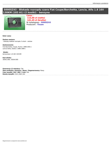 Informacje o produkcie S000SZ43 - Blokada rozrządu szara Fiat Coupe/Barchetta, Lancia, Alfa 1.8 16V 130KM (183 A1) (2 kostki) - benzyna Cena : 115,00 zł (netto) 141,45 zł (brutto) Nr katalogowy : S000SZ43 Producent : Tesam Kolor szary Zestaw zawiera: - blokady wałków rozrządu 2 sztuki - zestaw Zastosowanie: Fiat Barchetta, Coupe, Punto ( 1996-2001 ) Lancia Delta, Dedra ( 1996-1999 ) Silniki: benzynowe 1.8 16V 130 KM Kod silnika: 183A1.000, 192A4.000 wałkow, walkow, walków, rozrzadu Gwarancja 12 miesięcy: Tak Stan produktu: Używany / Nowy / Regenerowany: Nowy Czas wysyłki: 24h | 48h | 3 dni: 24h Koszty wysyłki: 21zł | 26zł | 0zł Wygenerowano w programie www.oscGold.com