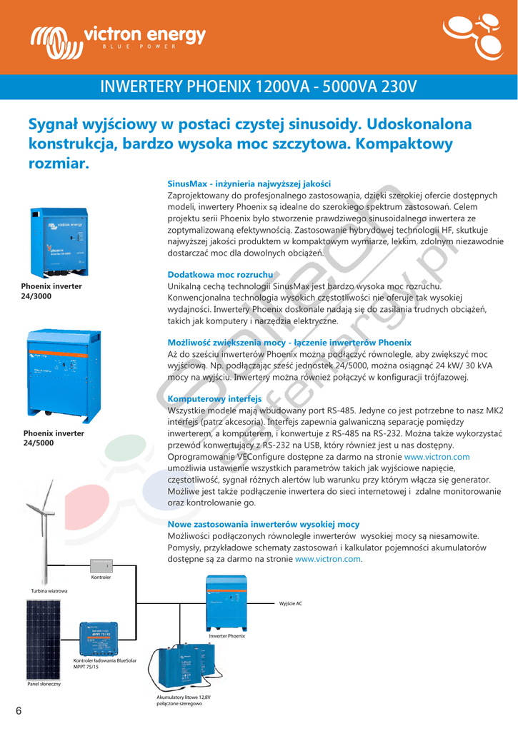 INWERTERY PHOENIX 1200VA - 5000VA 230V Sygnał wyjściowy w postaci czystej sinusoidy. Udoskonalona konstrukcja, bardzo wysoka moc szczytowa. Kompaktowy rozmiar. SinusMax - inżynieria najwyższej jakości Zaprojektowany do profesjonalnego zastosowania, dzięki szerokiej ofercie dostępnych modeli, inwertery Phoenix są idealne do szerokiego spektrum zastosowań. Celem projektu serii Phoenix było stworzenie prawdziwego sinusoidalnego inwertera ze zoptymalizowaną efektywnością. Zastosowanie hybrydowej technologii HF, skutkuje najwyższej jakości produktem w kompaktowym wymiarze, lekkim, zdolnym niezawodnie dostarczać moc dla dowolnych obciążeń. Dodatkowa moc rozruchu Unikalną cechą technologii SinusMax jest bardzo wysoka moc rozruchu. Konwencjonalna technologia wysokich częstotliwości nie oferuje tak wysokiej wydajności. Inwertery Phoenix doskonale nadają się do zasilania trudnych obciążeń, takich jak komputery i narzędzia elektryczne. Phoenix inverter 24/3000 Możliwość zwiększenia mocy - łączenie inwerterów Phoenix Aż do sześciu inwerterów Phoenix można podłączyć równolegle, aby zwiększyć moc wyjściową. Np. podłączając sześć jednostek 24/5000, można osiągnąć 24 kW/ 30 kVA mocy na wyjściu. Inwertery można również połączyć w konfiguracji trójfazowej. Komputerowy interfejs Wszystkie modele mają wbudowany port RS-485. Jedyne co jest potrzebne to nasz MK2 interfejs (patrz akcesoria). Interfejs zapewnia galwaniczną separację pomiędzy inwerterem, a komputerem, i konwertuje z RS-485 na RS-232. Można także wykorzystać przewód konwertujący z RS-232 na USB, który również jest u nas dostępny. Oprogramowanie VEConfigure dostępne za darmo na stronie www.victron.com umożliwia ustawienie wszystkich parametrów takich jak wyjściowe napięcie, częstotliwość, sygnał różnych alertów lub warunku przy którym włącza się generator. Możliwe jest także podłączenie inwertera do sieci internetowej i zdalne monitorowanie oraz kontrolowanie go. Phoenix inverter 24/5000 Konwerter wiatrowy Nowe zastosowania inwerterów wysokiej mocy Możliwości podłączonych równolegle inwerterów wysokiej mocy są niesamowite. Pomysły, przykładowe schematy zastosowań i kalkulator pojemności akumulatorów dostępne są za darmo na stronie www.victron.com. Kontroler Turbina wiatrowa Wyjście AC Inwerter Phoenix Kontroler ładowania BlueSolar MPPT 75/15 Panel słoneczny Akumulatory litowe 12,8V połączone szeregowo 6 68 INWERTERY PHOENIX 1200VA - 5000VA 230V C12/1200 C24/1200 Inwertery Phoenix C12/1600 C24/1600 C12/2000 C24/2000 Równoległe i trójfazowe podłaczanie 12/3000 24/3000 48/3000 24/5000 48/5000 Tak INWERTER Ciągła moc na wyjściu przy 25°C [VA] (2) 1200 1600 2000 3000 5000 Ciągła moc na wyjściu przy 25°C/40°C [W] 1000/900 1300/1200 1600/1450 2500/2200 4500/4000 Moc chwilowa [W] 2400 3000 4000 6000 10000 Napięcie wyjściowe AC / częstotliwość 230VAC +/-2% Zakres napięcia wejściowego DC [V] 9,5 - 17V 50Hz +/-0,1% (1) 19 - 33V 38 - 66V Maksymalna wydajność 12 / 24 / 48V [%] 92 / 94 92 / 94 92 / 92 93 / 94 / 95 94 / 95 Pobór mocy bez obciążenia 12 / 24 / 48V [W] 8 / 10 8 / 10 9 / 11 15 / 15 / 16 25 / 25 Pobór mocy bez obciążenia w trybie AES [W] 5/8 5/8 7/9 10 / 10 / 12 20 / 20 Pobór mocy bez obciążenia w trybie szukania [W] 2/3 2/3 3/4 4/5/5 5/6 Zabezpieczenia (4) a-g Zakres temperatur pracy od -40 do +50°C (chłodzenie wentylatorem) Wilgotność powietrza nieskondesowanego maks. 95% Możliwość programowania (3) Tak Port komunikacji VE.Bus Do równoległego i trójfazowego podłączenia, zdalnego monitorowania i integracji systemu Zewnętrzny przełącznik wł./wył. Tak OBUDOWA Materiał i kolor Aluminium (niebieski Ral 5012) Podłączenie akumulatora Przewód 1,5m Śruby M8 2+2 śruby M8 Wyjście AC Wtyk G-ST18i Krokodylki Listwa zaciskowa Stopień ochrony IP 21 Waga [kg] 10 12 18 30 Wymiary (W x S x G) [mm] 375 x 214 x 110 520 x 255 x 125 362 x 258 x 218 444 x 328 x 240 STANDARDY I NORMY Norma bezpieczeństwa EN 60335-1 Emisja EN55014-1 / EN55014-2 1) Dostępne również w wersji 60Hz i 240V 2) Ładowanie nieliniowe, współczynnik szczytu 3 : 1 3) Programowanie m.in. alertów, funkcji wł./wył. generator, dolnej granicy napięcia DC 4) Zabezpieczenia: a) zwarcie wyjścia; b) przeciążenia; c) zbyt wysokie napięcie baterii; d) zbyt niskie napięcie baterii; e) zbyt wysoka temperatura; f) napięcie zmienne 230V na wyjściu przetwornicy; g) zbyt wysokie wahania napięcia wejściowego Kontroler inwertera Phoenix to niewielki panel sygnalizacyjny, pozwalający kontrolować stan inwertera dzięki LED’owym lampkom. Ten panel może być także użyty do kontroli inwertera/ładowarki MultiPlus. Jasność lampek słabnie w nocy. Interfejsy umożliwiające zdalne sterowanie i monitoring za pomocą komputera, telefonu komórkowego, tableta itp. -Konwerter MK2.2 VE.Bus na Rs232 Podłączenie do portu Rs232 komputera (aplikacja VEConfigure) -Konwerter MK2-USB VE.Bus na USB Podłączenie do portu USB (aplikacja VEConfigure) -Konwerter VE.Net na VE.Bus Interfejs do VE.Net (patrz dokumentacja VE.Net) -Konwerter VE.Bus na NMEA 2000 -Victron Ethernet Remote Podłączenie do lokalnej sieci -Victron Global Remote Jest to modem, który przesyła informacje na temat systemu zasilania komunikaty alarmowe i ostrzeżenia do telefonu komórkowego w wiadomości tekstowej SMS. Modem może również rejestrować dane z urządzeń Victron, takich jak monitory stanu akumulatorów, inwertery, urządzenia Multi i Quattro, a następnie przesyłać je na stronę internetową. 7 68