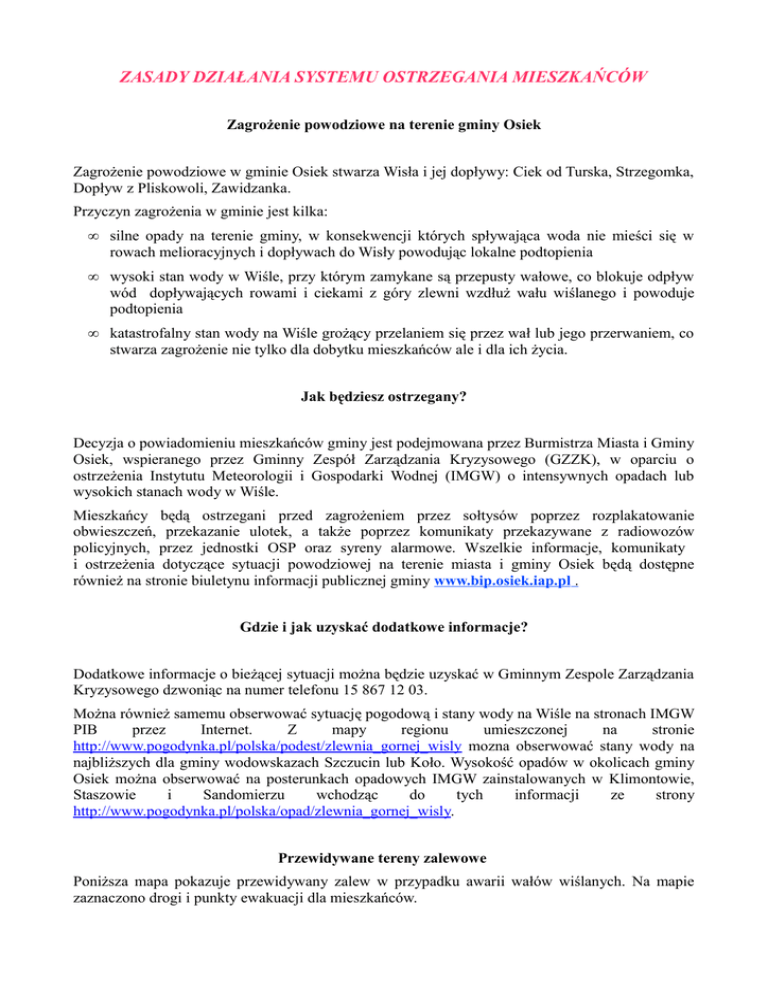 ZASADY DZIAŁANIA SYSTEMU OSTRZEGANIA MIESZKAŃCÓW Zagrożenie powodziowe na terenie gminy Osiek Zagrożenie powodziowe w gminie Osiek stwarza Wisła i jej dopływy: Ciek od Turska, Strzegomka, Dopływ z Pliskowoli, Zawidzanka. Przyczyn zagrożenia w gminie jest kilka: • silne opady na terenie gminy, w konsekwencji których spływająca woda nie mieści się w rowach melioracyjnych i dopływach do Wisły powodując lokalne podtopienia • wysoki stan wody w Wiśle, przy którym zamykane są przepusty wałowe, co blokuje odpływ wód dopływających rowami i ciekami z góry zlewni wzdłuż wału wiślanego i powoduje podtopienia • katastrofalny stan wody na Wiśle grożący przelaniem się przez wał lub jego przerwaniem, co stwarza zagrożenie nie tylko dla dobytku mieszkańców ale i dla ich życia. Jak będziesz ostrzegany? Decyzja o powiadomieniu mieszkańców gminy jest podejmowana przez Burmistrza Miasta i Gminy Osiek, wspieranego przez Gminny Zespół Zarządzania Kryzysowego (GZZK), w oparciu o ostrzeżenia Instytutu Meteorologii i Gospodarki Wodnej (IMGW) o intensywnych opadach lub wysokich stanach wody w Wiśle. Mieszkańcy będą ostrzegani przed zagrożeniem przez sołtysów poprzez rozplakatowanie obwieszczeń, przekazanie ulotek, a także poprzez komunikaty przekazywane z radiowozów policyjnych, przez jednostki OSP oraz syreny alarmowe. Wszelkie informacje, komunikaty i ostrzeżenia dotyczące sytuacji powodziowej na terenie miasta i gminy Osiek będą dostępne również na stronie biuletynu informacji publicznej gminy www.bip.osiek.iap.pl . Gdzie i jak uzyskać dodatkowe informacje? Dodatkowe informacje o bieżącej sytuacji można będzie uzyskać w Gminnym Zespole Zarządzania Kryzysowego dzwoniąc na numer telefonu 15 867 12 03. Można również samemu obserwować sytuację pogodową i stany wody na Wiśle na stronach IMGW PIB przez Internet. Z mapy regionu umieszczonej na stronie http://www.pogodynka.pl/polska/podest/zlewnia_gornej_wisly mozna obserwować stany wody na najbliższych dla gminy wodowskazach Szczucin lub Koło. Wysokość opadów w okolicach gminy Osiek można obserwować na posterunkach opadowych IMGW zainstalowanych w Klimontowie, Staszowie i Sandomierzu wchodząc do tych informacji ze strony http://www.pogodynka.pl/polska/opad/zlewnia_gornej_wisly. Przewidywane tereny zalewowe Poniższa mapa pokazuje przewidywany zalew w przypadku awarii wałów wiślanych. Na mapie zaznaczono drogi i punkty ewakuacji dla mieszkańców. W przypadku ostrzeżenia o zagrożeniu powodziowym Postępuj zgodnie z treścią komunikatów – nie zwlekaj! • • • • • • • jeśli możesz – odeślij dzieci i osoby starsze w bezpieczne miejsce, np. do rodziny, znajomych ustal sposoby kontaktowania się z rodziną zgromadź zapasy czystej wody oraz żywności przenieś, o ile to możliwe, wartościowe rzeczy na wyższe kondygnacje jeśli nie zdążyłeś ewakuować zwierząt, uwolnij je z pozamykanych pomieszczeń nie wchodź, jeśli nie jest to konieczne do niesionej przez powódź wody w miarę możliwości zapobiegaj tworzeniu się paniki, bądź rozsądny, zachowaj trzeźwość umysłu. Po sygnale do ewakuacji • • • • postępuj zgodnie ze wskazówkami służb prowadzących akcję ratunkową i ewakuację skontaktuj się z rodziną, by powiedzieć im gdzie się udajesz zabezpiecz swój dom spakuj i zabierz z sobą: ważne dokumenty (akty własności, polisy ubezpieczeniowe, dowody osobiste, dokumenty firmy w przypadku prowadzenia działalności gospodarczej), lekarstwa, telefon komórkowy i ładowarkę, latarkę z bateriami, zestaw pierwszej pomocy, wodę butelkowaną, odzież na zmianę, śpiwór, materac i poduszkę dla każdego członka rodziny, a także klucze od domu • słuchaj kolejnych komunikatów. Zapamiętaj ważne numery telefonów: 15 867 12 03 – Gminny Zespół Zarządzania Kryzysowego 999 – Pogotowie Ratunkowe 998 – Straż Pożarna 997 – Policja 112 – telefon alarmowy dla użytkowników telefonów komórkowych