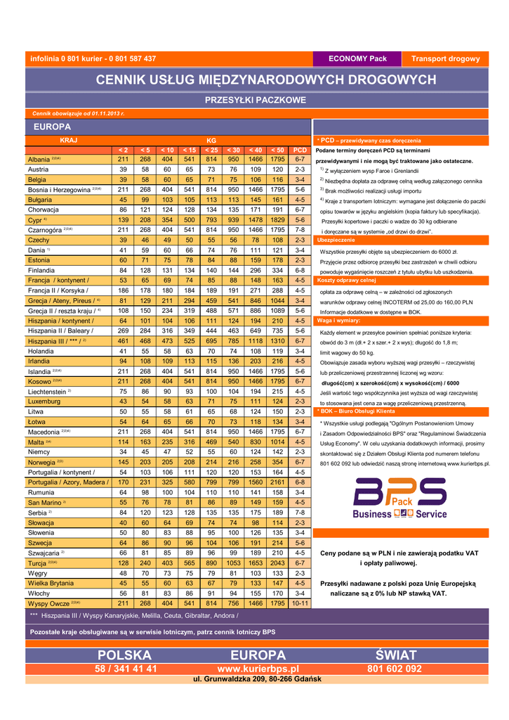 infolinia 0 801 kurier - 0 801 587 437 ECONOMY Pack Transport drogowy CENNIK USŁUG MIĘDZYNARODOWYCH DROGOWYCH PRZESYŁKI PACZKOWE Cennik obowiązuje od 01.11.2013 r. EUROPA KRAJ * PCD – przewidywany czas doręczenia <2 211 <5 268 < 10 404 < 15 541 KG < 25 814 < 30 950 < 40 1466 < 50 1795 PCD 6-7 39 58 60 65 73 76 109 120 2-3 1) Z wyłączeniem wysp Faroe i Grenlandii Belgia 39 58 60 65 71 75 106 116 3-4 2) Niezbędna dopłata za odprawę celną według załączonego cennika Bosnia i Herzegowina 2)3)4) Bułgaria 211 268 404 541 814 950 1466 1795 5-6 3) Brak możliwości realizacji usługi importu 45 99 103 105 113 113 145 161 4-5 4) Kraje z transportem lotniczym: wymagane jest dołączenie do paczki Chorwacja 86 121 124 128 134 135 171 191 6-7 opisu towarów w języku angielskim (kopia faktury lub specyfikacja). 139 208 354 500 793 939 1478 1829 5-6 Przesyłki kopertowe i paczki o wadze do 30 kg odbierane 211 268 404 541 814 950 1466 1795 7-8 Czechy 39 46 49 50 55 56 78 108 2-3 Dania 1) 41 59 60 66 74 76 111 121 3-4 Wszystkie przesyłki objęte są ubezpieczeniem do 6000 zł. Estonia 60 71 75 78 84 88 159 178 2-3 Przyjęcie przez odbiorcę przesyłki bez zastrzeżeń w chwili odbioru Finlandia 84 128 131 134 140 144 296 334 6-8 Francja / kontynent / 53 65 69 74 85 88 148 163 4-5 Albania 2)3)4) Austria Cypr 4) Czarnogóra 2)3)4) Francja II / Korsyka / Podane terminy doręczeń PCD są terminami przewidywanymi i nie mogą być traktowane jako ostateczne. i doręczane są w systemie „od drzwi do drzwi”. Ubezpieczenie powoduje wygaśnięcie roszczeń z tytułu ubytku lub uszkodzenia. Koszty odprawy celnej 186 178 180 184 189 191 271 288 4-5 opłata za odprawę celną – w zależności od zgłoszonych Grecja / Ateny, Pireus / 4) 81 129 211 294 459 541 846 1044 3-4 warunków odprawy celnej INCOTERM od 25,00 do 160,00 PLN Grecja II / reszta kraju / 4) 108 150 234 319 488 571 886 1089 5-6 Hiszpania / kontynent / 64 101 104 106 111 124 194 210 4-5 Hiszpania II / Baleary / 269 284 316 349 444 463 649 735 5-6 Każdy element w przesyłce powinien spełniać poniższe kryteria: 461 468 473 525 695 785 1118 1310 6-7 obwód do 3 m (dł.+ 2 x szer.+ 2 x wys); długość do 1,8 m; 41 55 58 63 70 74 108 119 3-4 limit wagowy do 50 kg. Irlandia 94 108 109 113 115 136 203 216 4-5 Obowiązuje zasada wyboru wyższej wagi przesyłki – rzeczywistej Islandia 2)3)4) 211 268 404 541 814 950 1466 1795 5-6 lub przeliczeniowej przestrzennej liczonej wg wzoru: Kosowo 2)3)4) 211 268 404 541 814 950 1466 1795 6-7 długość(cm) x szerokość(cm) x wysokość(cm) / 6000 Liechtenstein 2) Luxemburg 75 86 90 93 100 104 194 215 4-5 Jeśli wartość tego współczynnika jest wyższa od wagi rzeczywistej 43 54 58 63 71 75 111 124 2-3 Litwa 50 55 58 61 65 68 124 150 2-3 Hiszpania III / *** / Holandia 2) Łotwa Informacje dodatkowe w dostępne w BOK. Waga i wymiary: to stosowana jest cena za wagę przeliczeniową przestrzenną. * BOK – Biuro Obsługi Klienta 54 64 65 66 70 73 118 134 3-4 * Wszystkie usługi podlegają "Ogólnym Postanowieniom Umowy 211 268 404 541 814 950 1466 1795 6-7 i Zasadom Odpowiedzialności BPS" oraz "Regulaminowi Świadczenia Malta 2)4) 114 163 235 316 469 540 830 1014 4-5 Usług Economy". W celu uzyskania dodatkowych informacji, prosimy Niemcy 34 45 47 52 55 60 124 142 2-3 skontaktować się z Działem Obsługi Klienta pod numerem telefonu Norwegia 2)3) Portugalia / kontynent / 145 203 205 208 214 216 258 354 6-7 801 602 092 lub odwiedzić naszą stronę internetową www.kurierbps.pl. 54 103 106 111 120 120 153 164 4-5 Portugalia / Azory, Madera / 170 231 325 580 799 799 1560 2161 6-8 Rumunia 64 98 100 104 110 110 141 158 3-4 San Marino 2) 55 76 78 81 86 89 149 159 4-5 Serbia 2) Słowacja 84 120 123 128 135 135 175 189 7-8 40 60 64 69 74 74 98 114 2-3 Słowenia 50 80 83 88 95 100 126 135 3-4 Szwecja 64 86 90 96 104 106 191 214 5-6 Szwajcaria 2) 66 81 85 89 96 99 189 210 4-5 Turcja 2)3)4) 128 240 403 565 890 1053 1653 2043 6-7 Węgry 48 70 73 75 79 81 103 133 2-3 Wielka Brytania 45 55 60 63 67 79 133 147 4-5 Włochy 56 81 83 86 91 94 155 170 3-4 Wyspy Owcze 2)3)4) 211 268 404 541 814 756 1466 1795 10-11 Macedonia 2)3)4) Ceny podane są w PLN i nie zawierają podatku VAT i opłaty paliwowej. Przesyłki nadawane z polski poza Unię Europejską naliczane są z 0% lub NP stawką VAT. *** Hiszpania III / Wyspy Kanaryjskie, Melilla, Ceuta, Gibraltar, Andora / Pozostałe kraje obsługiwane są w serwisie lotniczym, patrz cennik lotniczy BPS POLSKA 58 / 341 41 41 EUROPA ŚWIAT www.kurierbps.pl 801 602 092 ul. Grunwaldzka 209, 80-266 Gdańsk infolinia 0 801 kurier - 0 801 587 437 ECONOMY Pack Transport drogowy USŁUGI DODATKOWE Import towarów, dokumentów i próbek Dopłata za przesyłkę przekraczającą dopuszczalny limit wagowy Dopłata za anulowanie zlecenia Zwrot zapłaty dokonanej przez PayU od kwoty brutto OPŁATA ZA ODPRAWĘ CELNĄ (export- za zgłoszenie, import do 5 pozycji taryf celnych) Wielka Brytania (Wyspy Kanałowe) Włochy (Livinio, San Marino, Campione D'Italia) Norwegia Szwajcaria, Lichtenstain Hiszpania (Wyspy Kanaryjskie, Melilla, Ceuta, Gibraltar, Andora) Turcja 50 80 10 3% INCOTERM 30 40 10 20 160 100 160 160 50 25 160 100 160 160 25 160 100 160 160 25 160 100 160 160 25 160 100 160 160 25 - - - 160 25 WARUNKI INCOTERM Incoterm 10 DDP Nadawca: transport, odprawa celna, cło, podatki Odbiorca : - Incoterm 20 DDU Nadawca: transport Odbiorca: odprawa celna, cło, podatki Incoterm 30 DDP, VAT, unpaid Nadawca: transport, odprawa celna, cło Odbiorca: podatki Incoterm 40 DDU, cleared Nadawca: transport, odprawa celna Odbiorca: cło, podatki Incoterm 50 DDP Nadawca: transport, odprawa celna Odbiorca: - Incoterm 50 - może być używany tylko w przypadku towarów o niskiej wartości (np. próbki towarów, dokumenty). W przypadku doręczania paczki do różnych stref cenowych, opłata za transport pobierana jest za wyższą strefę. POLSKA EUROPA ŚWIAT 58 / 341 41 41 www.kurierbps.pl 80