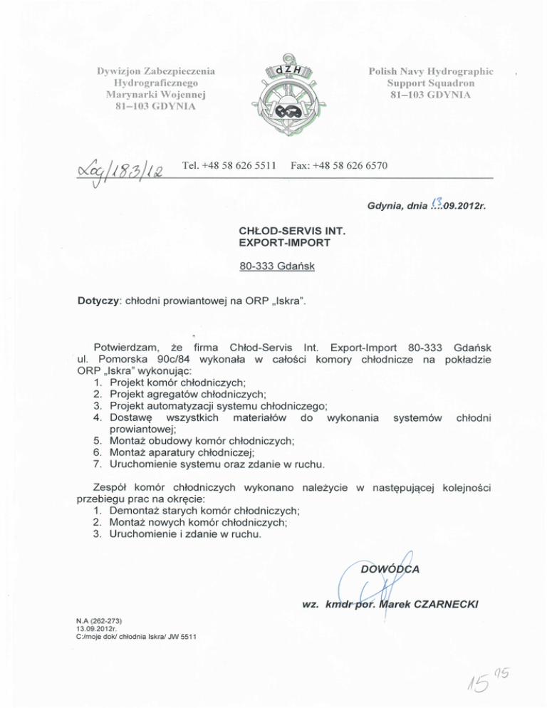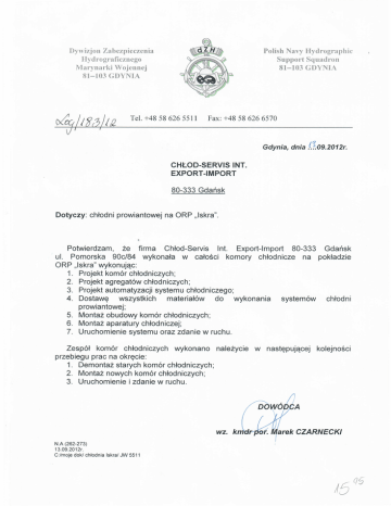 Dywizjon Zabezpieczenia Hydrograficznego lVlarynuki Wojennej 81-103 GDYNIA IQ Polish Navy Hydrographic Suppo.·t Squadron 81-103 GDYNIA Tel. +48 58 626 5511 Fax: +48 58 626 6570 Gdynia, dnia .(~()9.2012r. CHŁOD-SERVIS INT. EXPORT -IMPORT 80-333 Gdańsk Dotyczy: chłodni prowiantowej na ORP "Iskra". Potwierdzam, że firma Chłod-Servis Int. Export-Import 80-333 Gdańsk ul. Pomorska 90c/84 wykonała w całości komory chłodnicze na pokładzie ORP "Iskra" wykonując: 1. Projekt komór chłodniczych; 2. Projekt agregatów chłodniczych; 3. Projekt automatyzacji systemu chłodniczego; 4. Dostawę wszystkich materiałów do wykonania systemów chłodni prowiantowej; 5. Montaż obudowy komór chłodniczych; 6. Montaż aparatury chłodniczej; 7. Uruchomienie systemu oraz zdanie w ruchu. Zespół komór chłodniczych wykonano należycie przebiegu prac na okręcie: 1. Demontaż starych komór chłodniczych; 2. Montaż nowych komór chłodniczych; 3. Uruchomienie i zdanie w ruchu. w następującej kolejności arek CZARNECKI N.A (262-273) 13.09.2012r. C:lmoje doki chłodnia IskraI JW 5511