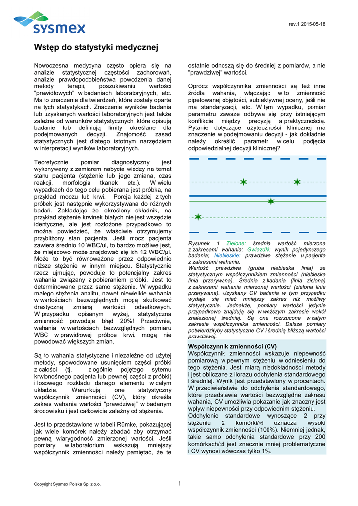 rev.1 2015-05-18 20 Wstęp do statystyki medycznej ostatnie odnoszą się do średniej z pomiarów, a nie "prawdziwej" wartości. Nowoczesna medycyna często opiera się na analizie statystycznej częstości zachorowań, analizie prawdopodobieństwa powodzenia danej metody terapii, poszukiwaniu wartości "prawidłowych" w badaniach laboratoryjnych, etc. Ma to znaczenie dla twierdzeń, które zostały oparte na tych statystykach. Znaczenie wyników badania lub uzyskanych wartości laboratoryjnych jest także zależne od warunków statystycznych, które opisują badanie lub definiują limity określane dla podejmowanych decyzji. Znajomość zasad statystycznych jest dlatego istotnym narzędziem w interpretacji wyników laboratoryjnych. Oprócz współczynnika zmienności są też inne źródła wahania, włączając w to zmienność pipetowanej objętości, subiektywnej oceny, jeśli nie ma standaryzacji, etc. W tym wypadku, pomiar parametru zawsze odbywa się przy istniejącym konflikcie między precyzją a praktycznością. Pytanie dotyczące użyteczności klinicznej ma znaczenie w podejmowaniu decyzji - jak dokładnie należy określić parametr w celu podjęcia odpowiedzialnej decyzji klinicznej? Teoretycznie pomiar diagnostyczny jest wykonywany z zamiarem nabycia wiedzy na temat stanu pacjenta (stężenie lub jego zmiana, czas reakcji, morfologia tkanek etc.). W wielu wypadkach do tego celu pobierana jest próbka, na przykład moczu lub krwi. Porcja każdej z tych próbek jest następnie wykorzystywana do różnych badań. Zakładając że określony składnik, na przykład stężenie krwinek białych nie jest wszędzie identyczne, ale jest rozłożone przypadkowo to można powiedzieć, że właściwie otrzymujemy przybliżony stan pacjenta. Jeśli mocz pacjenta zawiera średnio 10 WBC/ul, to bardzo możliwe jest, że miejscowo może znajdować się ich 12 WBC/µl. Może to być równoważone przez odpowiednio niższe stężenie w innym miejscu. Statystycznie rzecz ujmując, powoduje to potencjalny zakres wahania związany z pobieraniem próbki. Jest to determinowane przez samo stężenie. W wypadku małego stężenia analitu, nawet niewielkie wahania w wartościach bezwzględnych mogą skutkować drastyczną zmianą wartości odsetkowych. W przypadku opisanym wyżej, statystyczna zmienność powoduje błąd 20%! Przeciwnie, wahania w wartościach bezwzględnych pomiaru WBC w prawidłowej próbce krwi, mogą nie powodować większych zmian. Rysunek 1 Zielone: średnia wartość mierzona z zakresami wahania; Gwiazdki: wynik pojedynczego badania; Niebieskie: prawdziwe stężenie u pacjenta z zakresami wahania. Wartość prawdziwa (gruba niebieska linia) ze statystycznym współczynnikiem zmienności (niebieska linia przerywana). Średnia z badania (linia zielona) z zakresami wahania mierzonej wartości (zielona linia przerywana). Uzyskany CV badania w tym przypadku wydaje się mieć mniejszy zakres niż możliwy statystycznie. Jednakże, pomiary wartości jedynie przypadkowo znajdują się w węższym zakresie wokół znalezionej średniej. Są one rozrzucone w całym zakresie współczynnika zmienności. Dalsze pomiary potwierdziłyby statystyczne CV i średnią bliższą wartości prawdziwej. Współczynnik zmienności (CV) Współczynnik zmienności wskazuje niepewność pomiarową w pewnym stężeniu w odniesieniu do tego stężenia. Jest miarą niedokładności metody i jest obliczane z ilorazu odchylenia standardowego i średniej. Wynik jest przedstawiony w procentach. W przeciwieństwie do odchylenia standardowego, które przedstawia wartości bezwzględne zakresu wahania, CV umożliwia pokazanie jak znaczny jest wpływ niepewności przy odpowiednim stężeniu. Odchylenie standardowe wynoszące 2 przy stężeniu 2 komórki/µl oznacza wysoki współczynnik zmienności (100%). Niemniej jednak, takie samo odchylenia standardowe przy 200 komórkach/µl jest znacznie mniej problematyczne i CV wynosi wówczas tylko 1%. Są to wahania statystyczne i niezależne od użytej metody, spowodowane usunięciem części próbki z całości (tj. z ogólnie pojętego sytemu krwionośnego pacjenta lub pewnej części z próbki) i losowego rozkładu danego elementu w całym układzie. Warunkują one statystyczny współczynnik zmienności (CV), który określa zakres wahania wartości "prawdziwej” w badanym środowisku i jest całkowicie zależny od stężenia. Jest to przedstawione w tabeli Rümke, pokazującej jak wiele komórek należy zbadać aby otrzymać pewną wiarygodność zmierzonej wartości. Jeśli pomiary w laboratorium wskazują mniejszy współczynnik zmienności należy pamiętać, że te Copyright Sysmex Polska Sp. z o.o. 1 rev.1 2015-05-18 20 a 1 2 3 4 5 6 7 8 9 10 n=100 0-4 0-6 0-9 1-10 1-12 2-13 2-14 3-16 4-17 4-18 n=500 0-1 0-3 1-5 2-7 3-8 4-9 4-10 5-11 6-12 7-13 Właściwe pytanie diagnostyczne redukowane jest do wyrażeń przeciwstawnych "chory - zdrowy" lub "terapia przynosi efekty - terapia nie przynosi efektów". Decyzja ta jest oparta na pewnych wartościach granicznych, tak zwanych zakresach decyzyjności lub punktach odcięcia (ang. cut-off). Określenie jakości testu, odbywa się przez porównywanie z przyjętymi badaniami, na przykład ze "złotym standardem" (czyli rzekomo najlepszą dostępną metodą) lub z metodą referencyjną, czyli metodą która została oficjalnie uznana jako standard w określaniu danych parametrów. n=1000 0-1 0-2 2-5 2-6 3-7 4-8 5-9 6-10 7-11 8-13 Tabela 1 Wycinek z tabeli Rümke przedstawiający 95% współczynniki zmienności dla podanych całkowitych liczb zliczonych komórek. a = znaleziony procentowy wskaźnik populacji; n = liczba zliczonych komórek; X-Y = 95% przedział ufności wyniku. Oznacza to, że wynik będzie się mieścić w tym zakresie w 95% przypadków, poniżej w 2,5% przypadków oraz powyżej w 2,5% przypadków. Na przykładzie manualnego różnicowania 100 WBC, oznacza to, że prawdziwa wartość w 95% zliczeń m